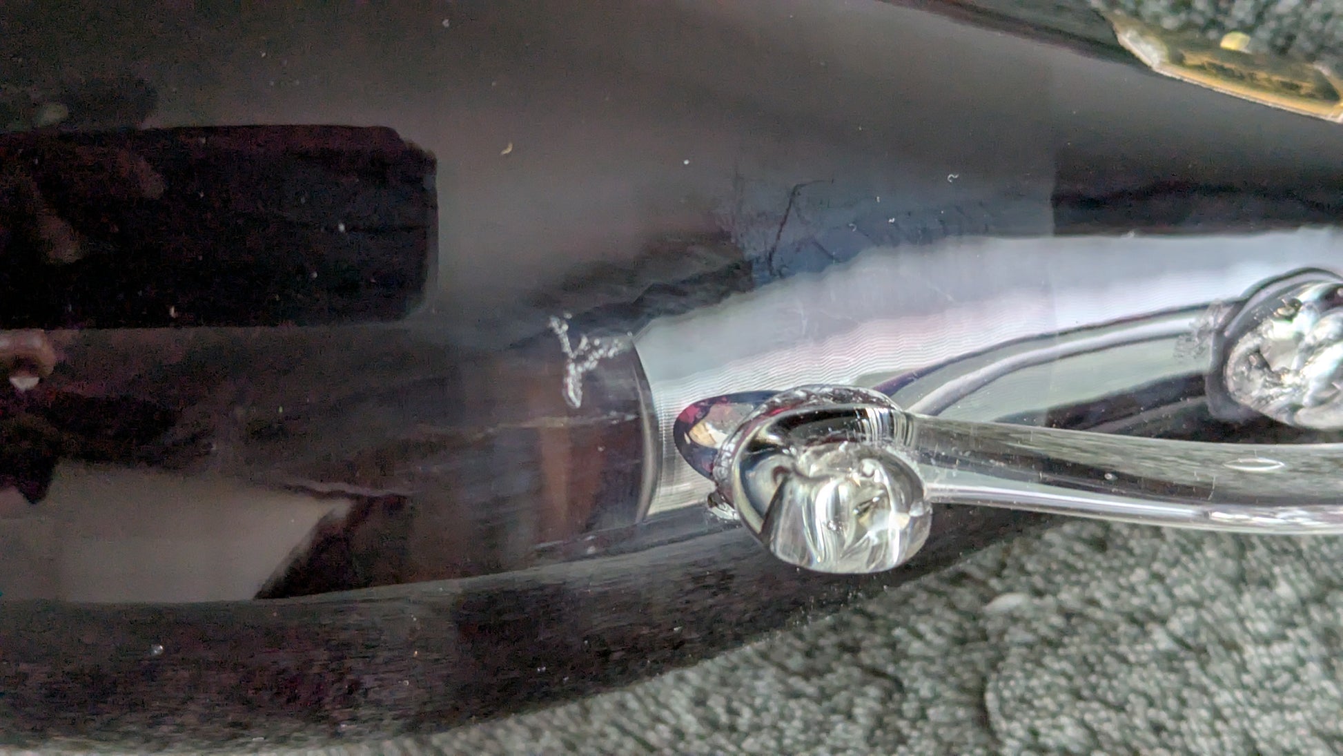 Ei iskemiä tai halkeamia. Pohjassa ei naarmuja mutta kirkkaan kahvan alapuolella viimeisen kuvan mukainen naarmuuntuma.