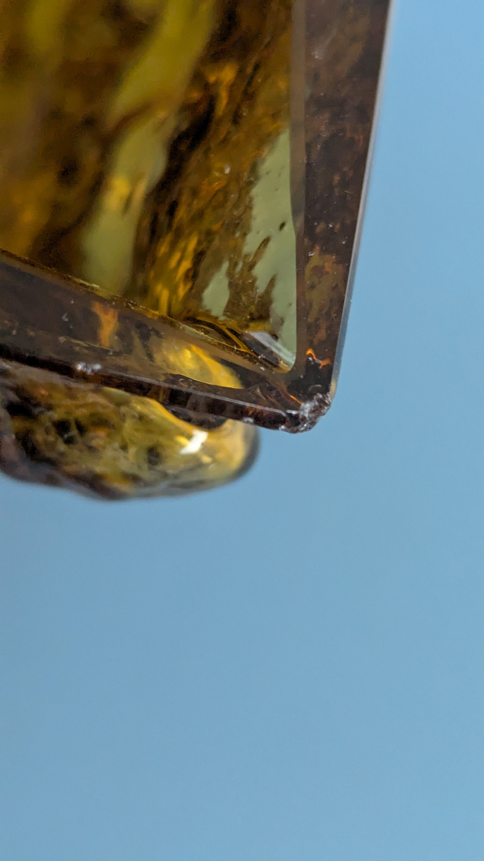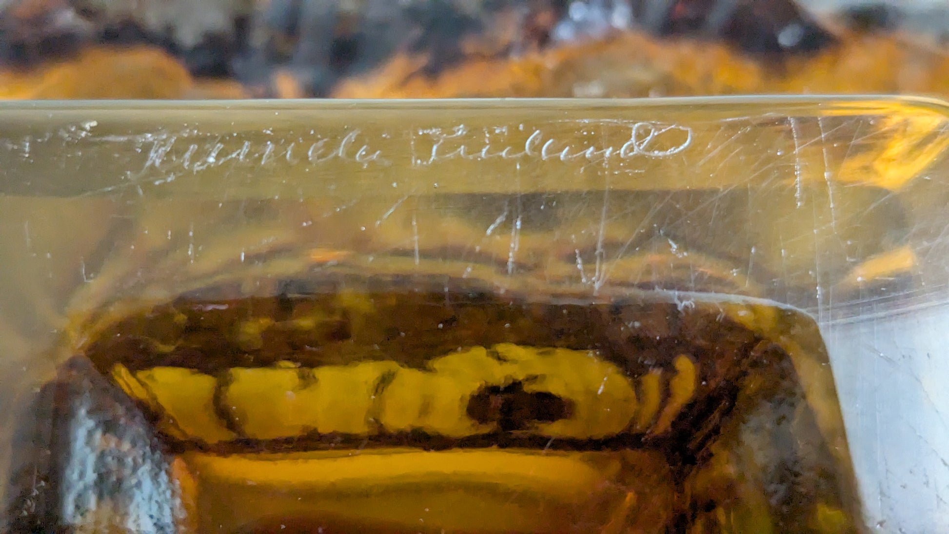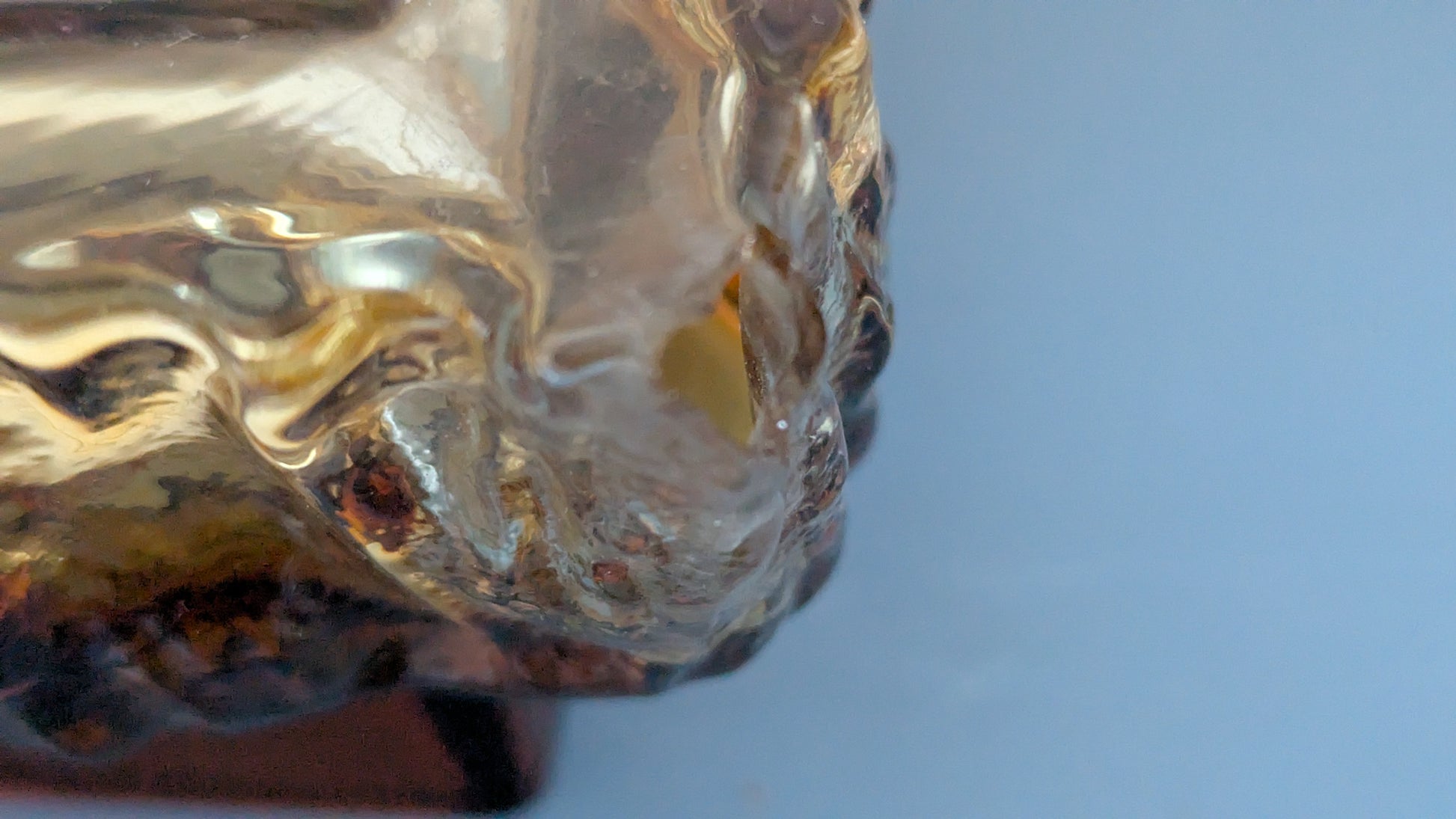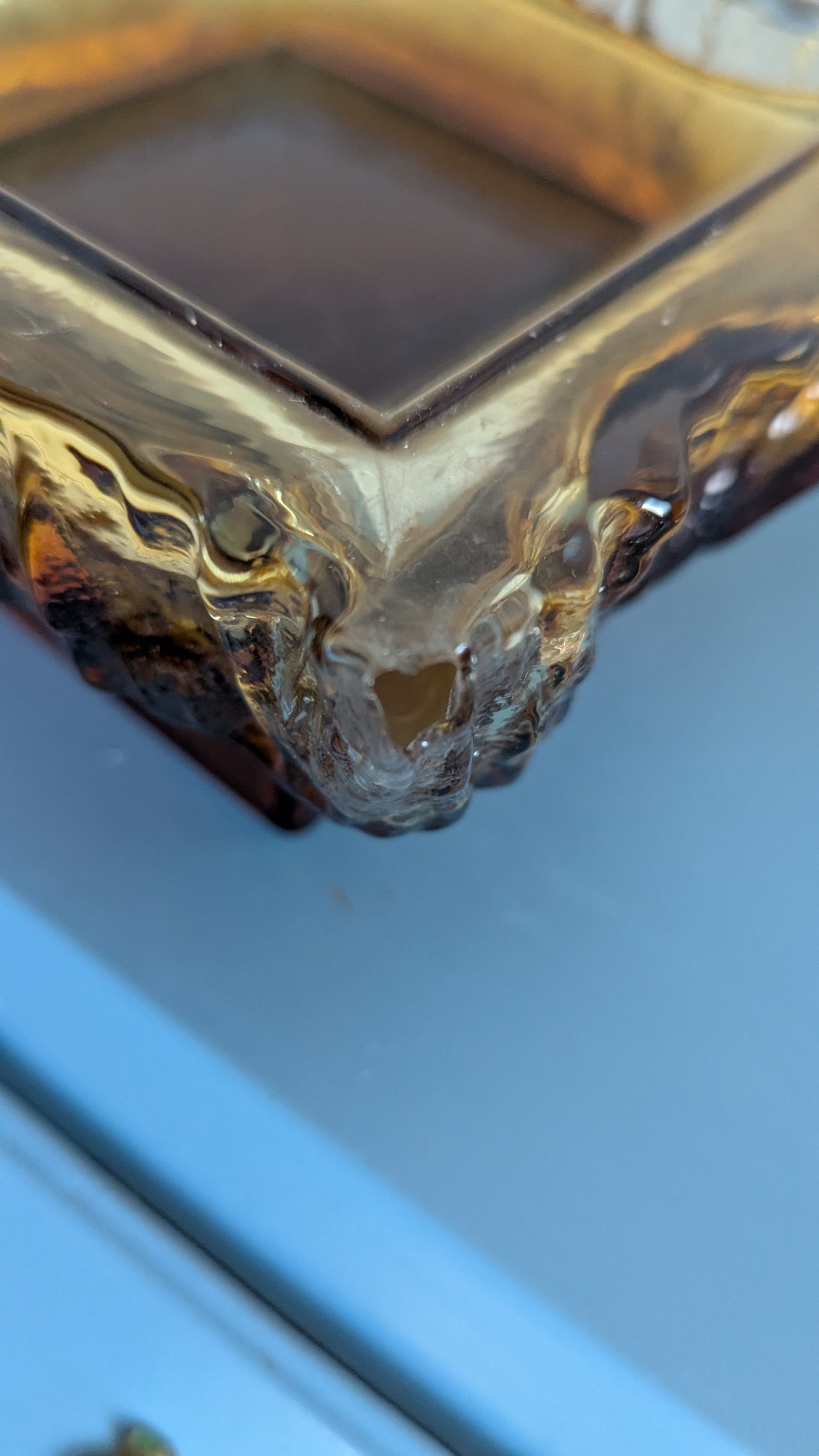 Ei halkeamia. Sekä ylä- että alaosan pohjassa naarmuja siirtelystä. Kaksi alaosan kulmaa ottanut osumaa niin että kulmasta lähtenyt pala pois ja sieltä paistaa ontto sisäosa. Myös yläosan kulmassa iskemä. Viat näkyvät kolmessa viimeisessä kuvassa. Maljakon muotojen takia nuo eivät pomppaa silmään kuin vasta lähemmässä tarkastelussa.
