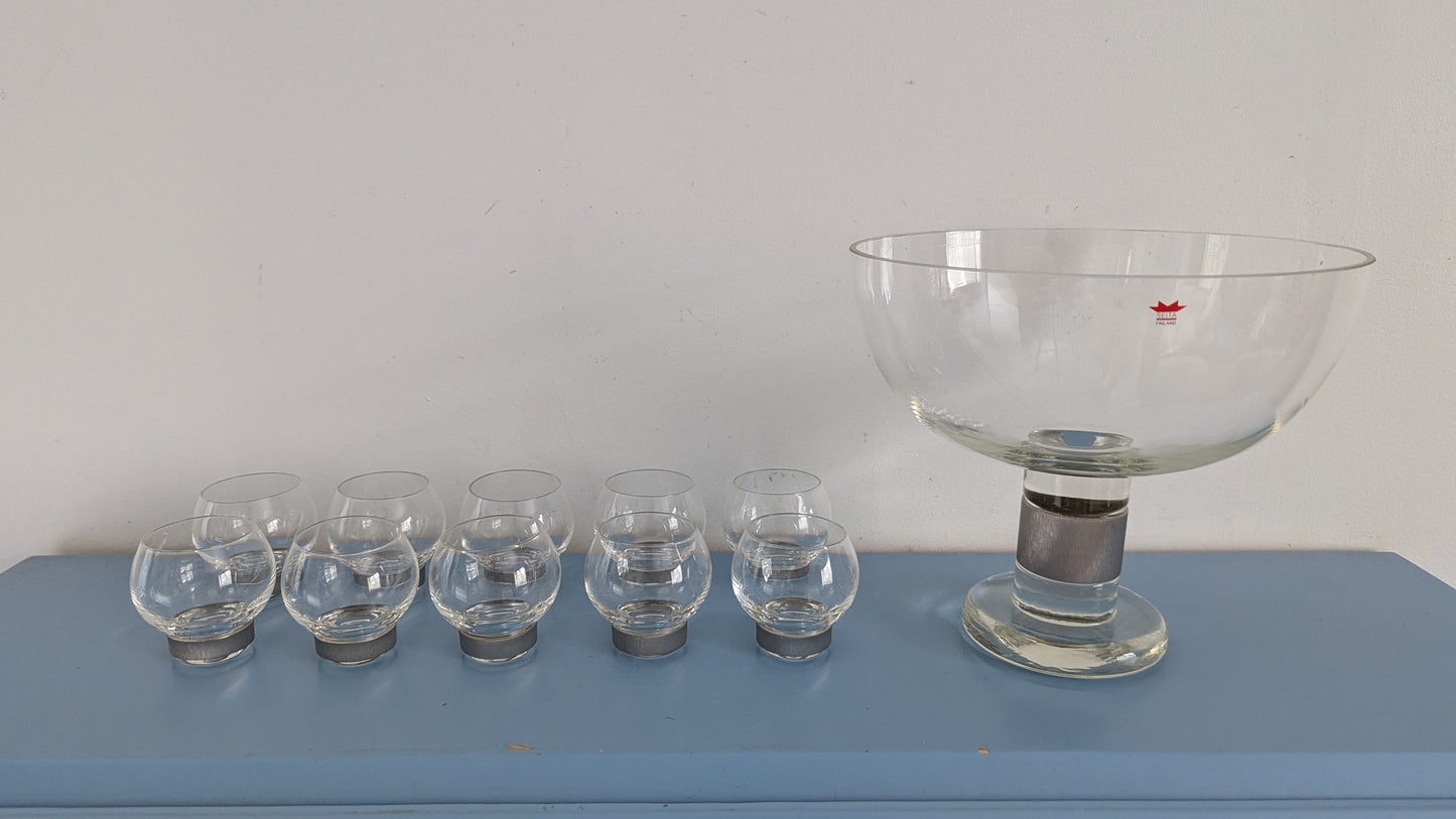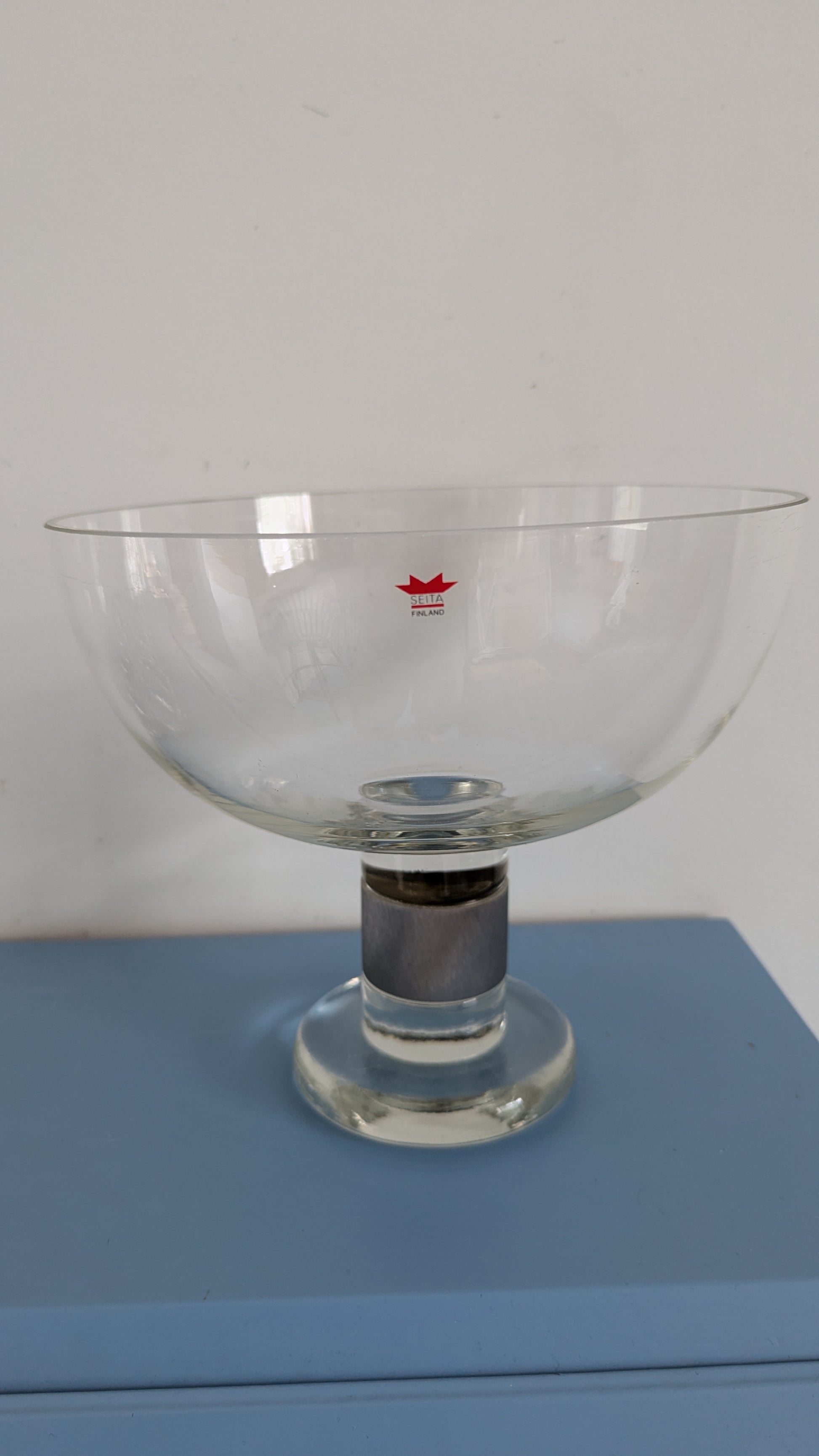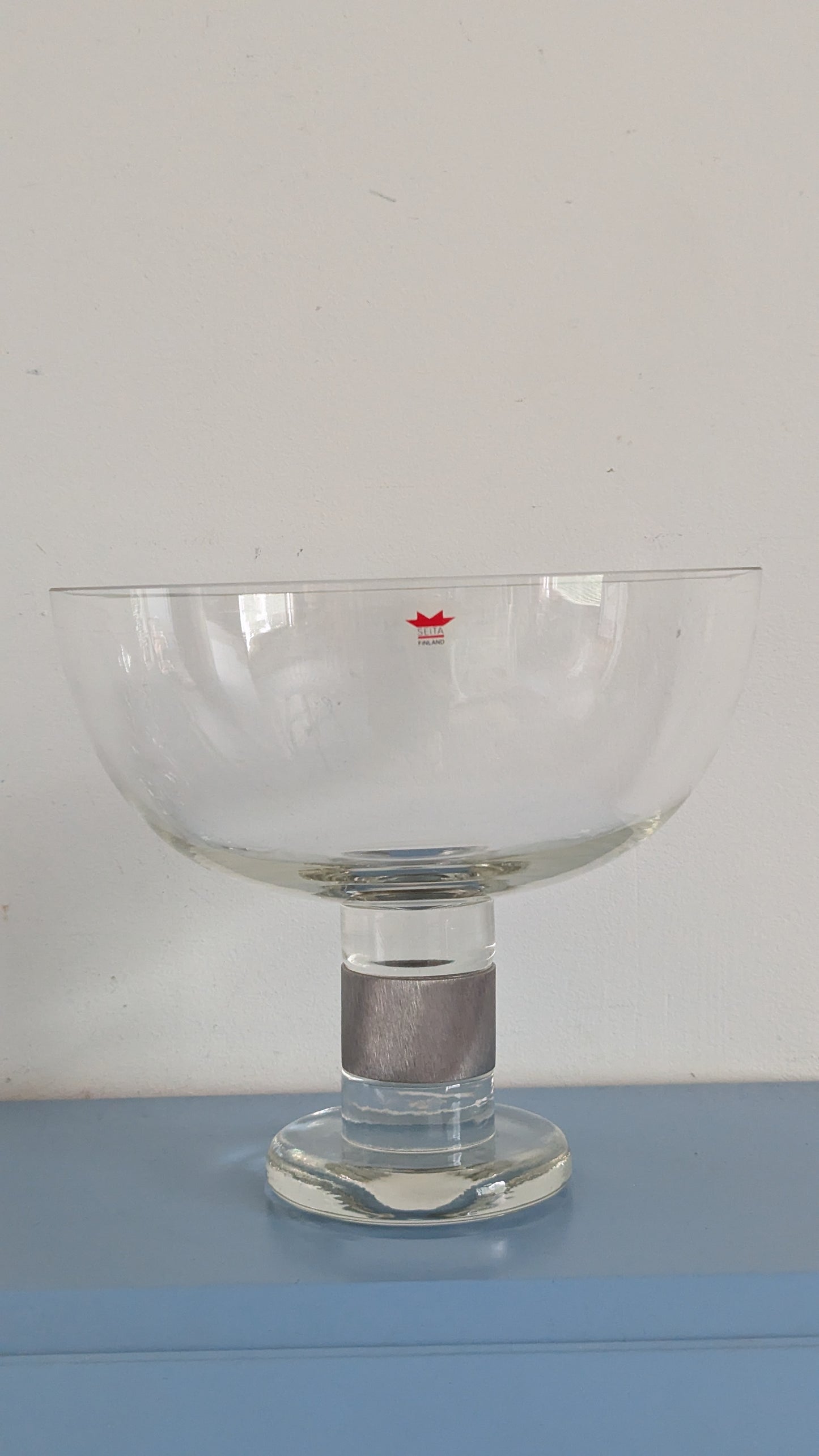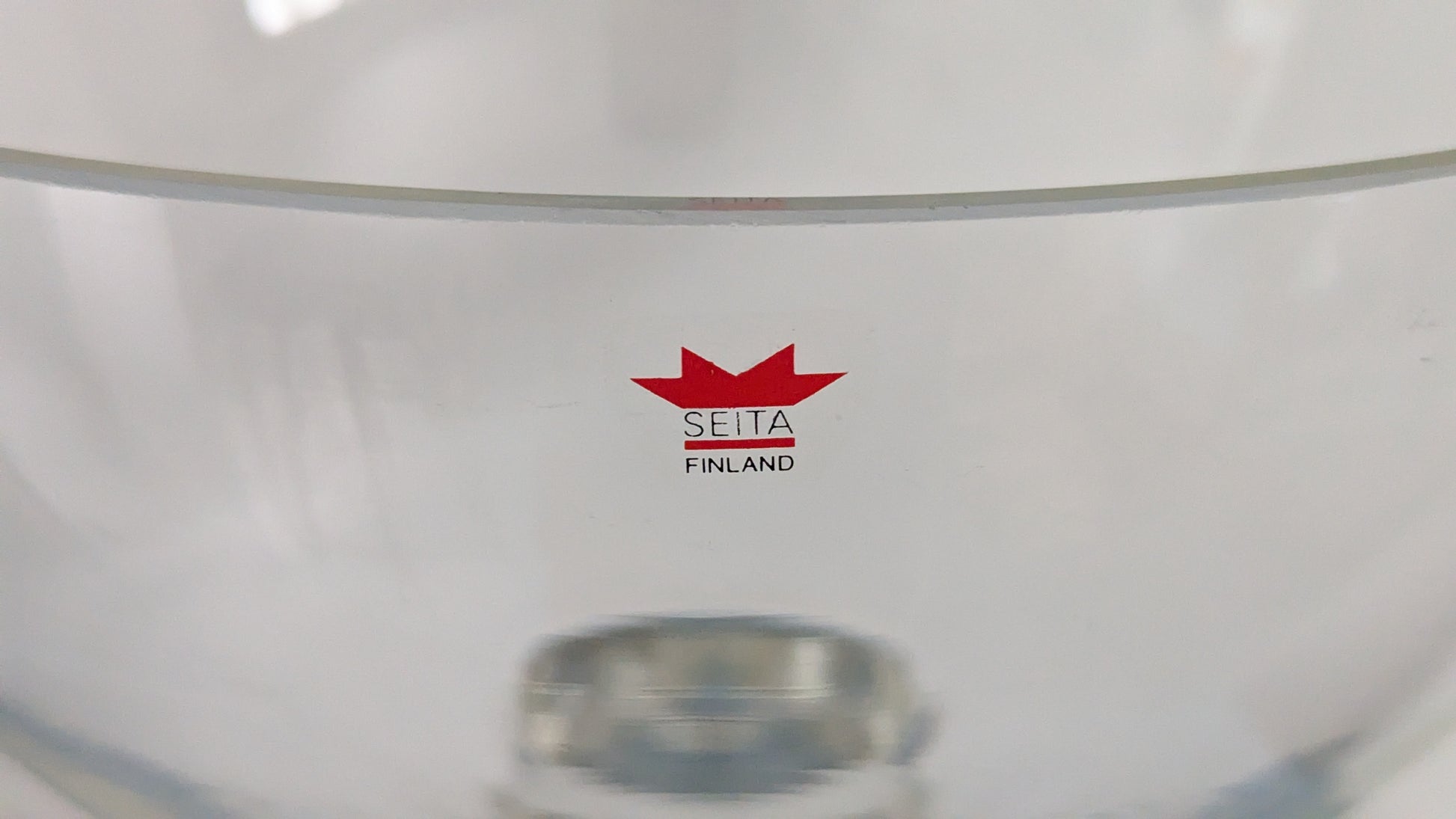 Laseissa ja maljassa harjattu jaloteräsvanne jalan ympärillä. Maljakossa vielä Seita tarra paikalla. Ei iskemiä tai halkeamia. Maljan pohjassa vähäistä naarmua siirtelystä. Muuten käyttökulumaa ei ole tai se on minimaalista.