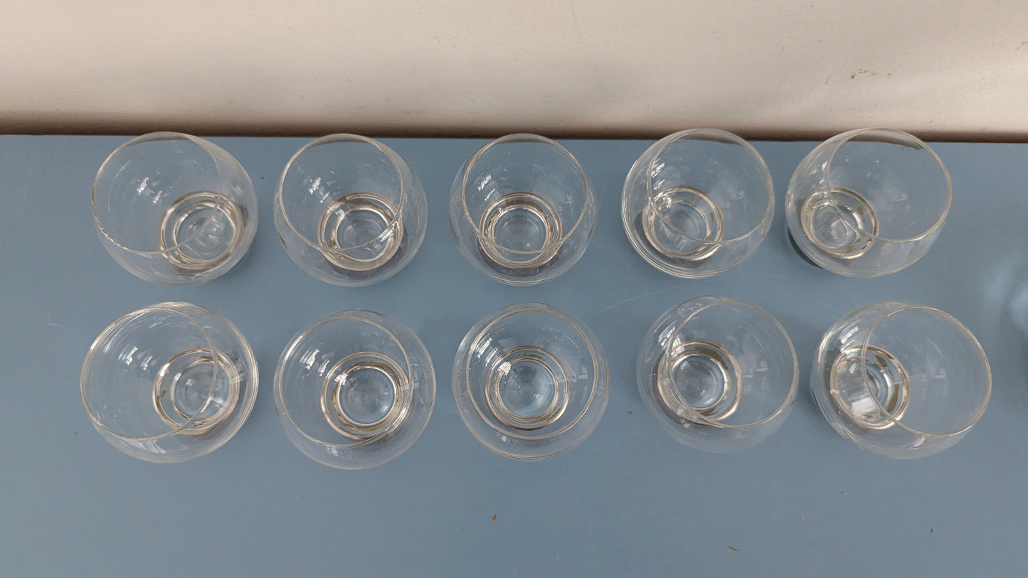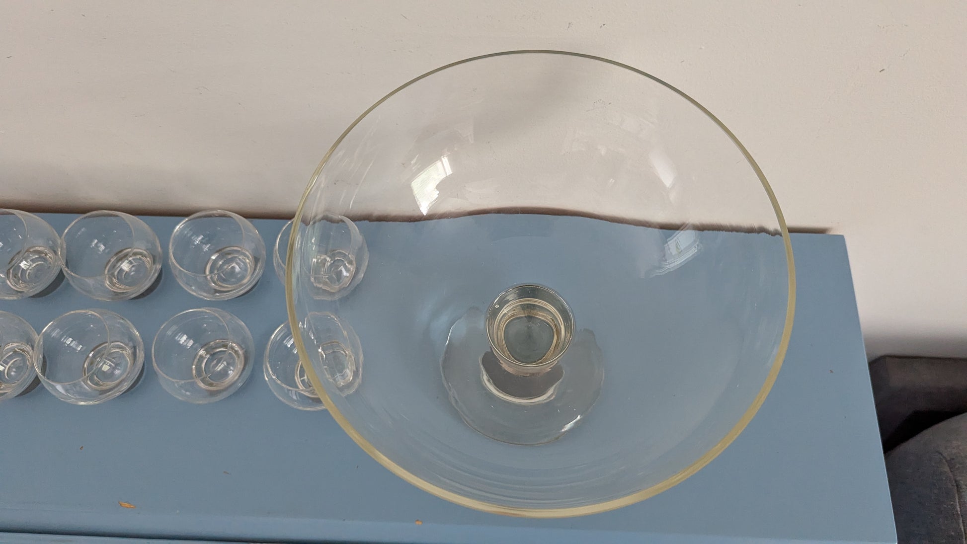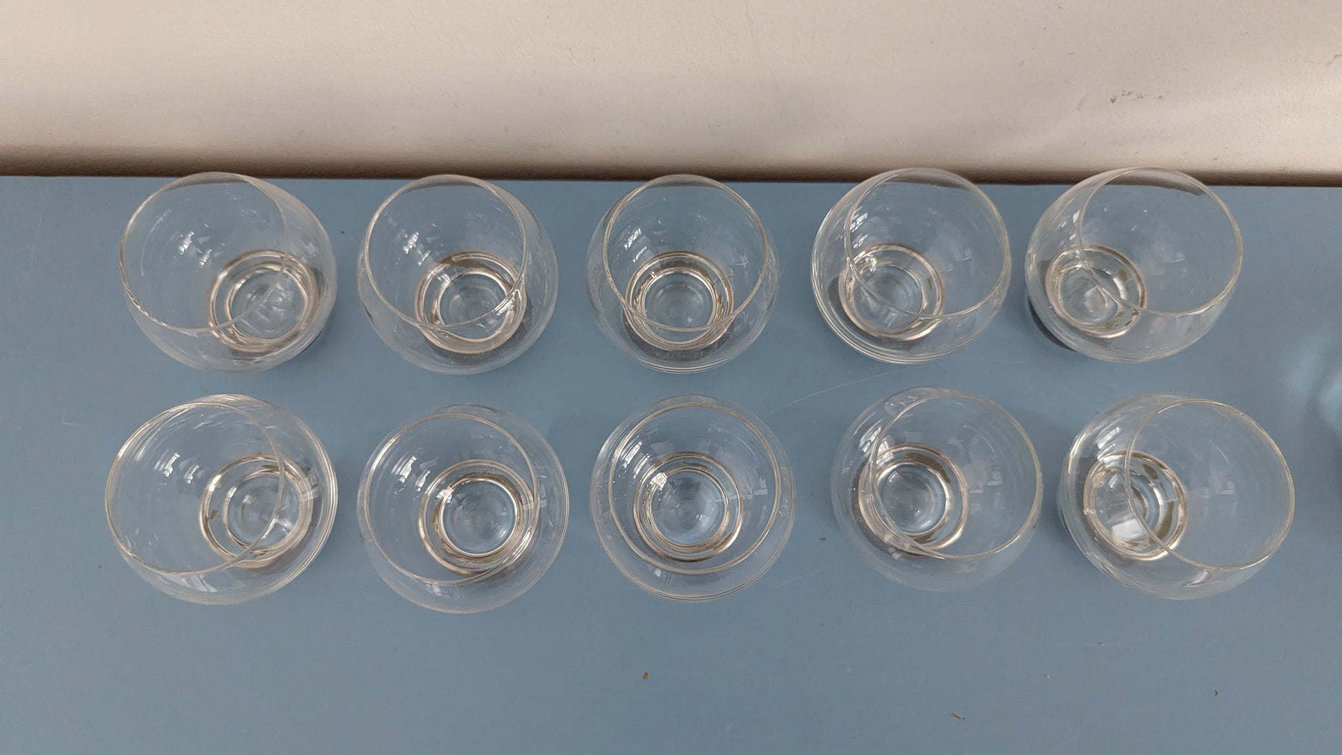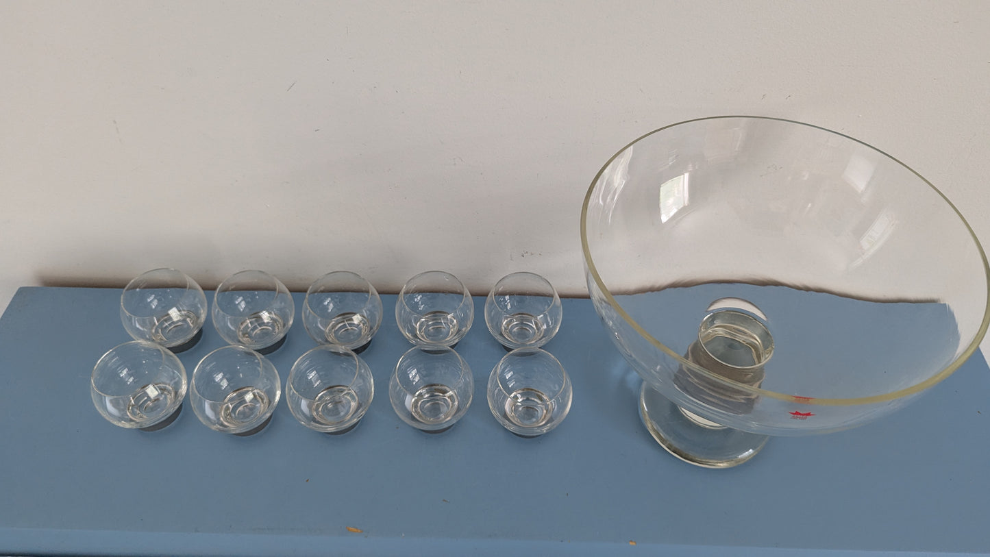 Laseissa ja maljassa harjattu jaloteräsvanne jalan ympärillä. Maljakossa vielä Seita tarra paikalla. Ei iskemiä tai halkeamia. Maljan pohjassa vähäistä naarmua siirtelystä. Muuten käyttökulumaa ei ole tai se on minimaalista.