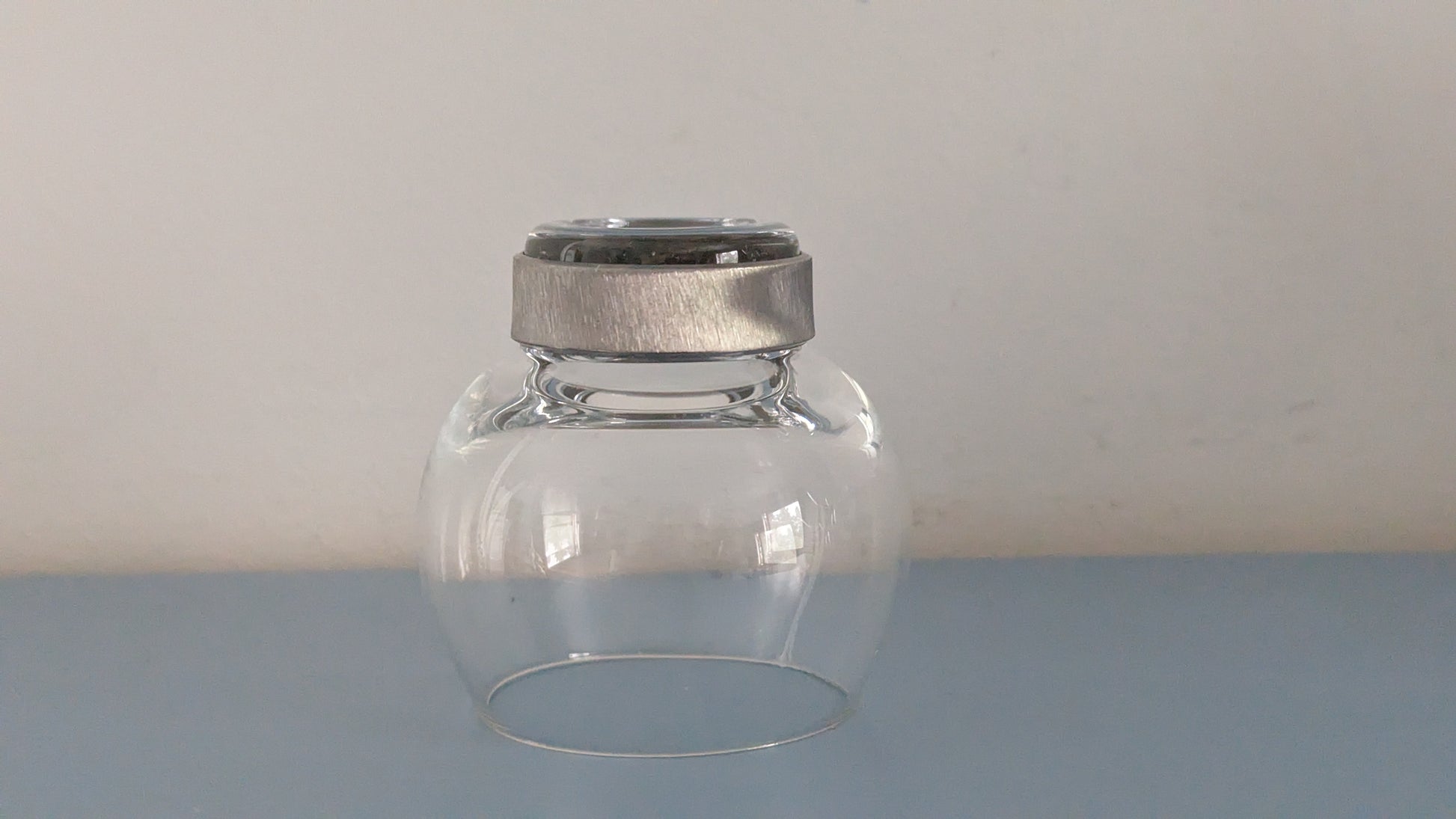 Materiaali: Pyörittäen puhallettu lasi ja harjattu jaloteräs vanne