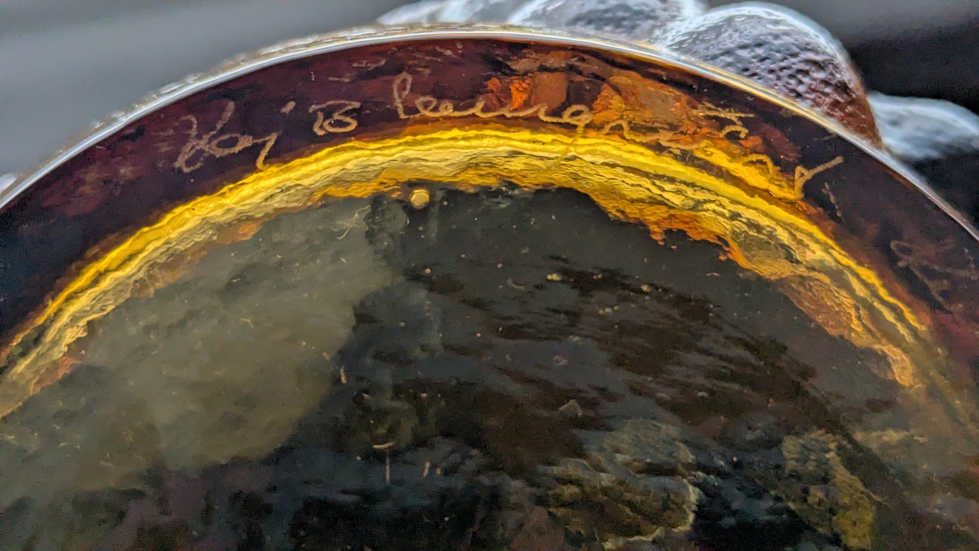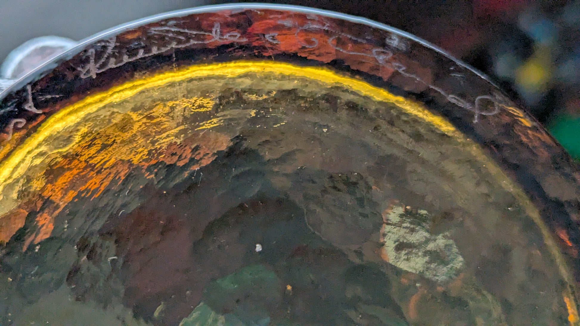 Tarra paikalla mutta siinä kulumaa. Ei iskemiä tai halkeamia. Pohjassa pientä naarmua siirtelystä.