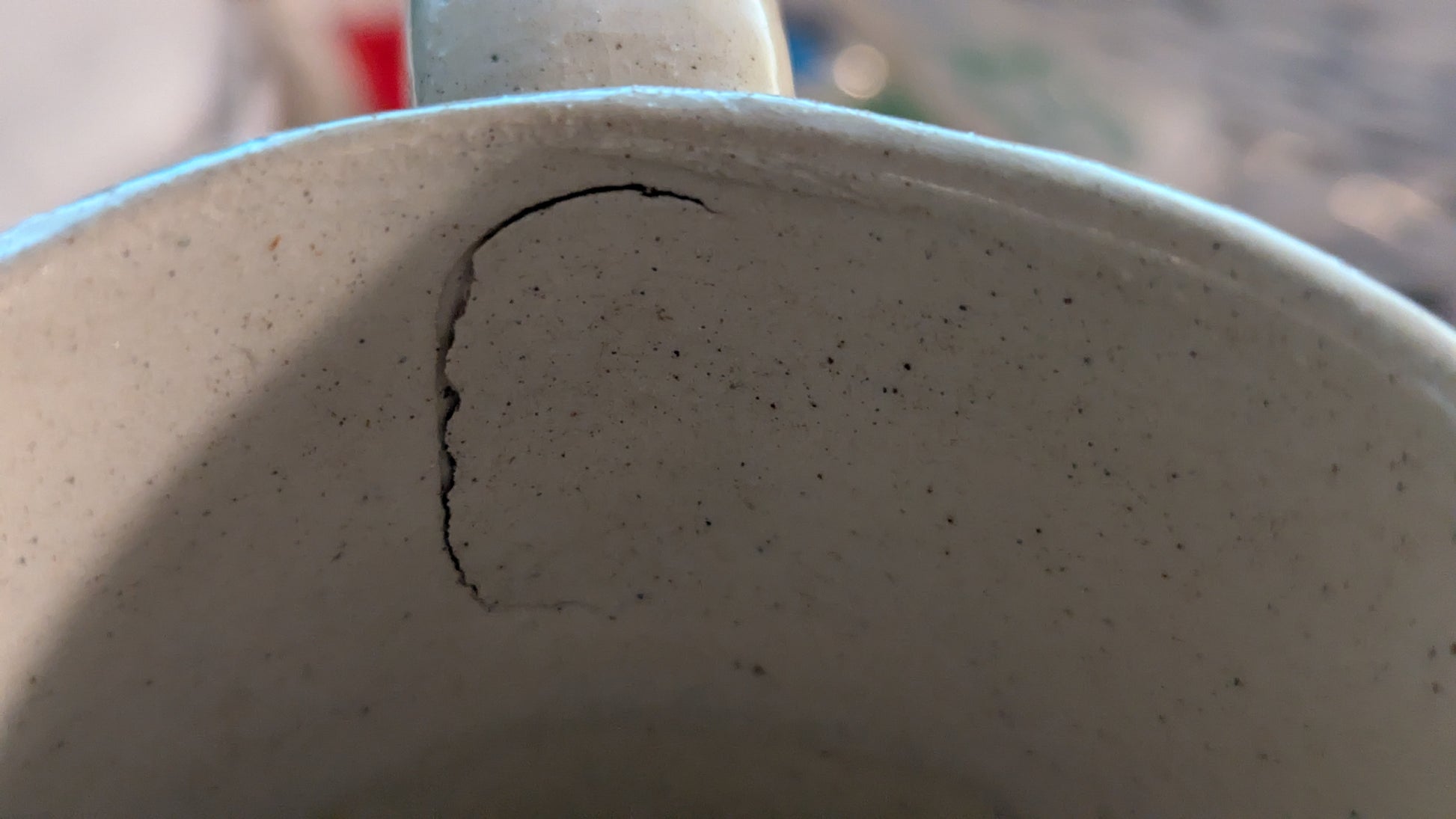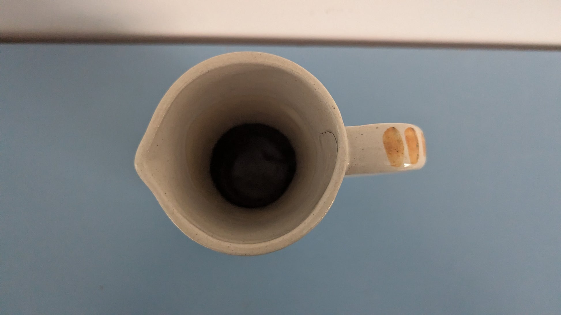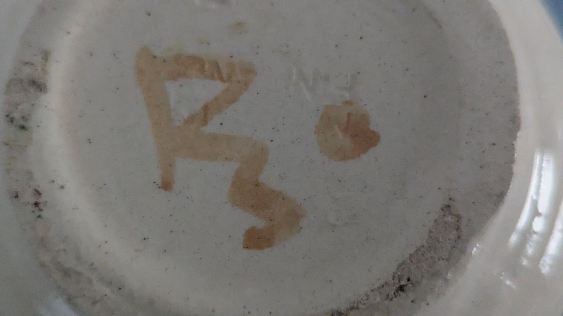 Ei iskemiä tai naarmuja. Koriste säilynyt hyvänä. Sisäpuolella kahvan kohdalla tekovirhe eli viimeisen kuvan mukainen halkeama. Toisella puolen tuota ei näy.