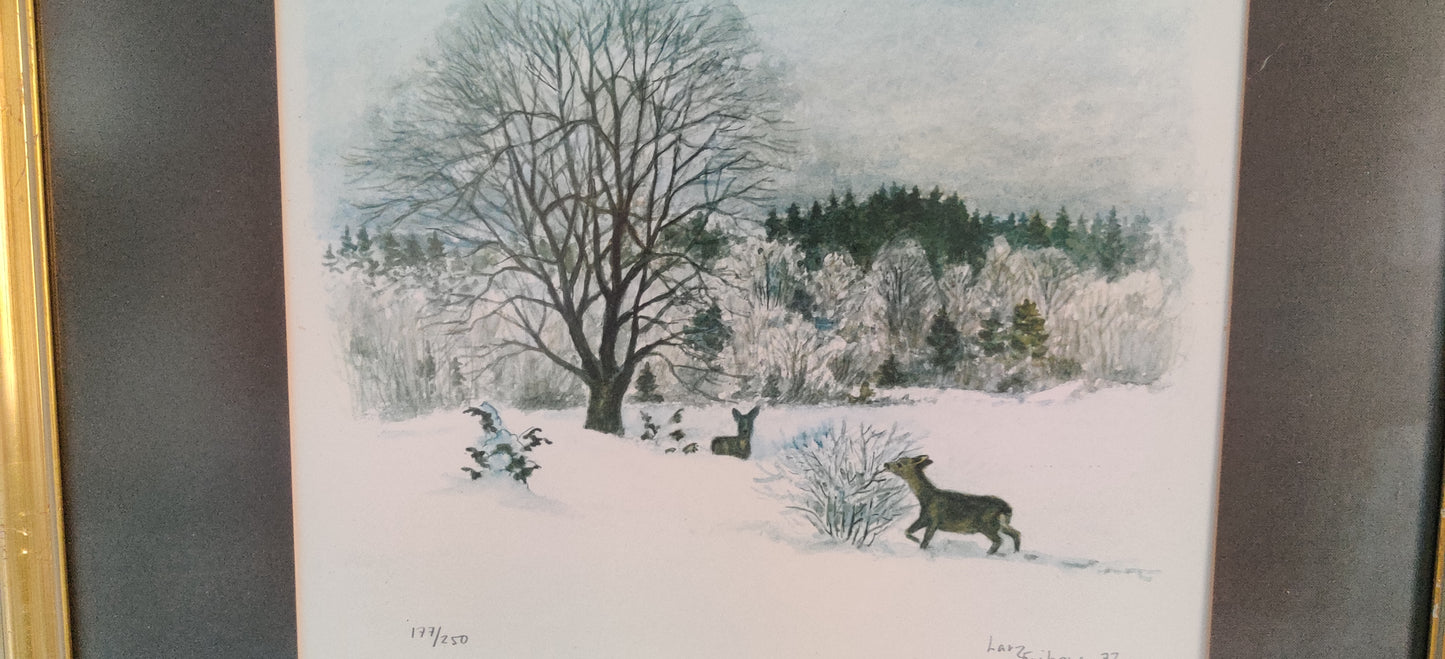 Larz Fribergin signeeraama ja numeroima riekko aiheinen grafiikka vuodelta 1977.