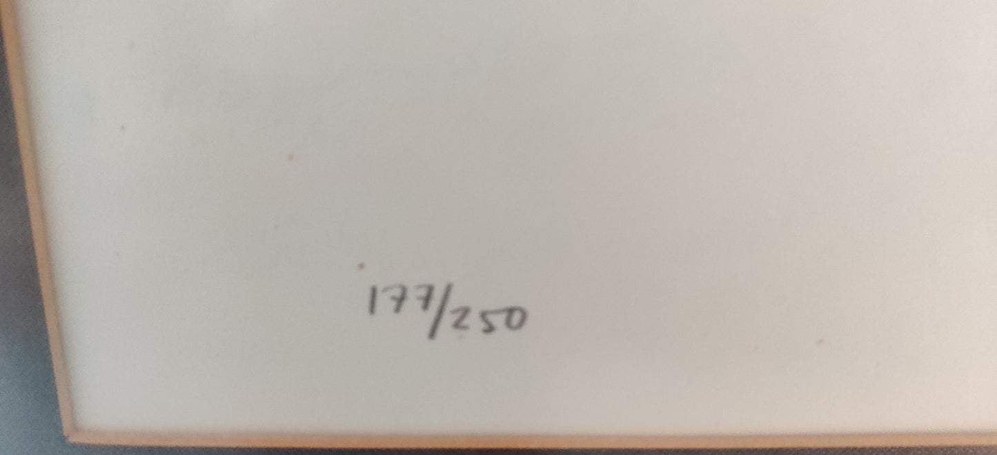 Teoksen alla numerointi 177/250 sekä signeeraus ja vuosiluku -77.