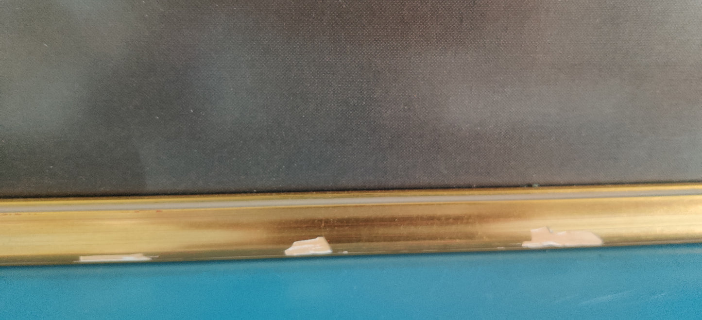Kehyksissä lasi. Kehysten alaosassa maalilohkeamaa, mikä näkyy viimeisessä kuvassa. On keskeltä oikeaan laitaan asti niin että puuttuu paloja samanlailla kuin kuvassa.