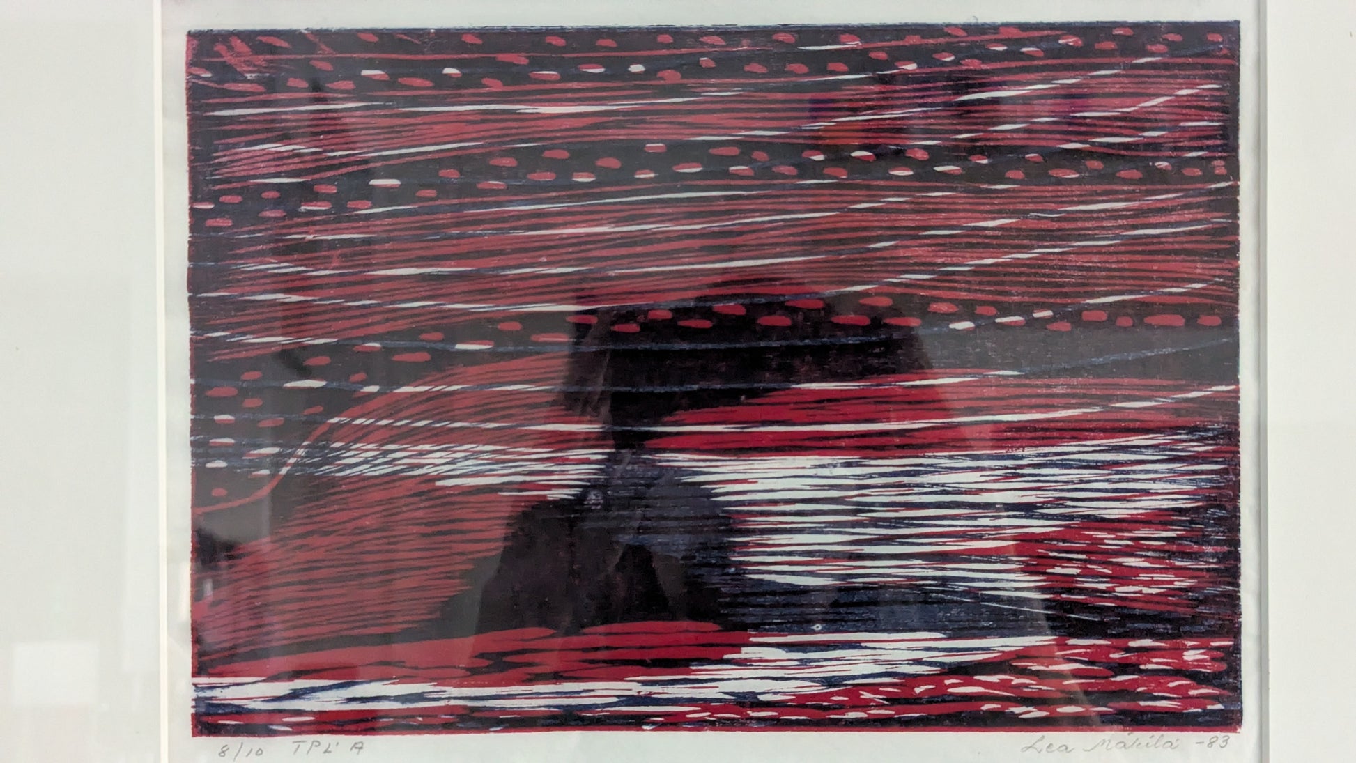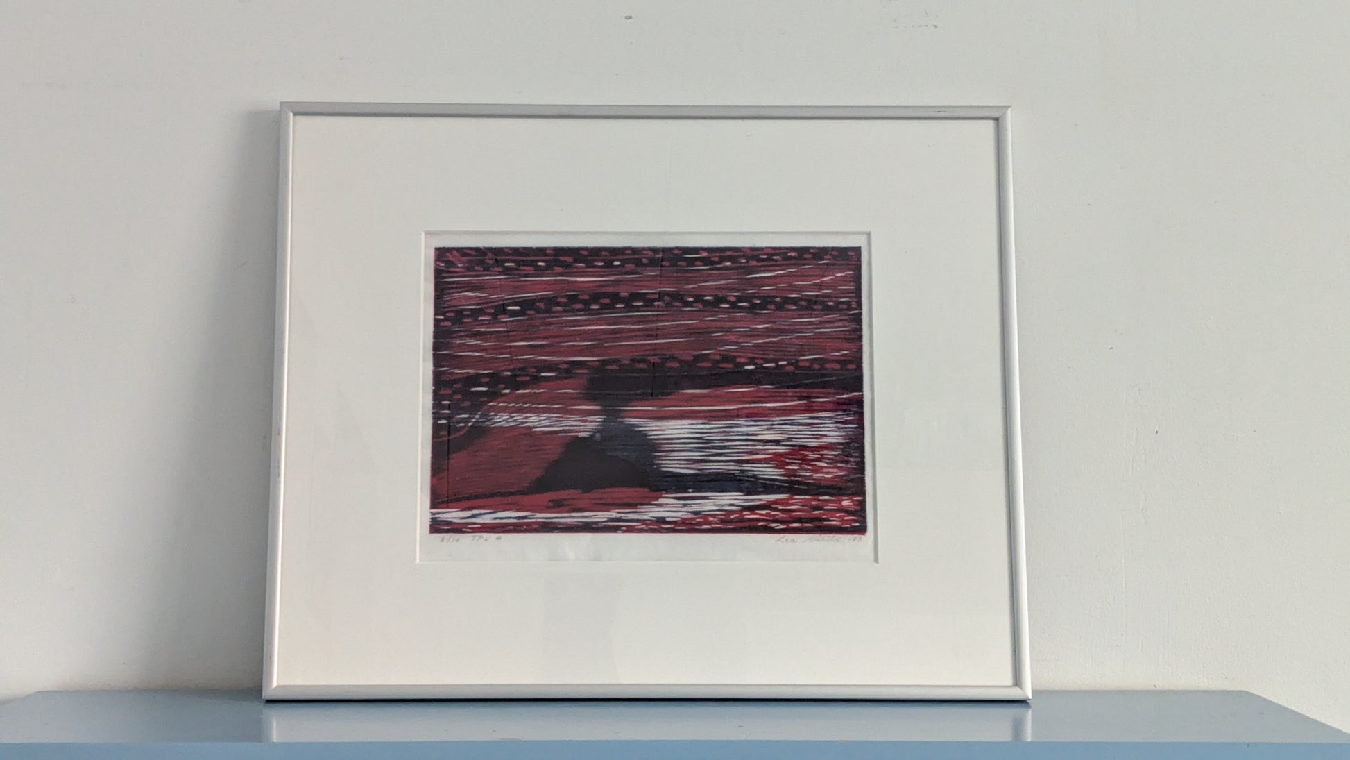 Lea Mäkilä signeeraama Tummeneva Ilta niminen väripuupiirros vuodelta 1983.