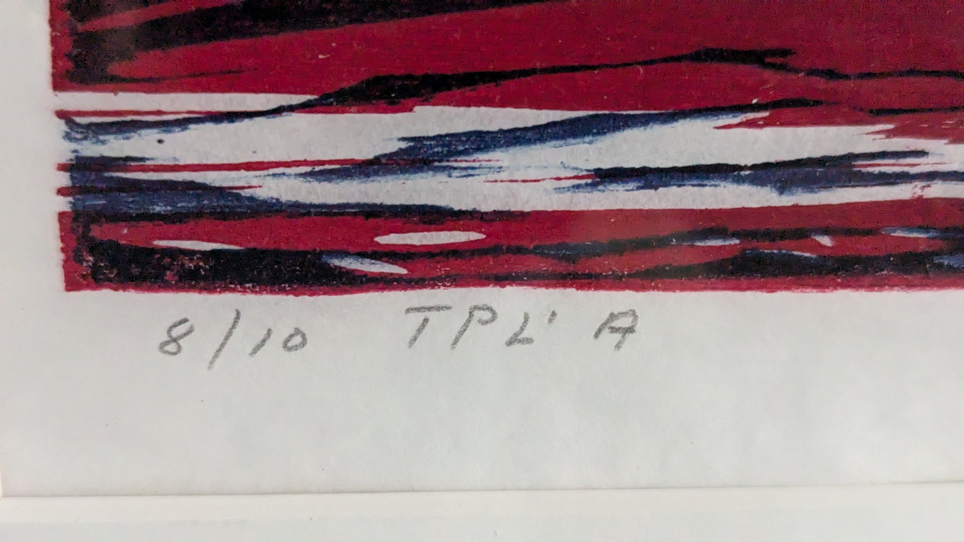 Teoksen alla vedosmerkintä Tpl'a eli kyseessä taiteilijan itsensä tekemä vedos. Lisäksi numerointi 8/10, taiteilijan signeeraus ja vuosiluku -83.