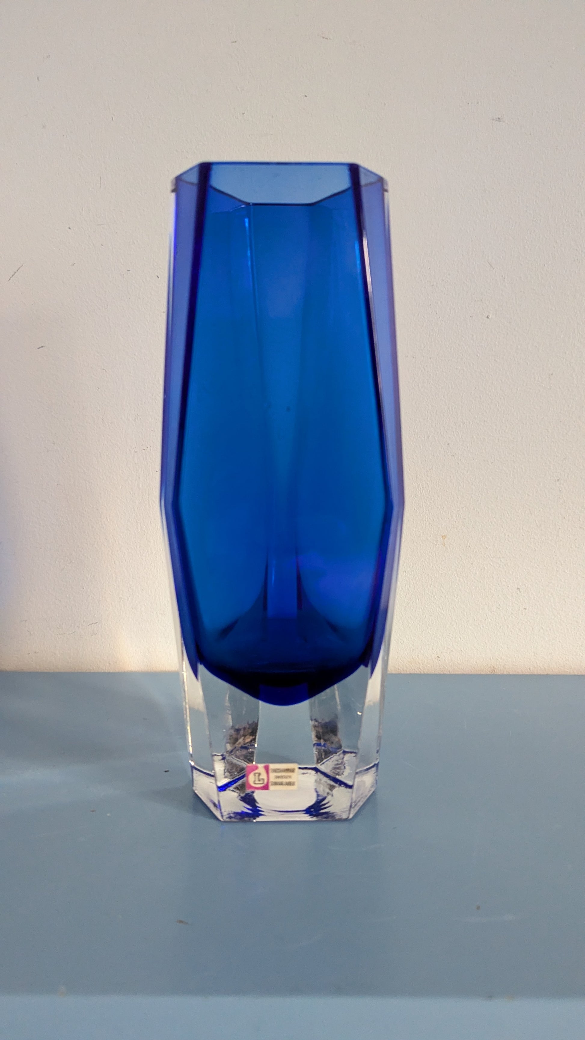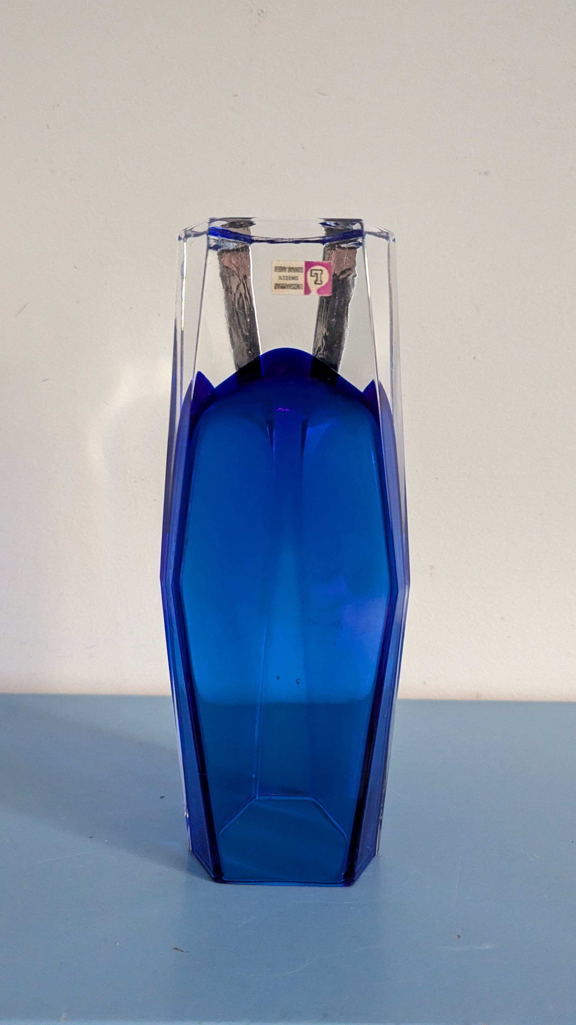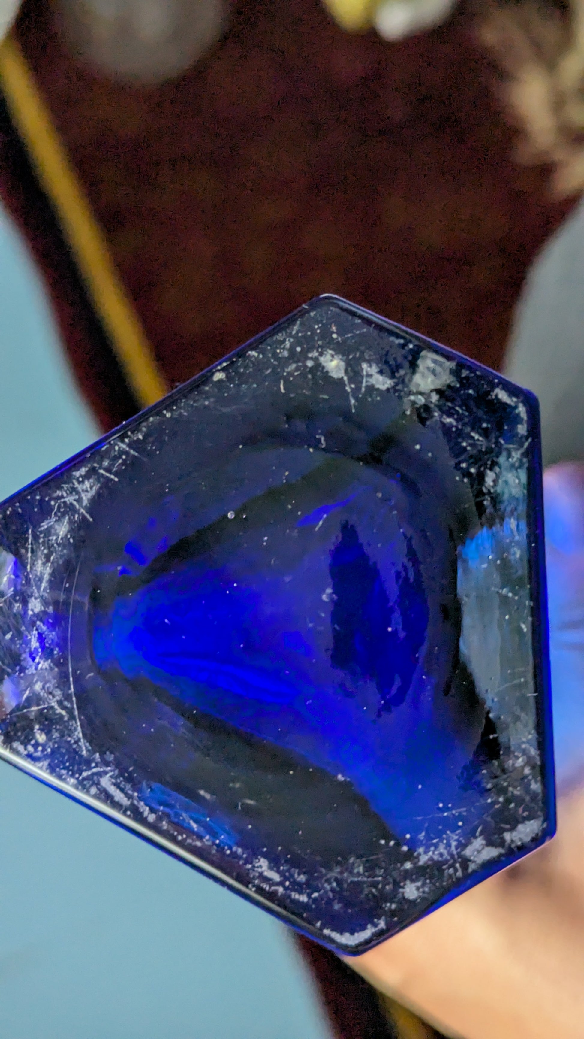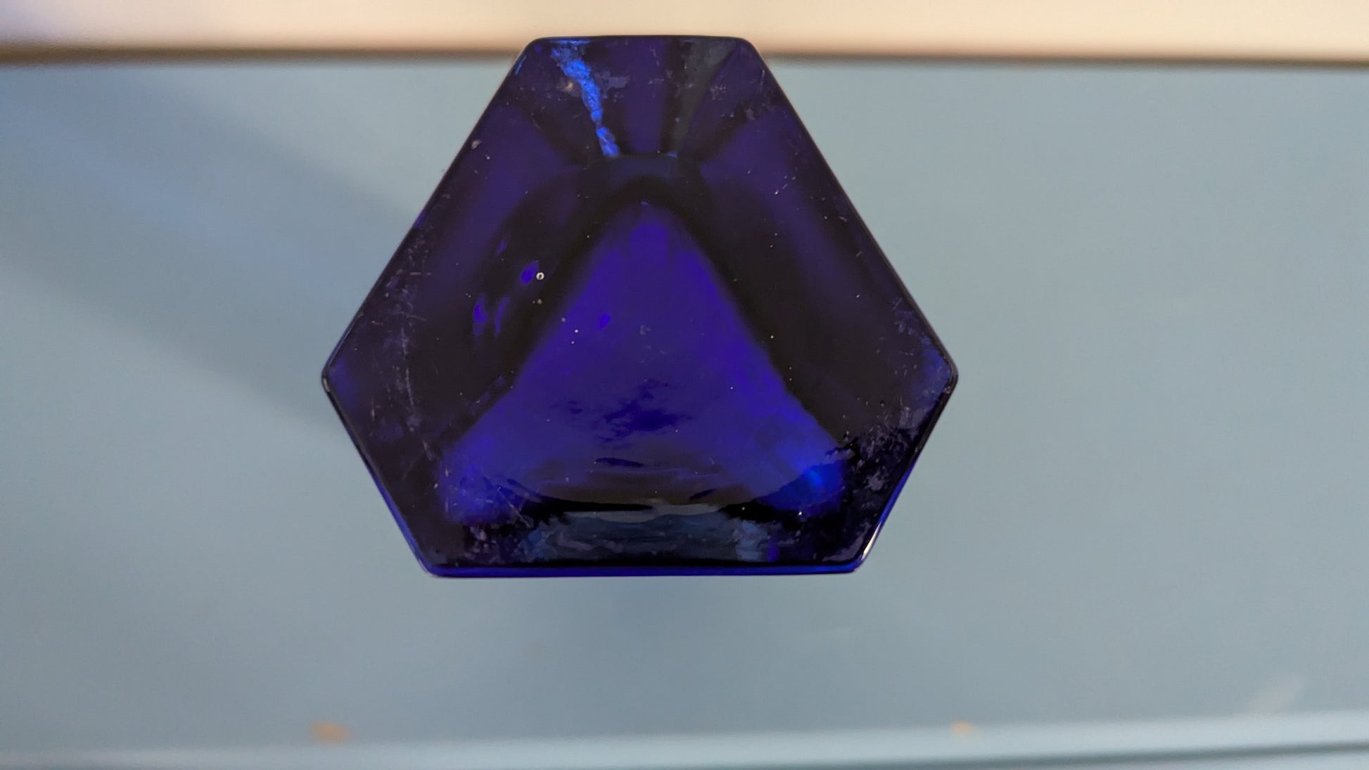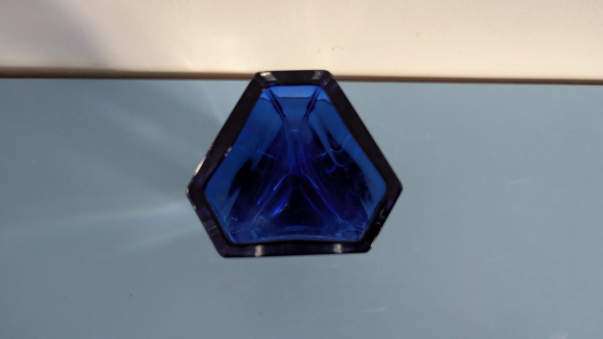 Valmistettu todennäköisesti 1960-1970-luvulla. Väriltään sininen mutta pohja paksua kirkasta lasia.