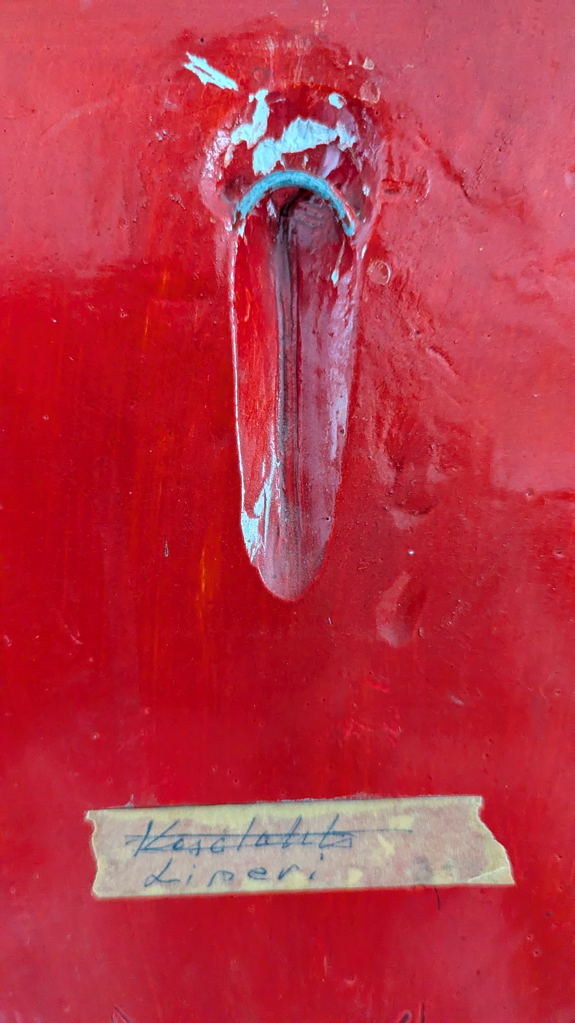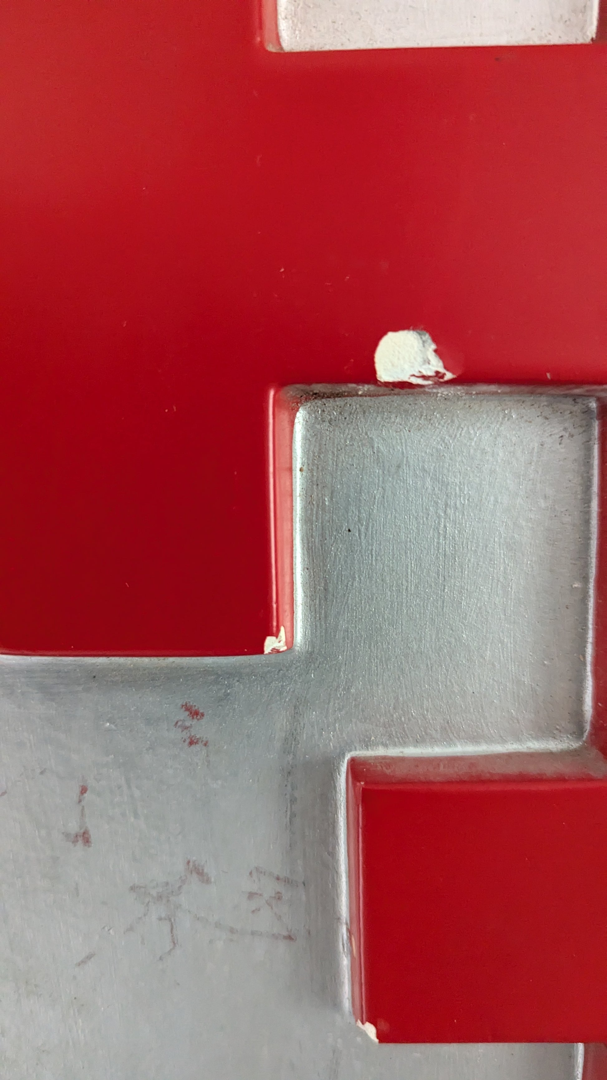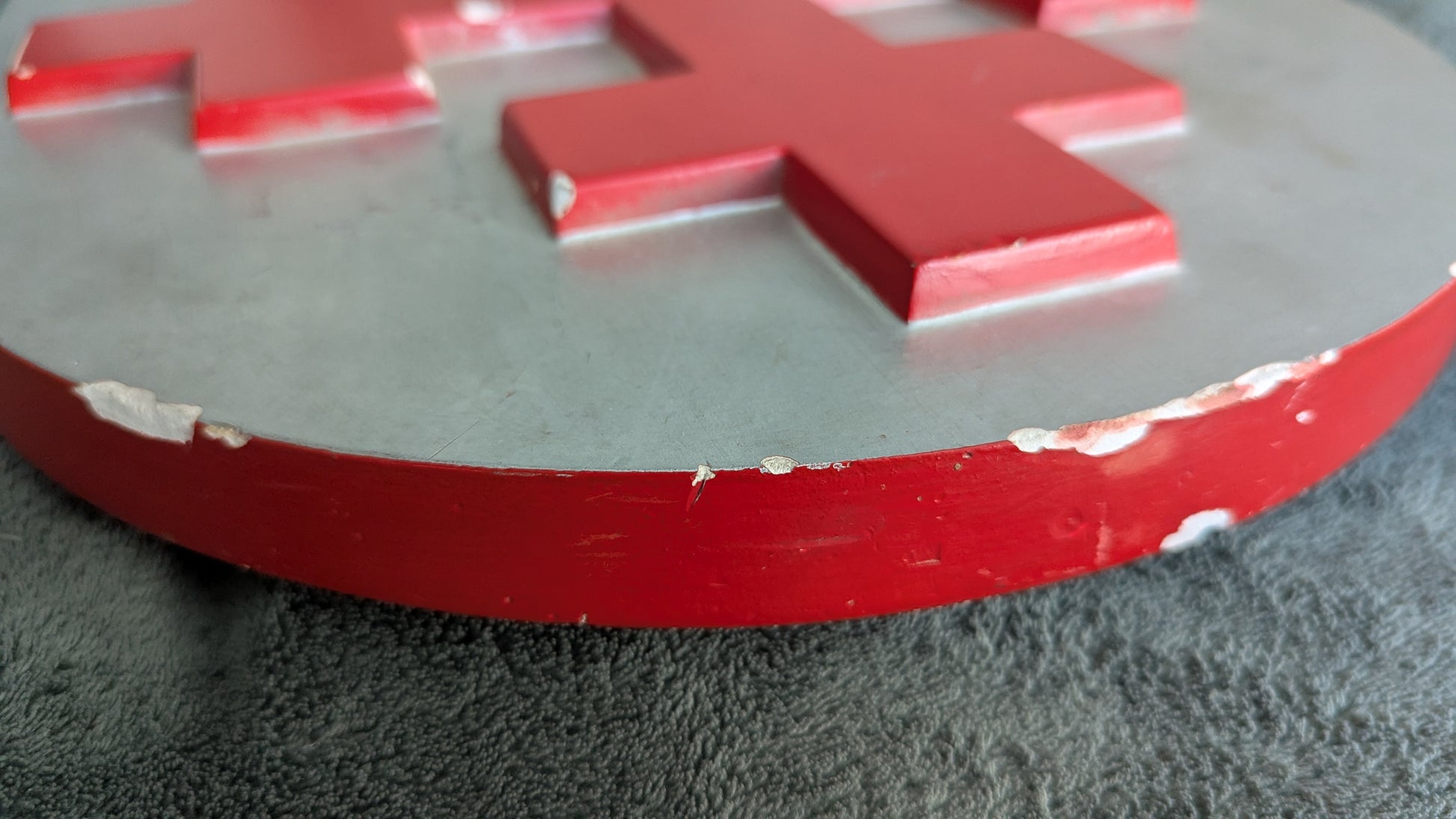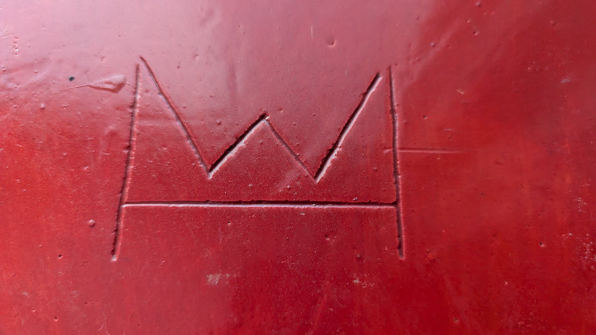Etupuolella yksi iskemä, mikä näkyy viimeisessä kuvassa. Reunoilla useampia. Osa niistä näkyy toiseksi viimeisessä kuvassa. Takana jonkinlainen logo. Onko sitten tekijän logo?