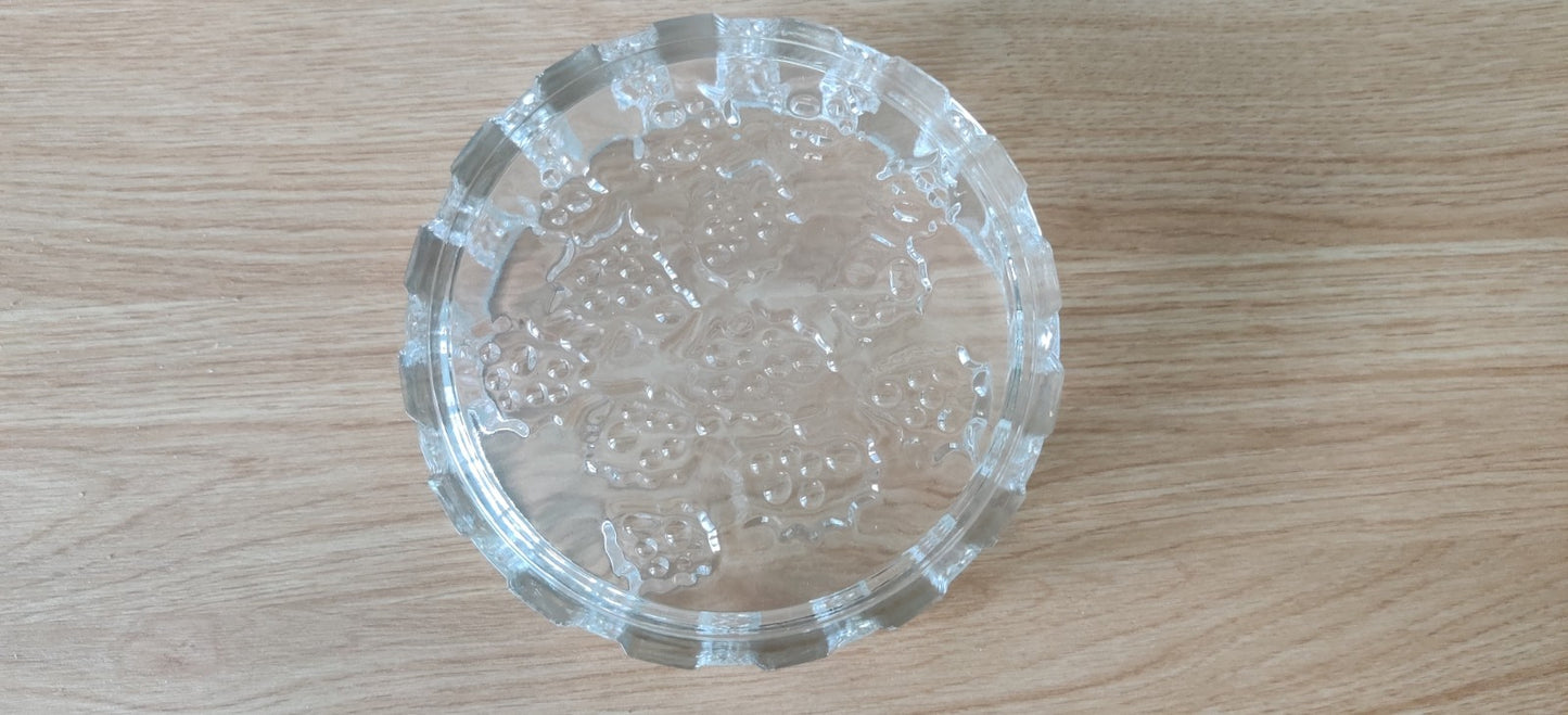 Pohjassa muutama pieni iskeymä ja suuaukon sisä- ja ulkopuolella parissa kohtaa karheumaa. Ei naarmuja.
