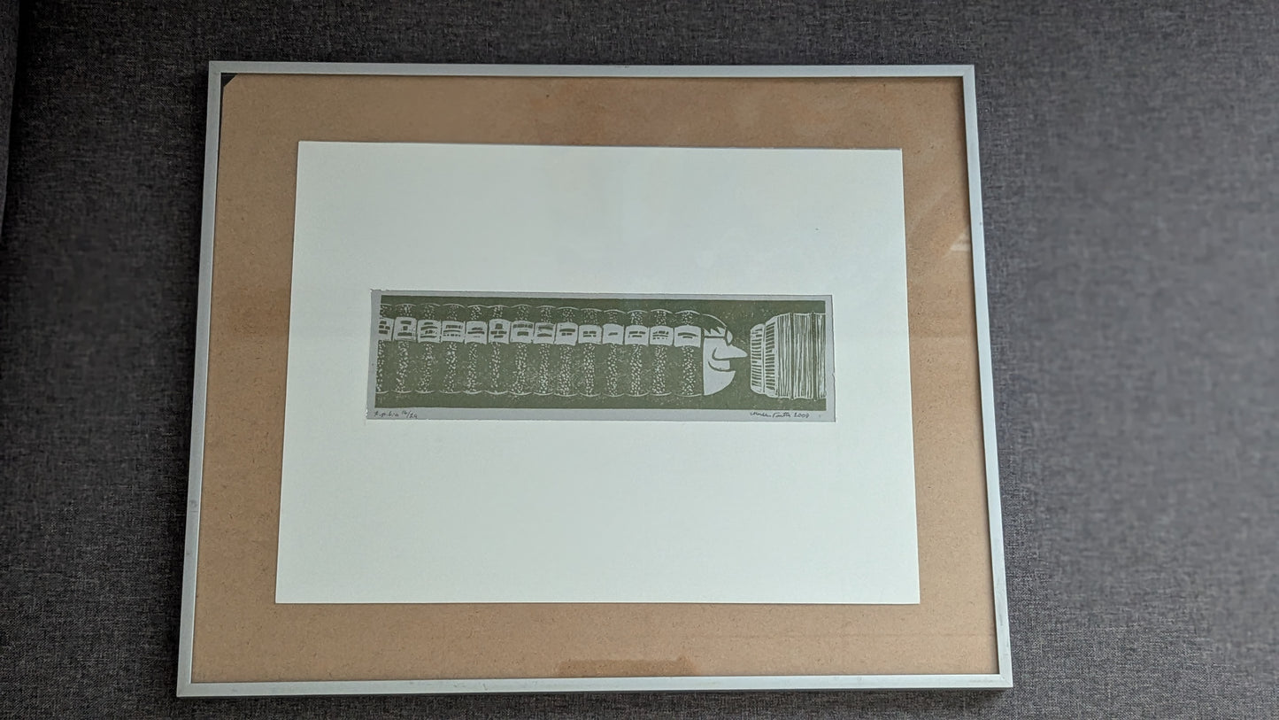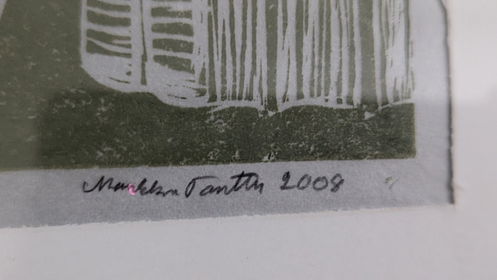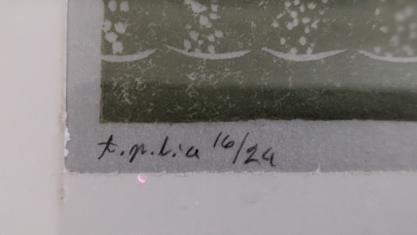 Teoksen alla merkintä tpl'a eli kyseessä taiteilijan itsensä tekemä vedos. Lisäksi numerointi 16/24, taiteilijan signeeraus ja vuosiluku 2008.