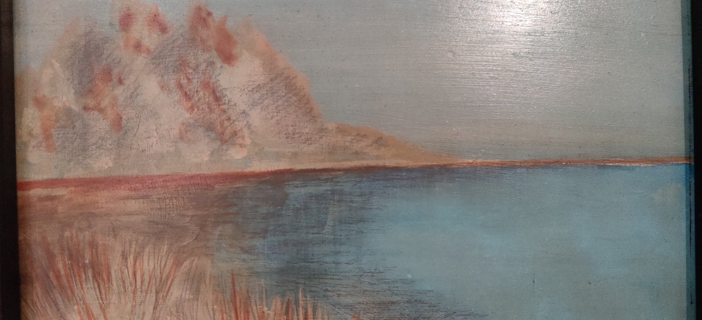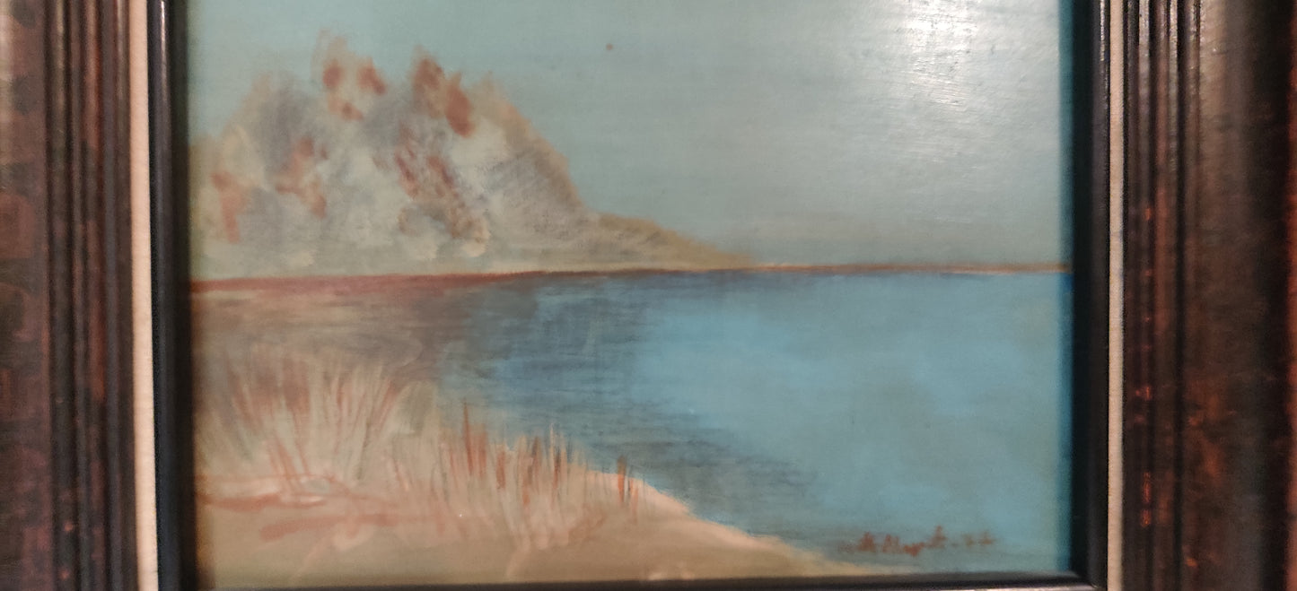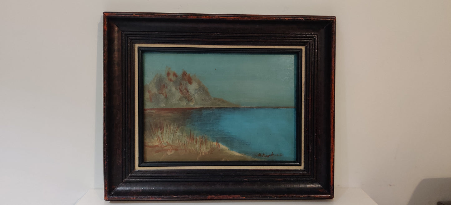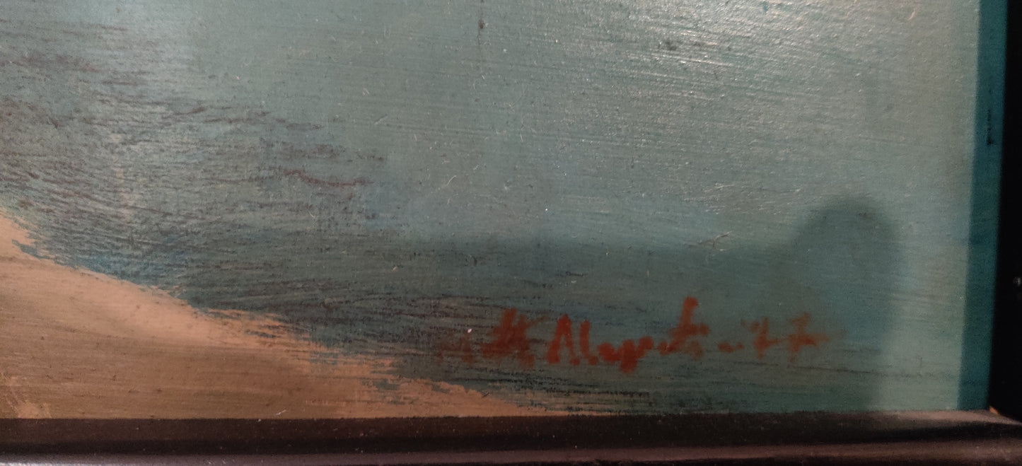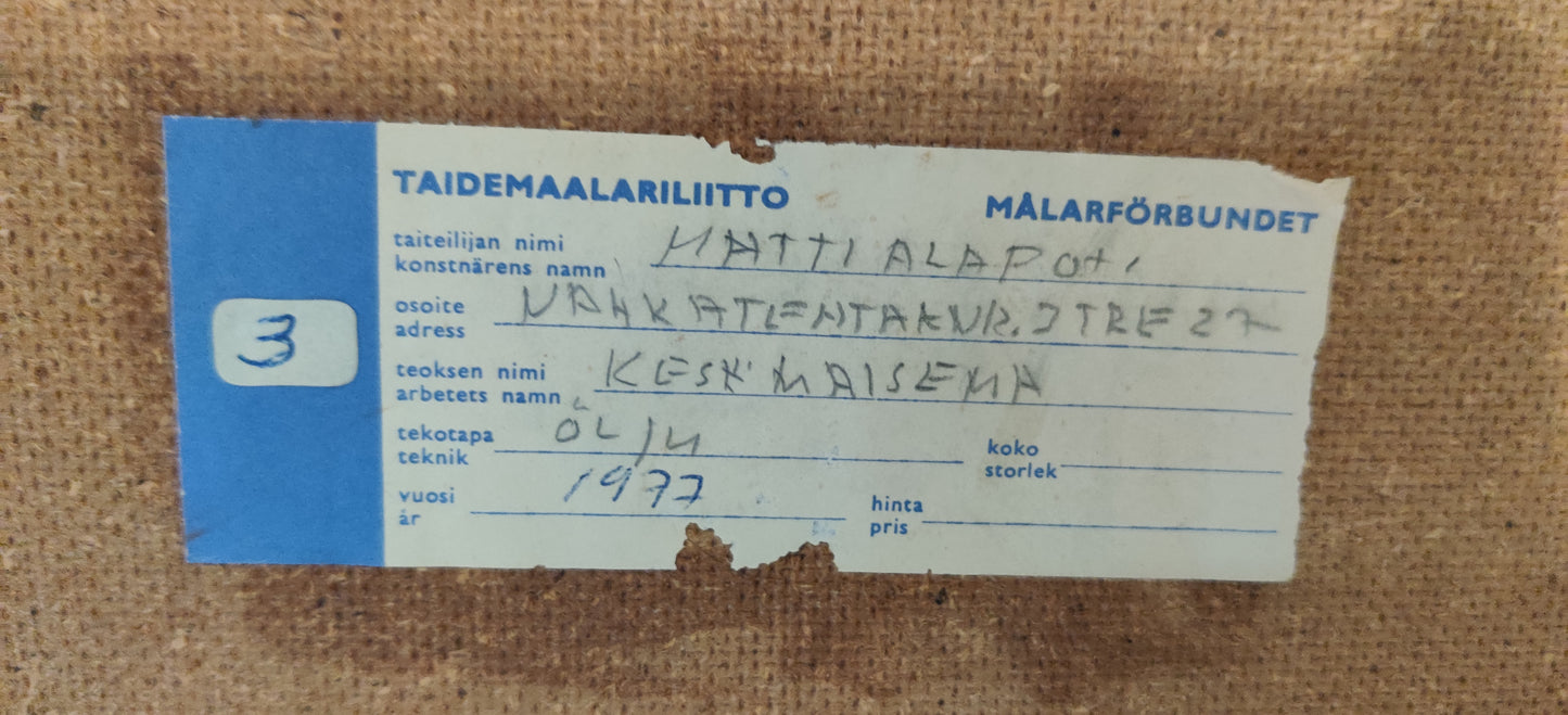 Matti Alapotin signeeraama Kesäinen maisema niminen öljyvärimaalaus levylle vuodelta 1977.