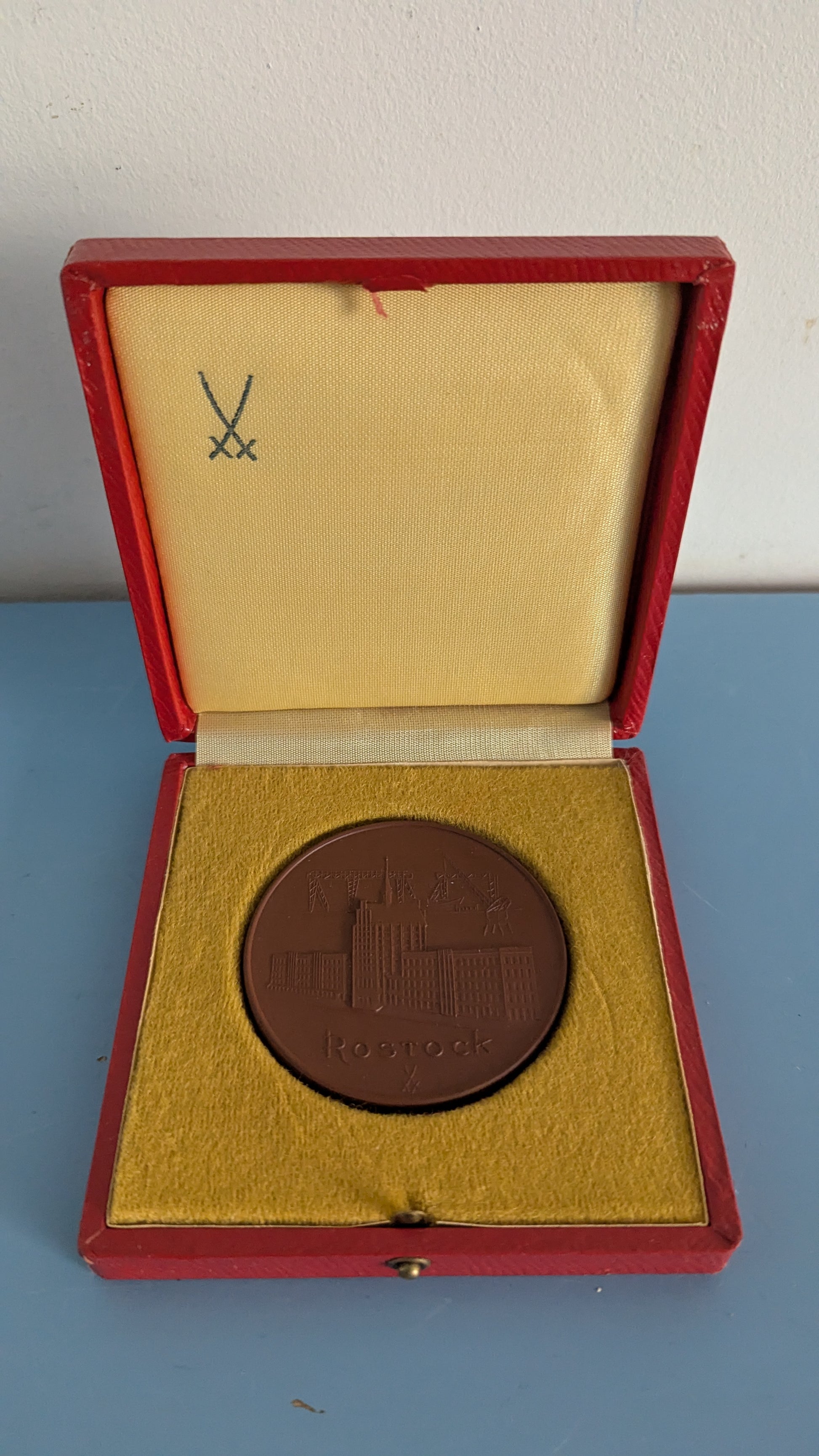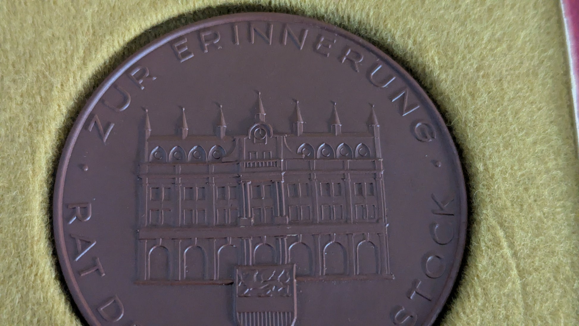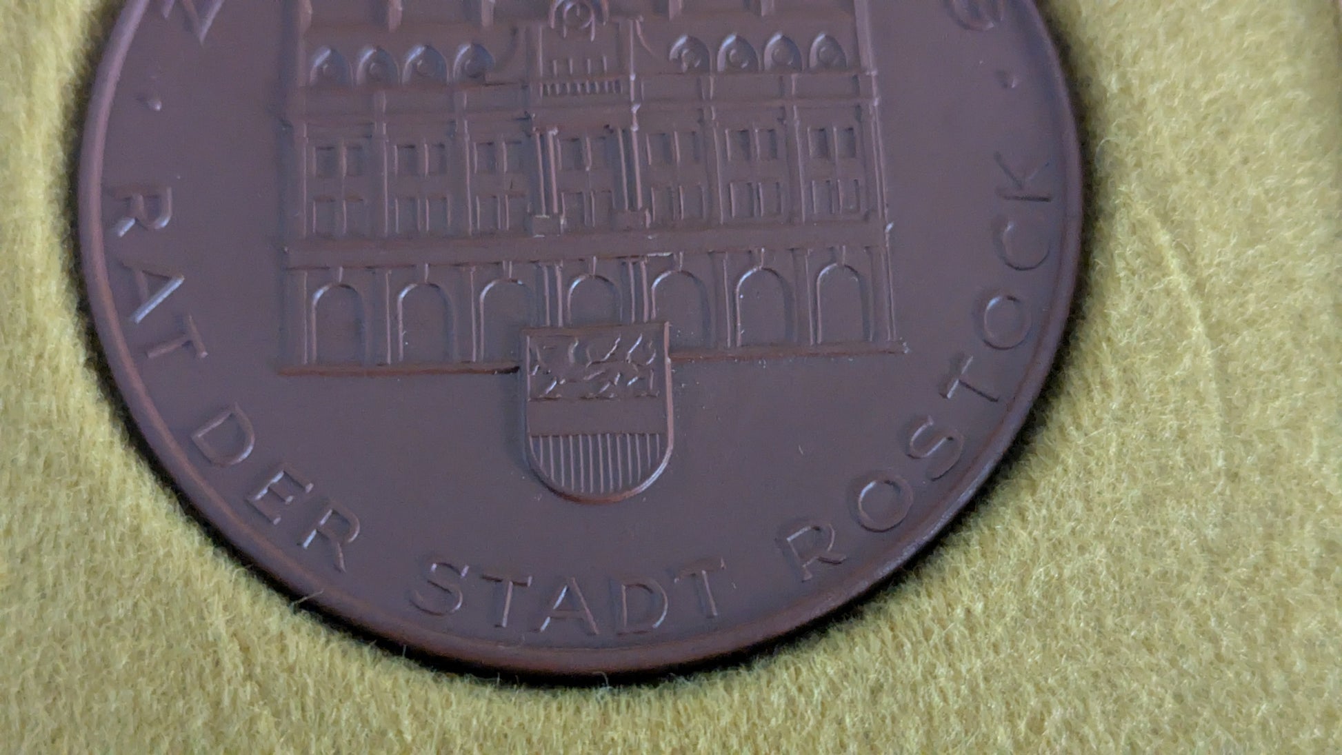 Etupuolella raatihuone ja sen alapuolella kaupunginvaakuna. Ympärillä teksti "Zur Erinnerung" eli muistoksi "Rat der Stadt Rostock" eli Rostockin kaupunginhallitus. Toisella puolella osa Lange Straßea, taustalla Warnemünden nosturilaitteistoa. Lisäksi teksti Rostock. Alhaalla Meissenin ristimiekat logo.