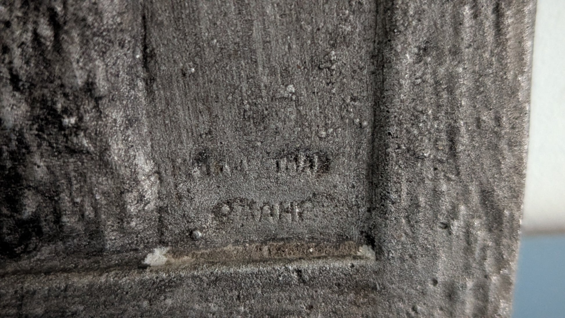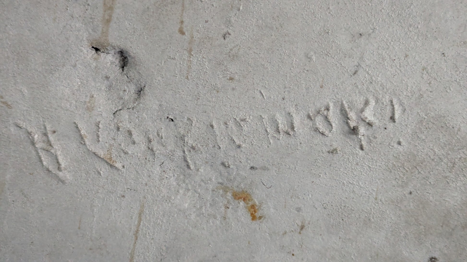 Oikeassa alalaidassa jotain teksti mutta siitä ei saa selvää. Teoksen takana ilmeisesti kohokirjaimin signeeraus.