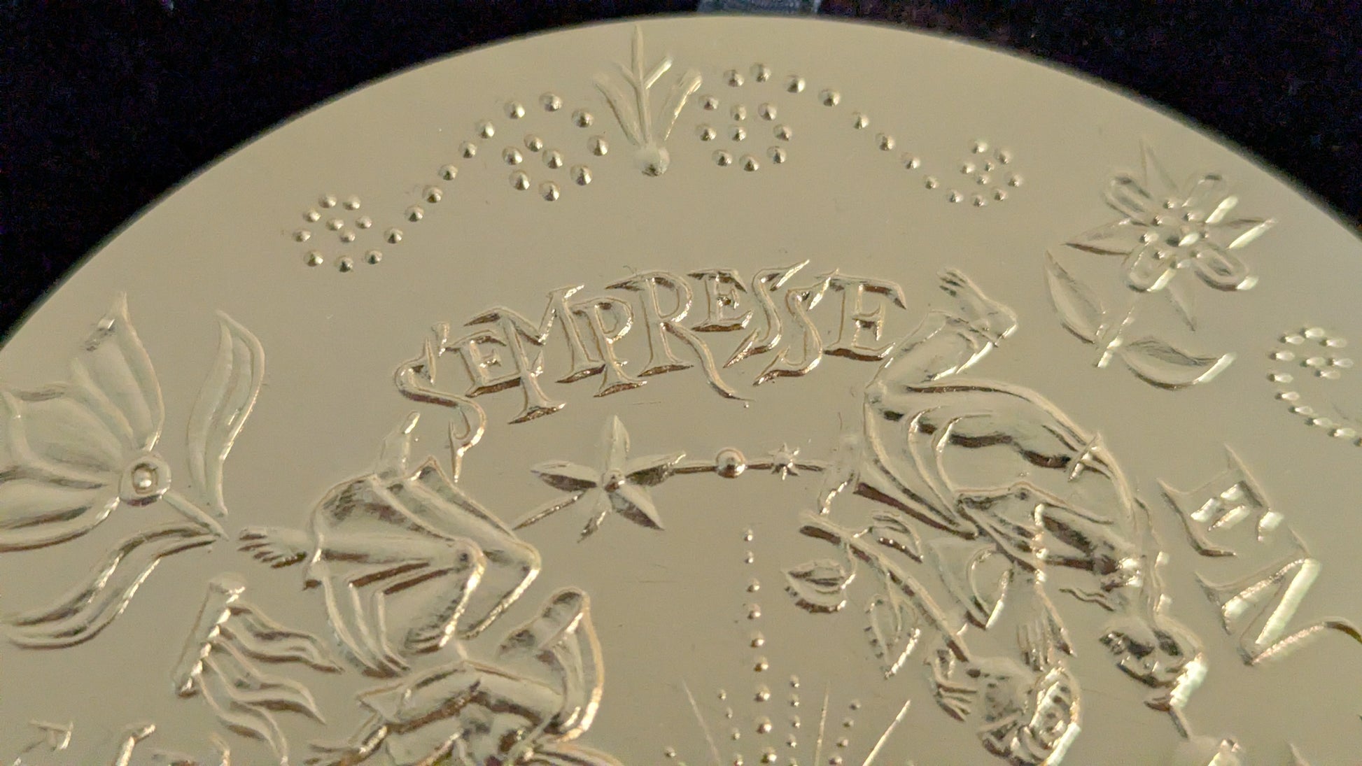 Etupuolella on kuvattuna keskiaikaisiin vaatteisiin pukeutunut nainen, joka pitää oikeassa kädessään kahta lippua ja vasemmalle ojennetulla kädellään seisoo lintu. Häntä ympäröivät hedelmät, kukat ja spiraalimainen simpukankuorta muistuttava esine, jonka alapuolelle asetellut hedelmät muodostavat vaikutelman kasvoista, joilla on suuri hattu. Nainen seisoo tähden edessä, jonka neljä sakaraa ovat juuri ja juuri näkyvissä.