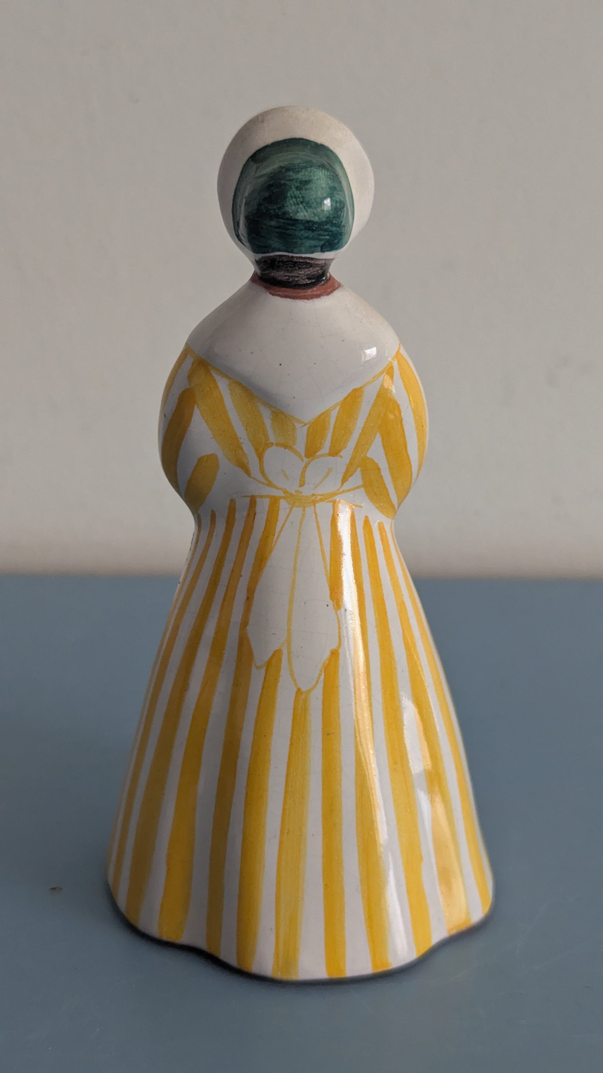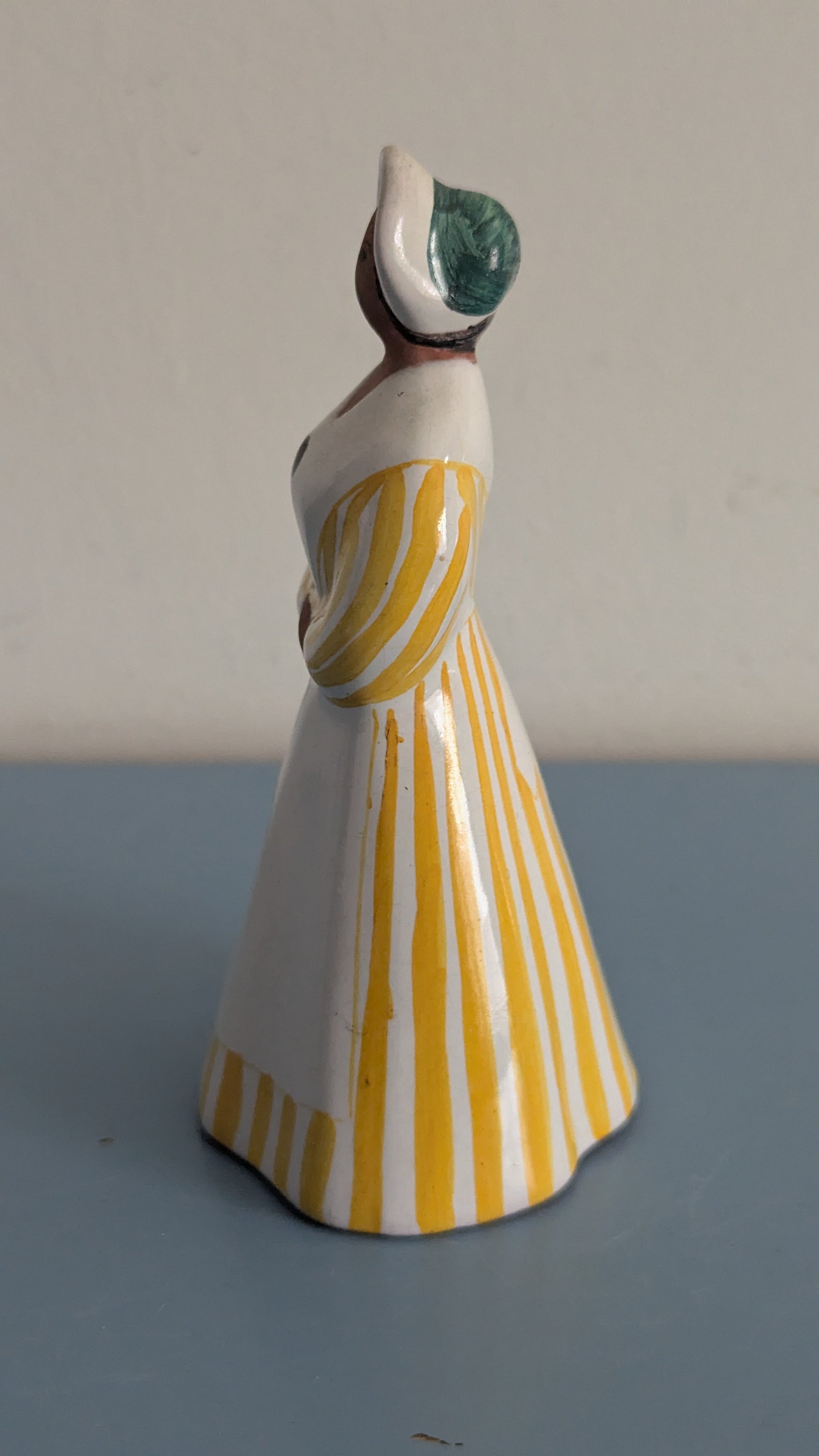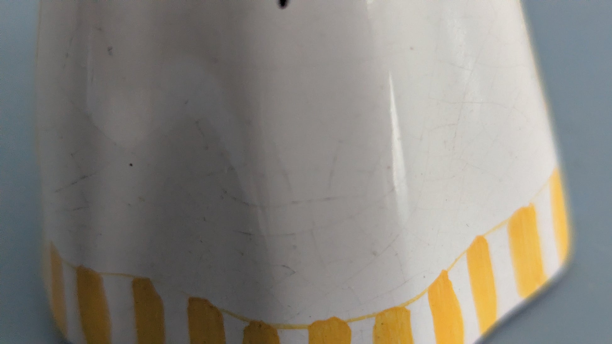 Ei iskemiä tai halkeamia. Helmassa, keltaisen osan yläpuolella, orastavaa krakeloitumista. Näkyy läheltä tarkkaa katsottaessa.