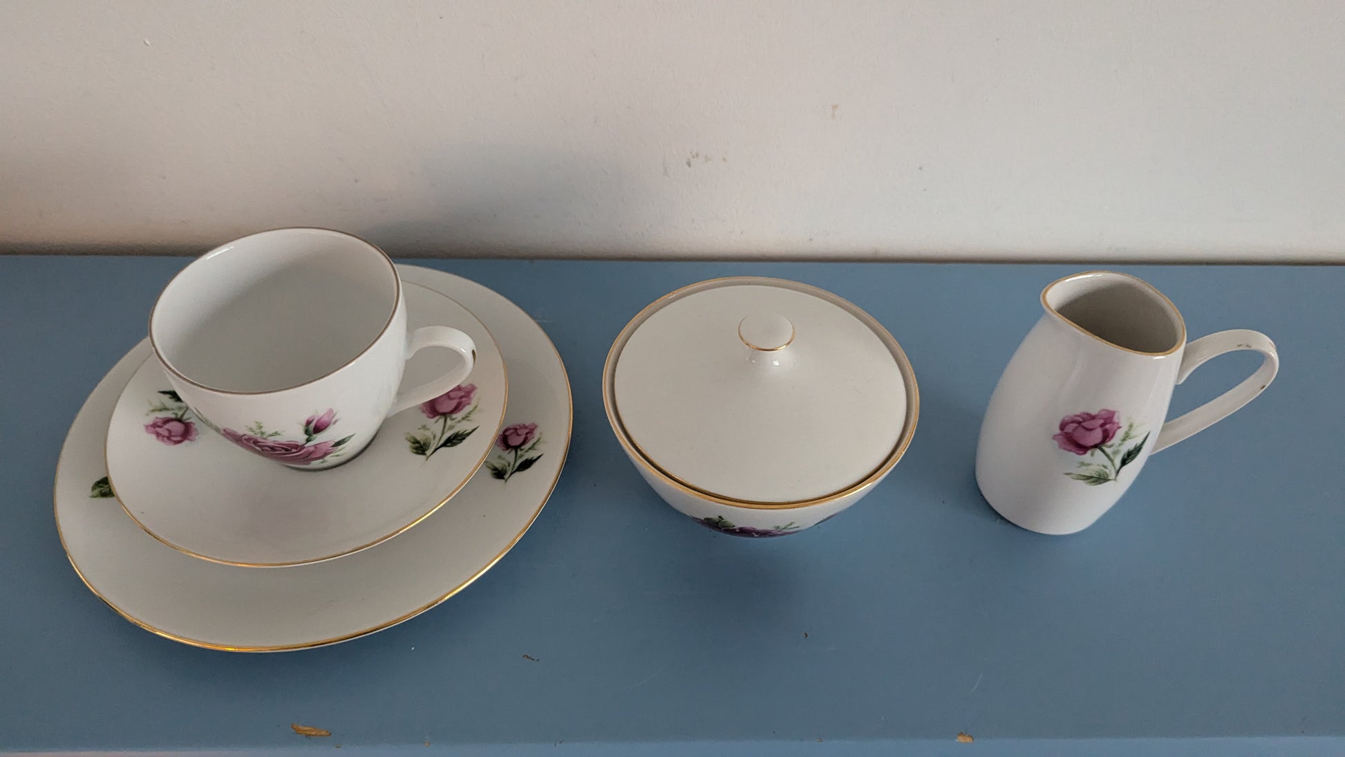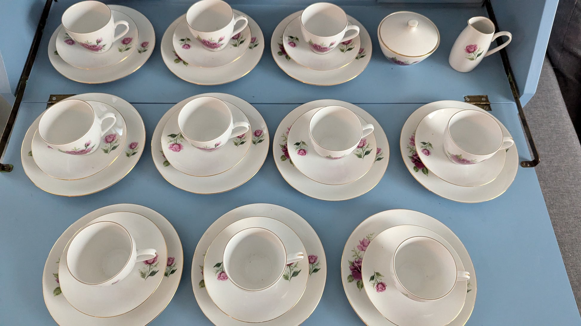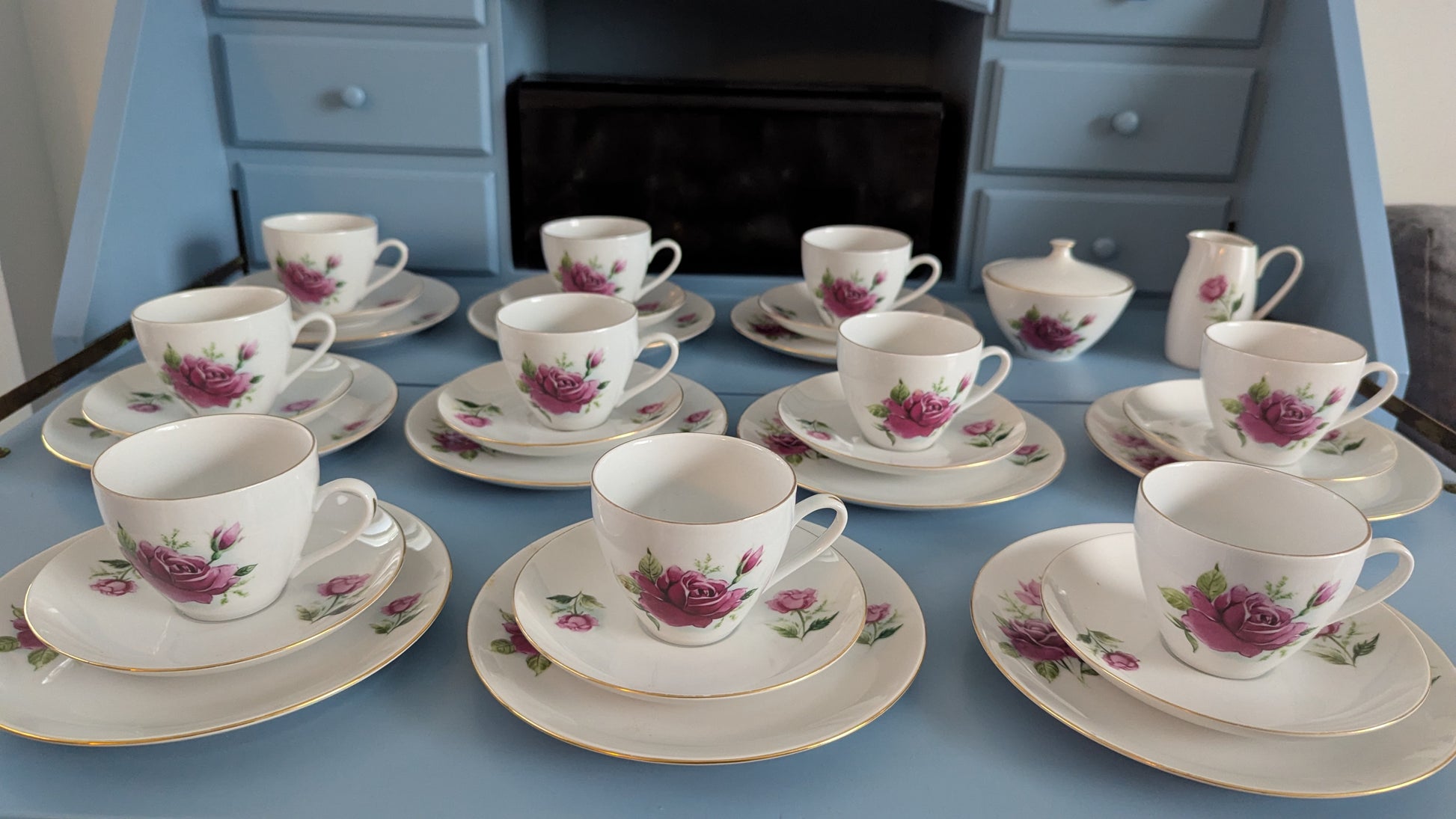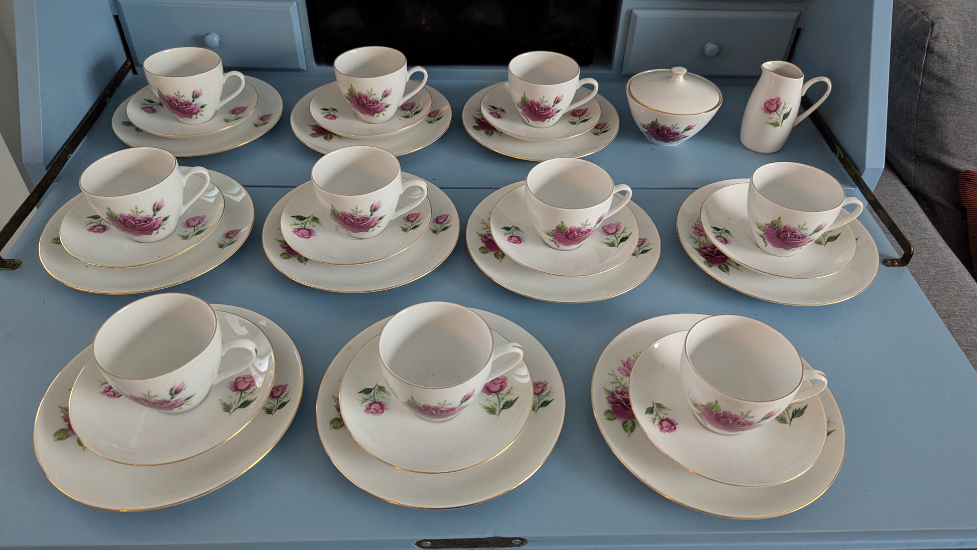 32-osainen ruusuilla koristeltu kahviastiasto kymmenelle hengelle.