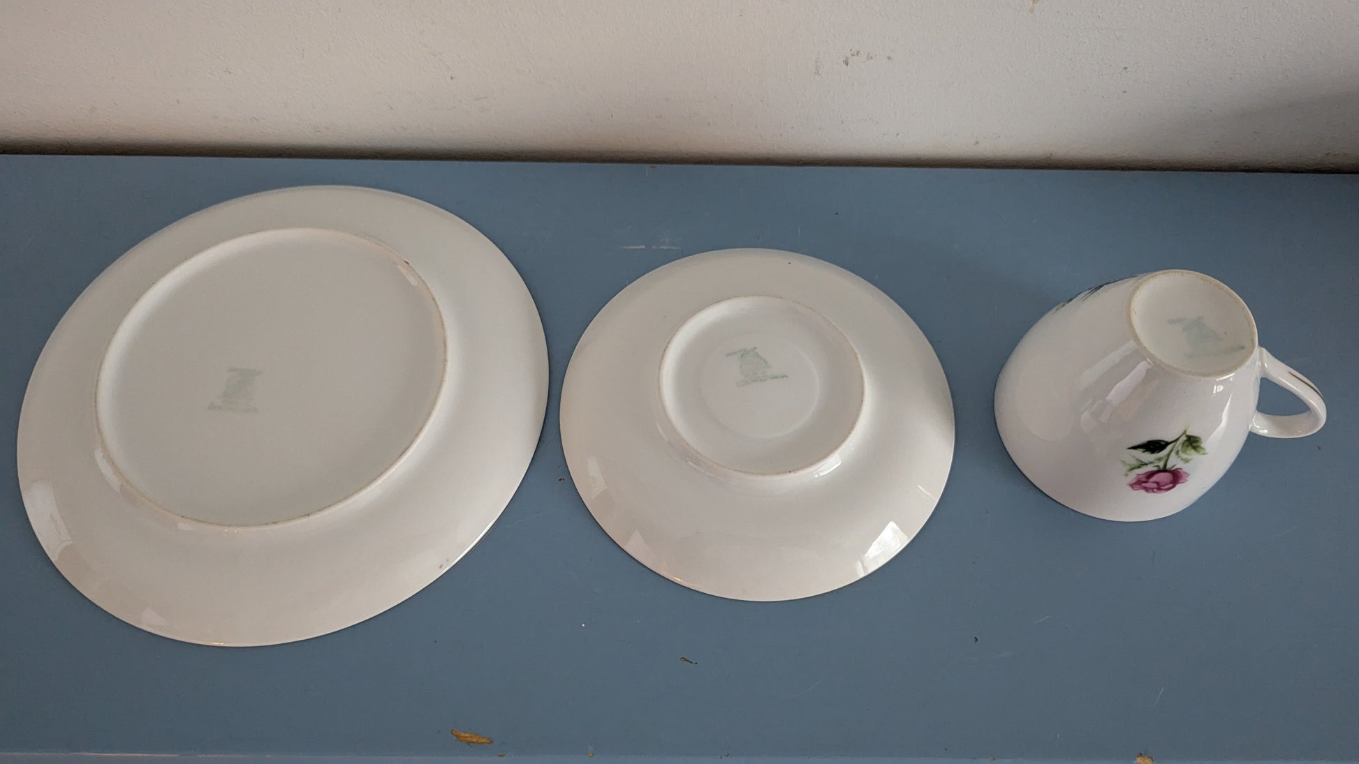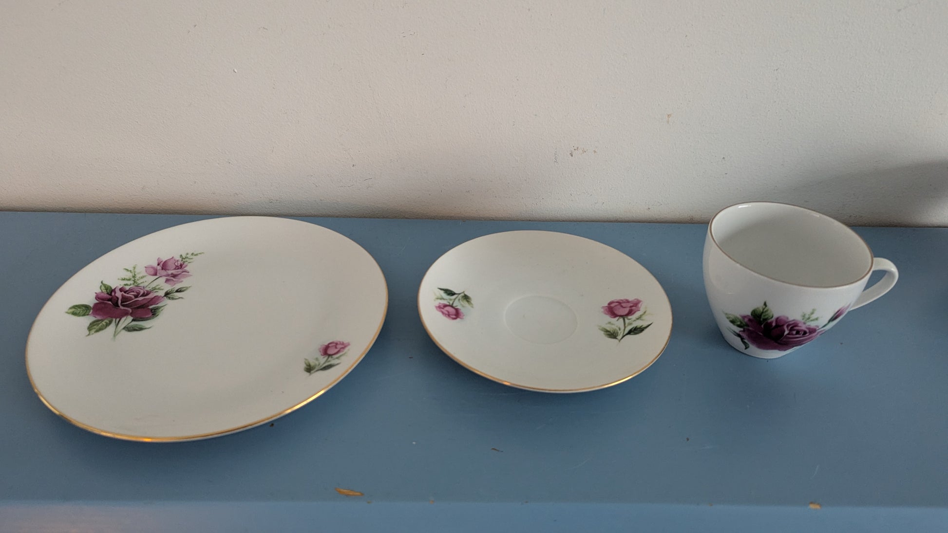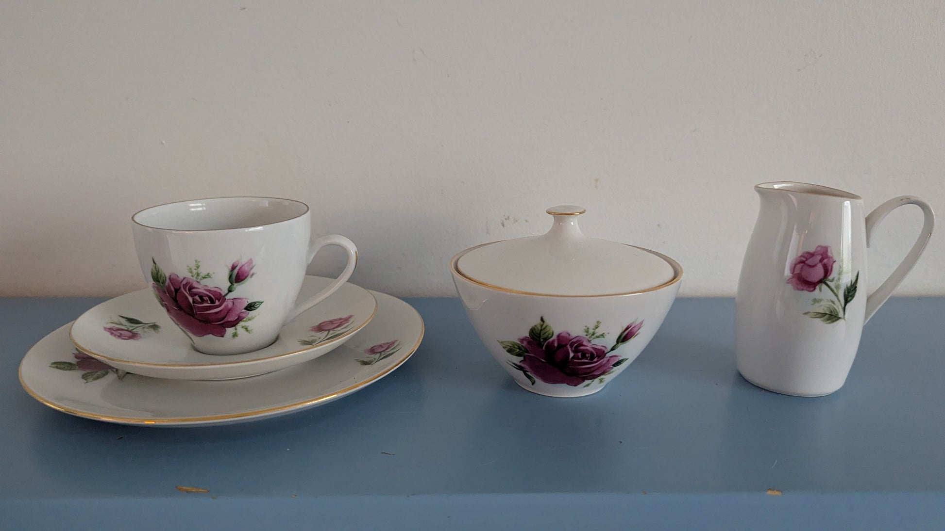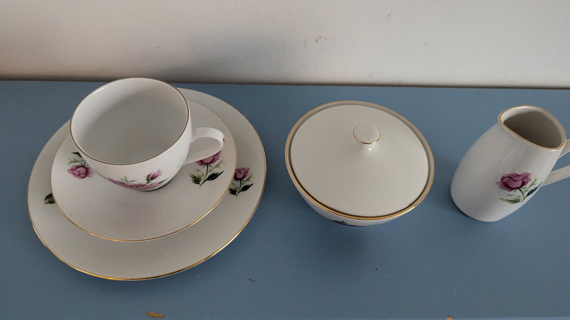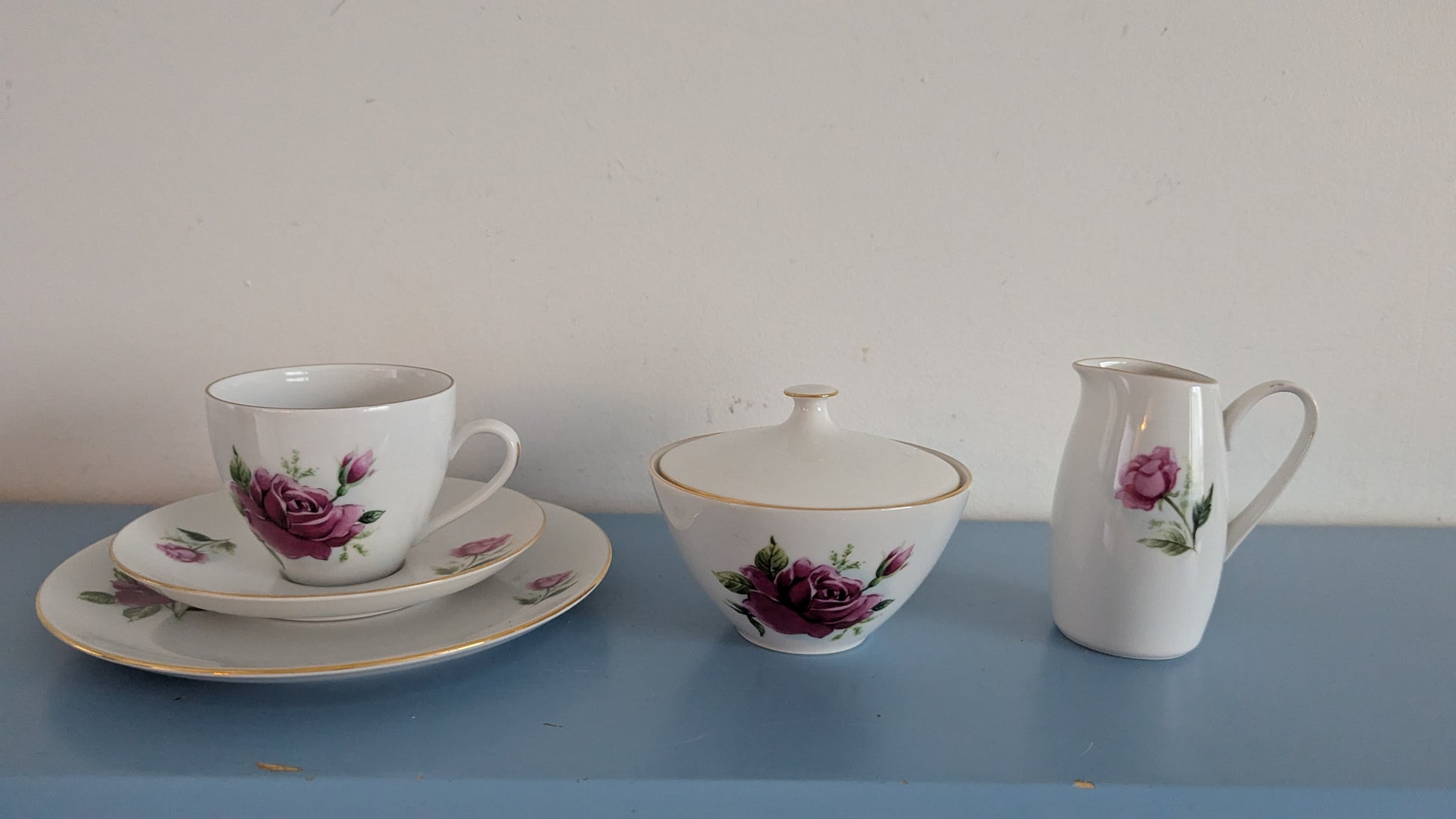 32-osainen ruusuilla koristeltu kahviastiasto kymmenelle hengelle.