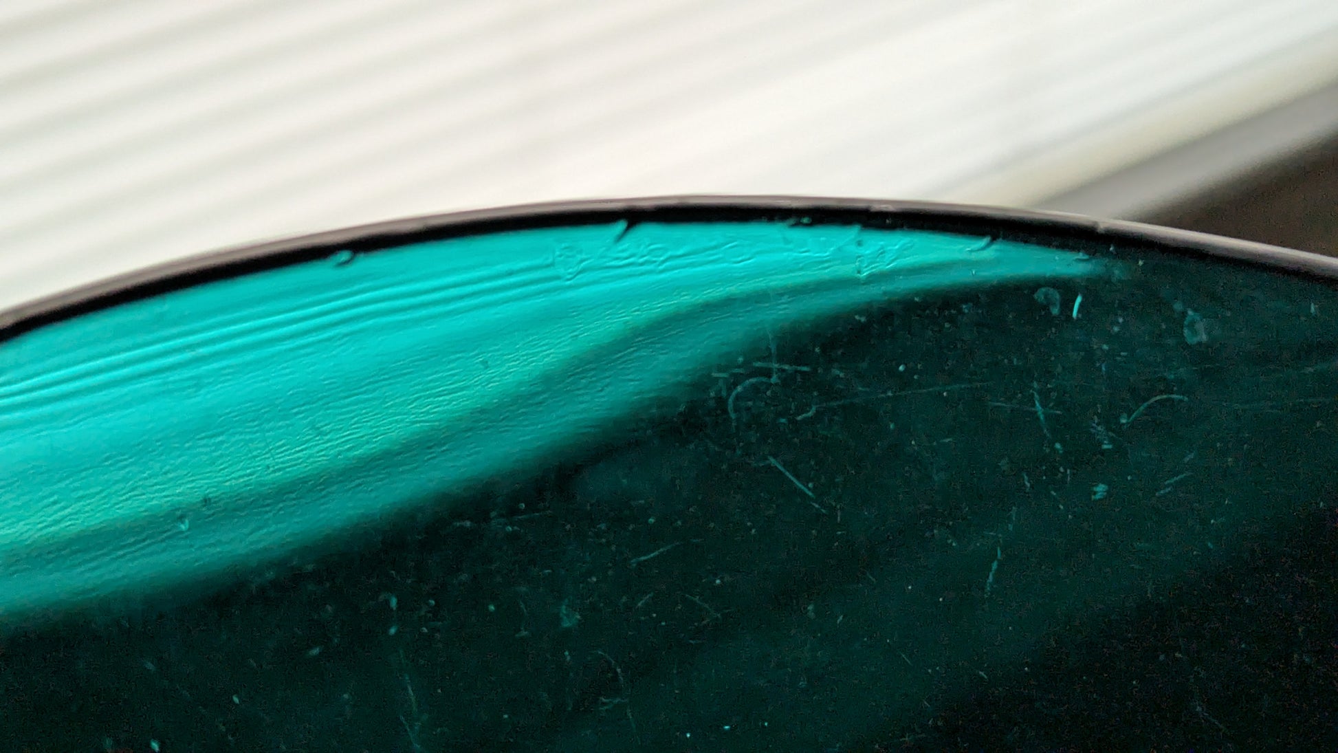 Ei iskemiä tai halkeamia. Käyttökulumaa. Lasimassan sisään jäänyt pieniä ilmakuplia. Yläreuna sileä mutta epätasaisuutta eli ei ole iskemiä vaan jäänyt kuoppaiseksi. Näkyy viimeisessä kuvassa.