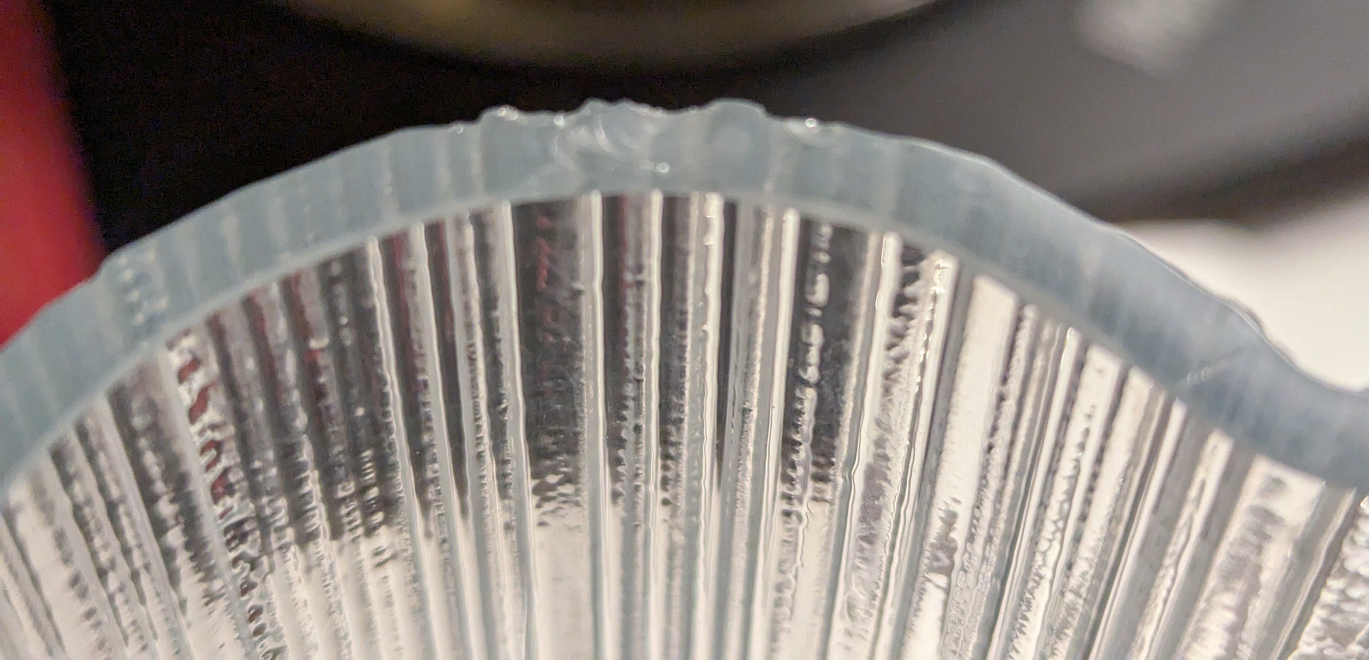 Ei halkeamia. Pohjalla pientä naarmua siirtelystä. Yläosan ulkoreunalla useampi iskemä, joista suurin 6mm näkyy viimeisessä kuvassa.
