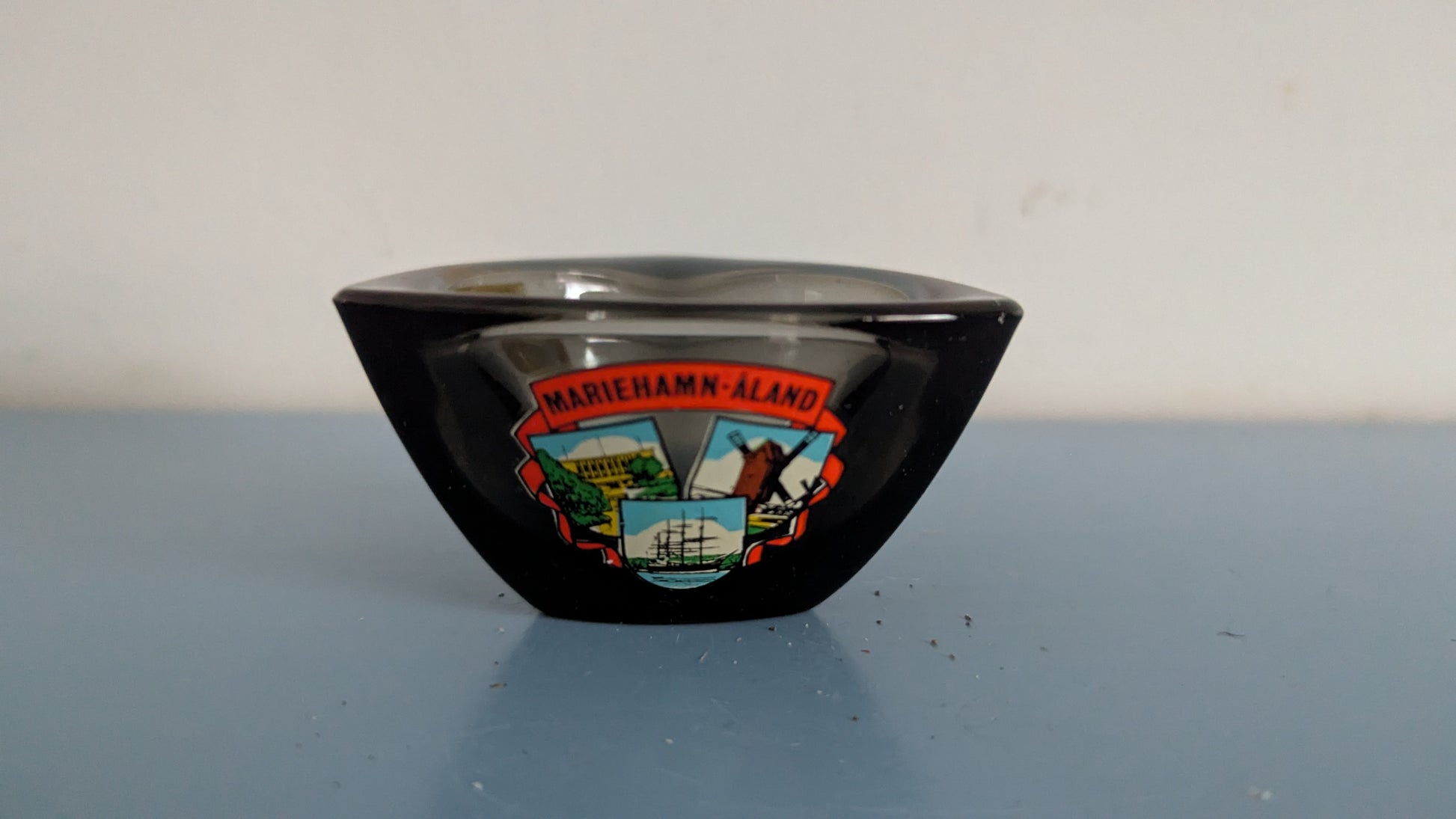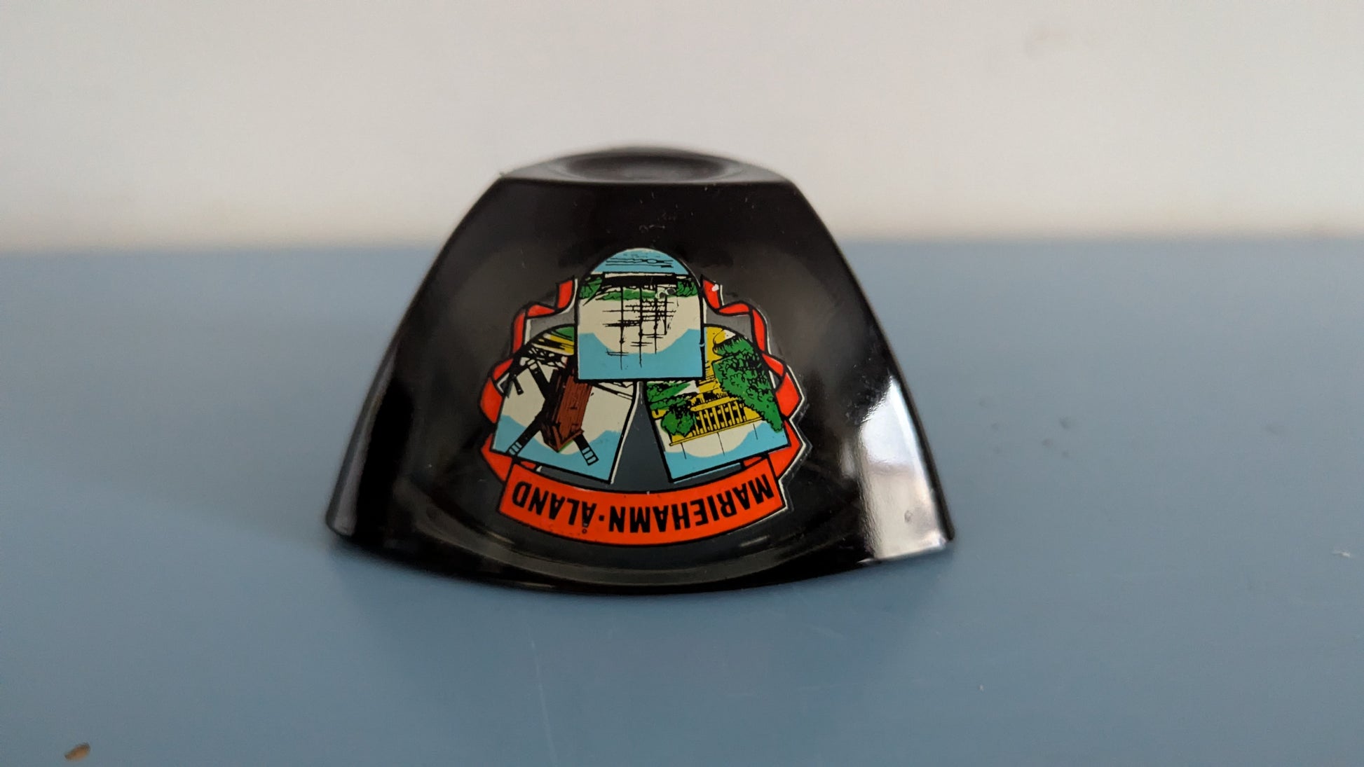Näitä myytiin aikanaan myös matkamuistoina. Tämän kyljessä teksti Marienhamn - Åland ja kuvia Maarianhaminan nähtävyyksistä.