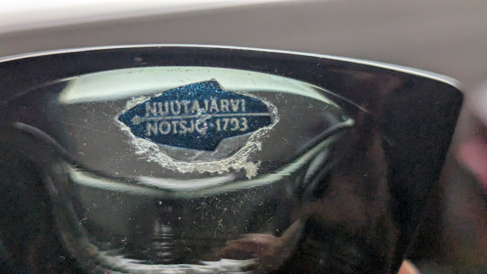 Nuutajärven tarra vielä paikalla. Tosin siinä kulumaa. Muuten ei iskemiä, halkeamia tai naarmuja.