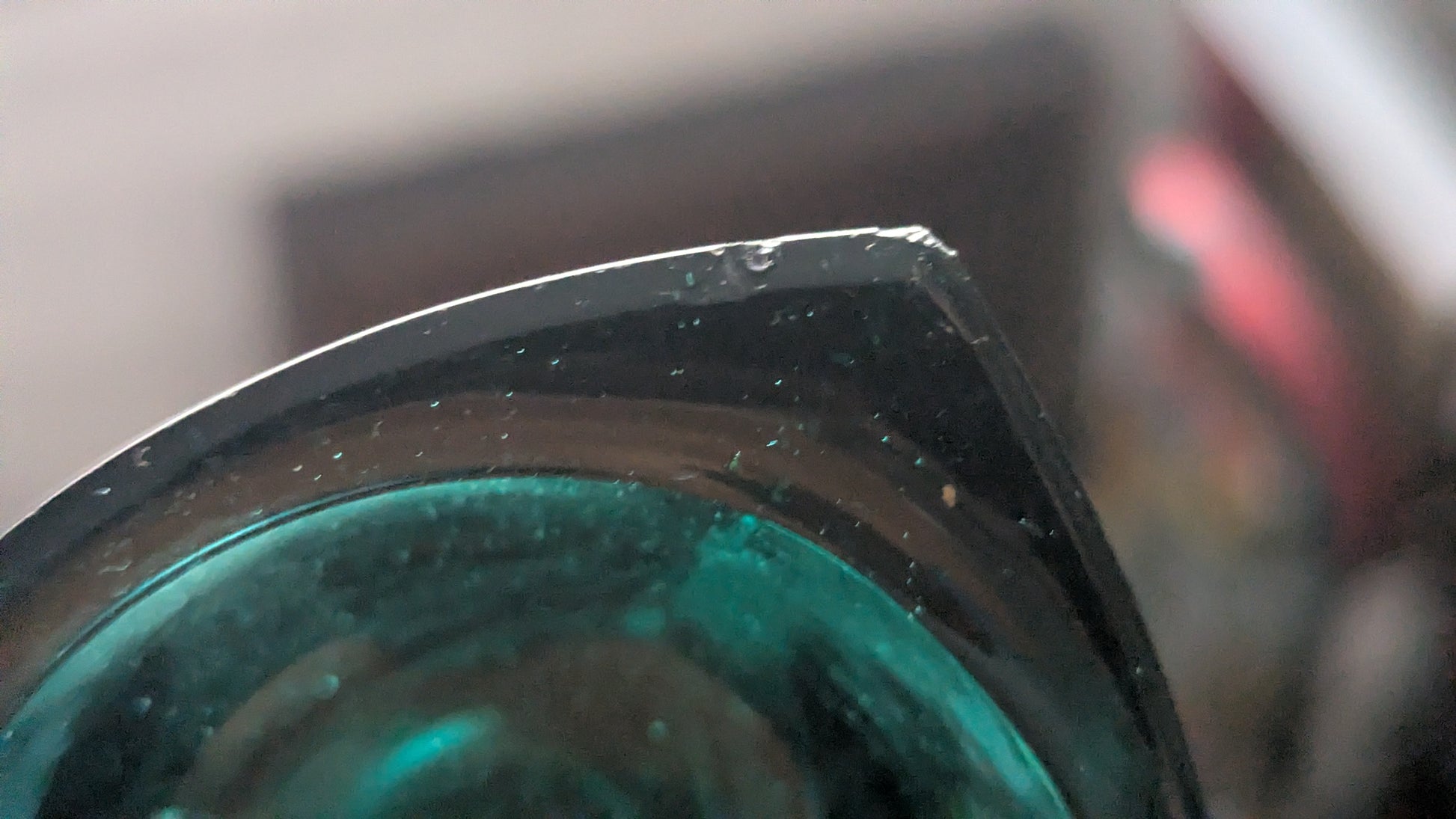 Ei halkeamia tai naarmuja. Yhdessä kärjessä ja sen vieressä 2mm iskemä. Näkyy viimeisessä kuvassa.