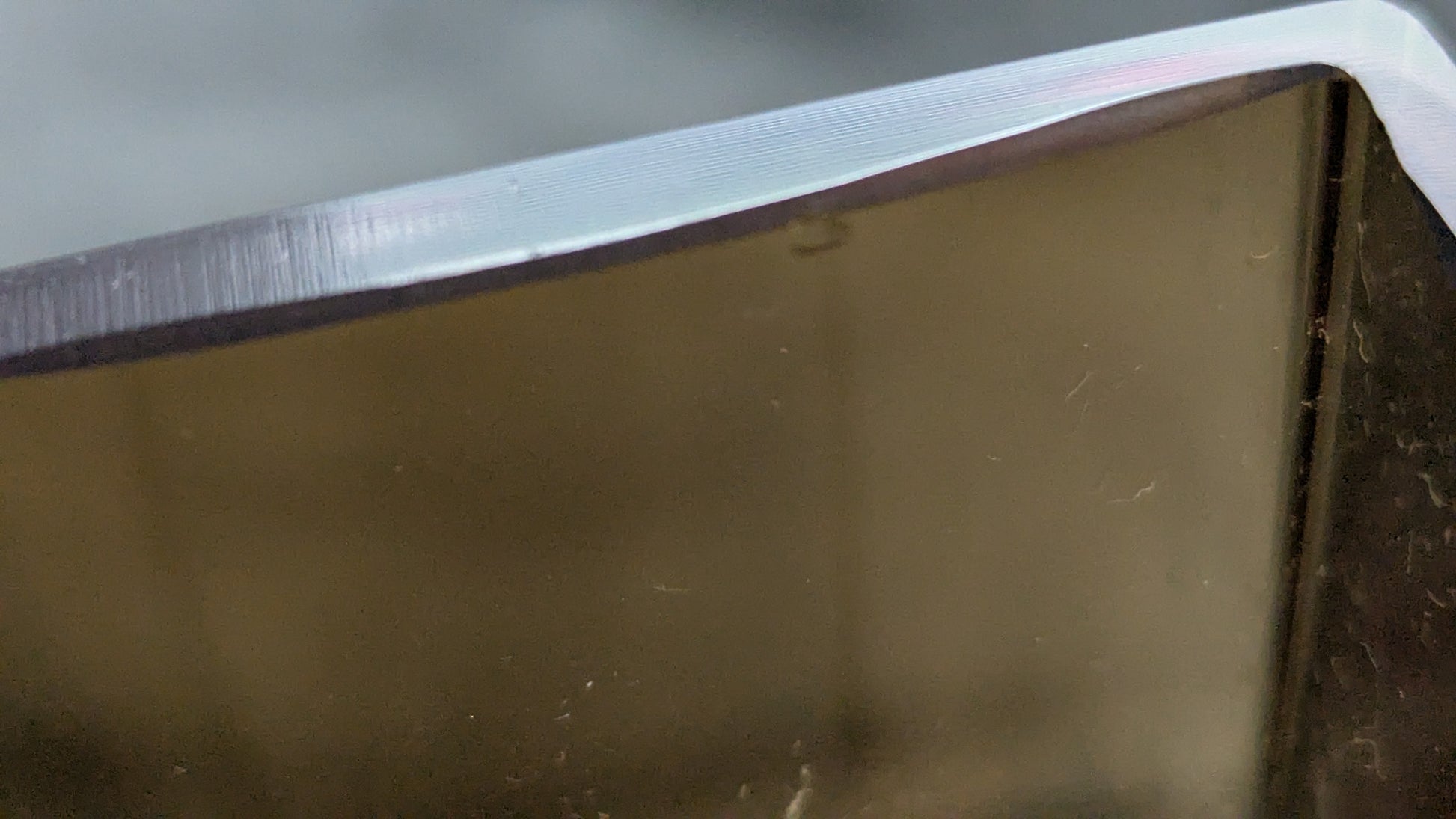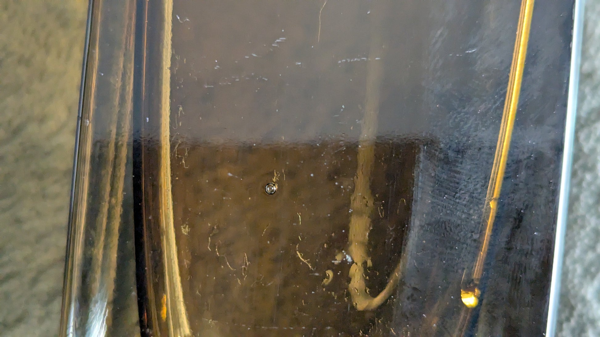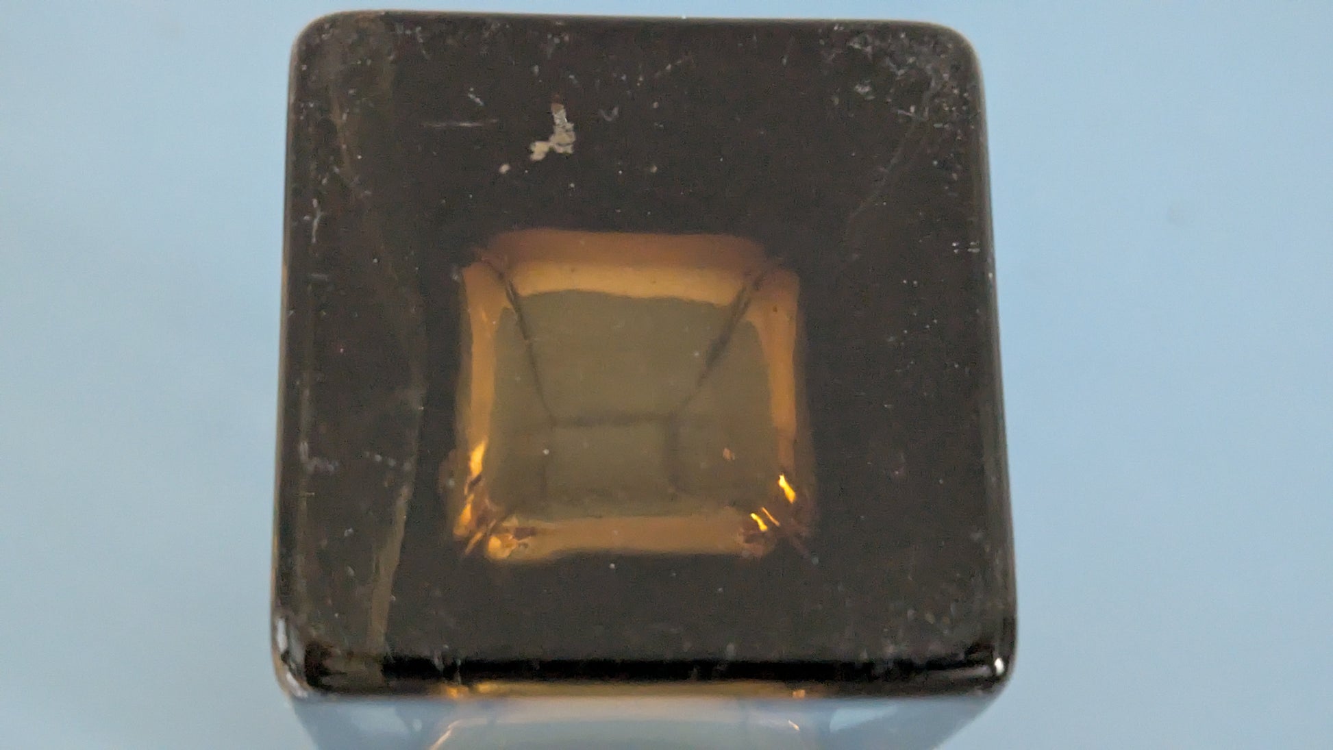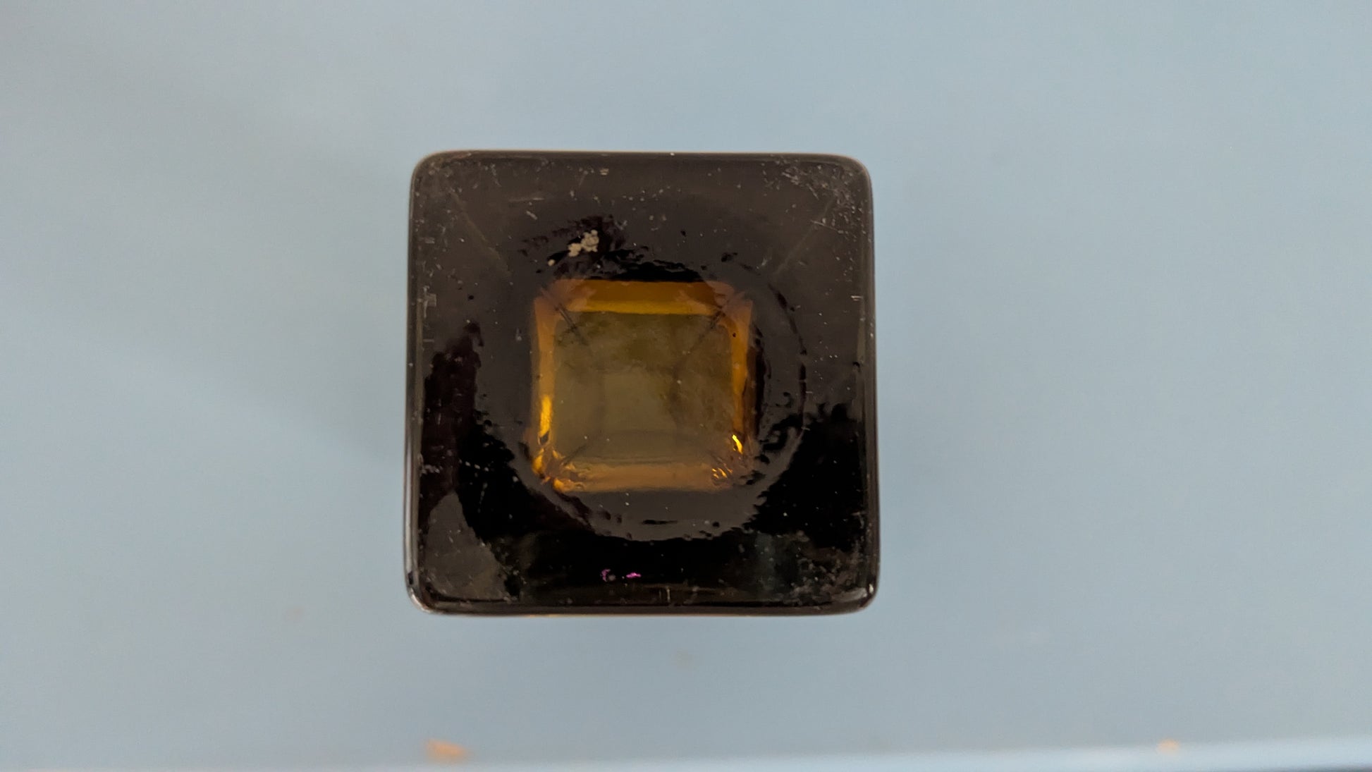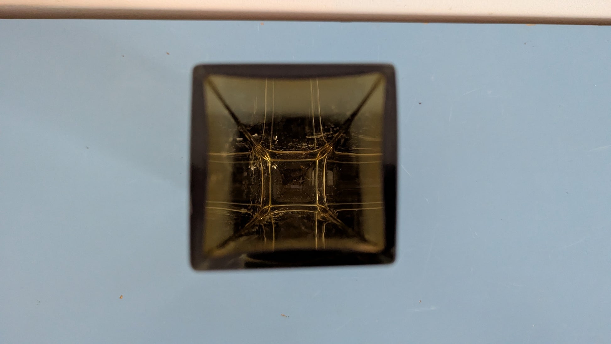 Ei halkeamia. Pohjassa vähäistä jälkeä siirtelystä. Lasimassan sisään jäänyt yksi pieni ilmakupla. Yläreunan sisäpuolella noin 1mm kokoinen iskemä, mikä näkyy viimeisessä kuvassa.