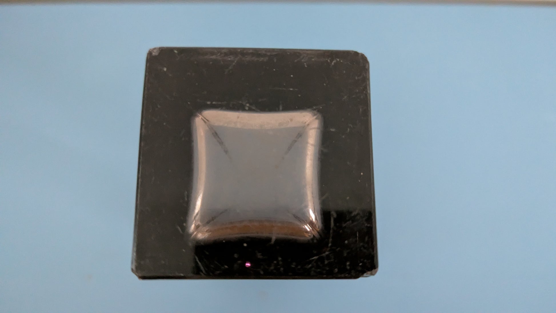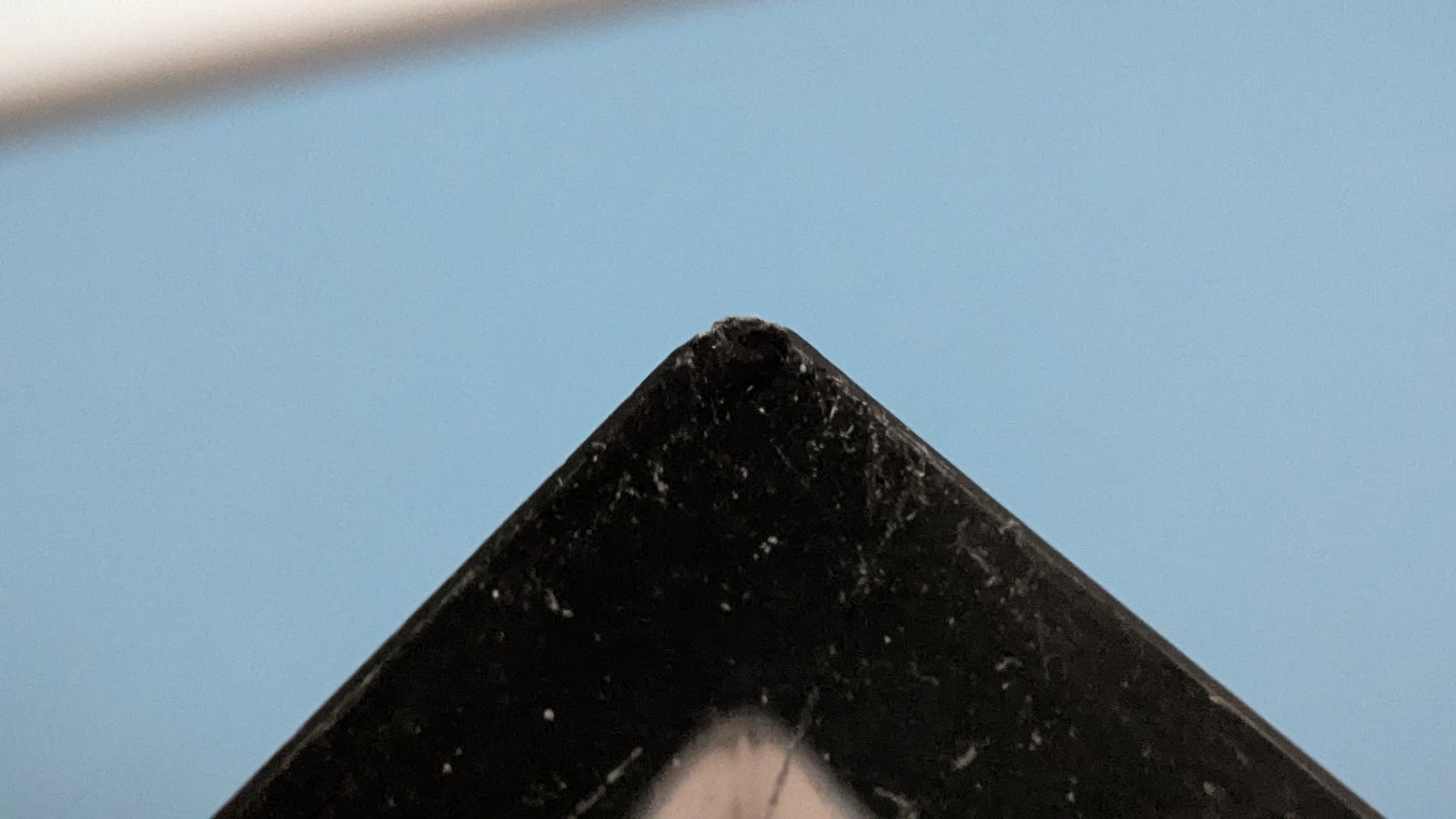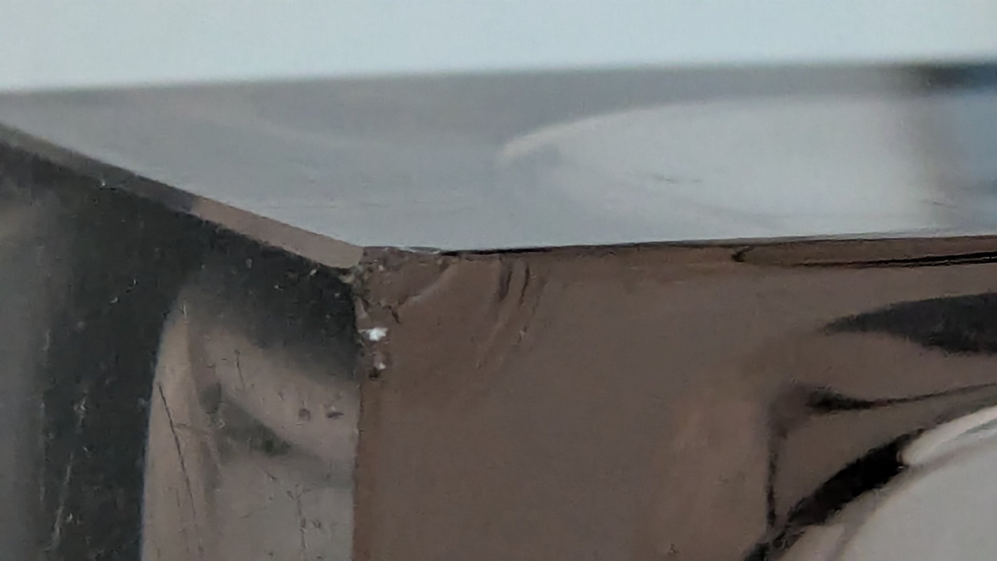 Ei halkeamia. Pohjassa naarmuja siirtelystä. Iskemiä runsaasti. Yläosan yhdessä nurkassa yksi ja reunassa noin 1cm iskemä. Alareunan jokaisessa nurkassa iskemät.