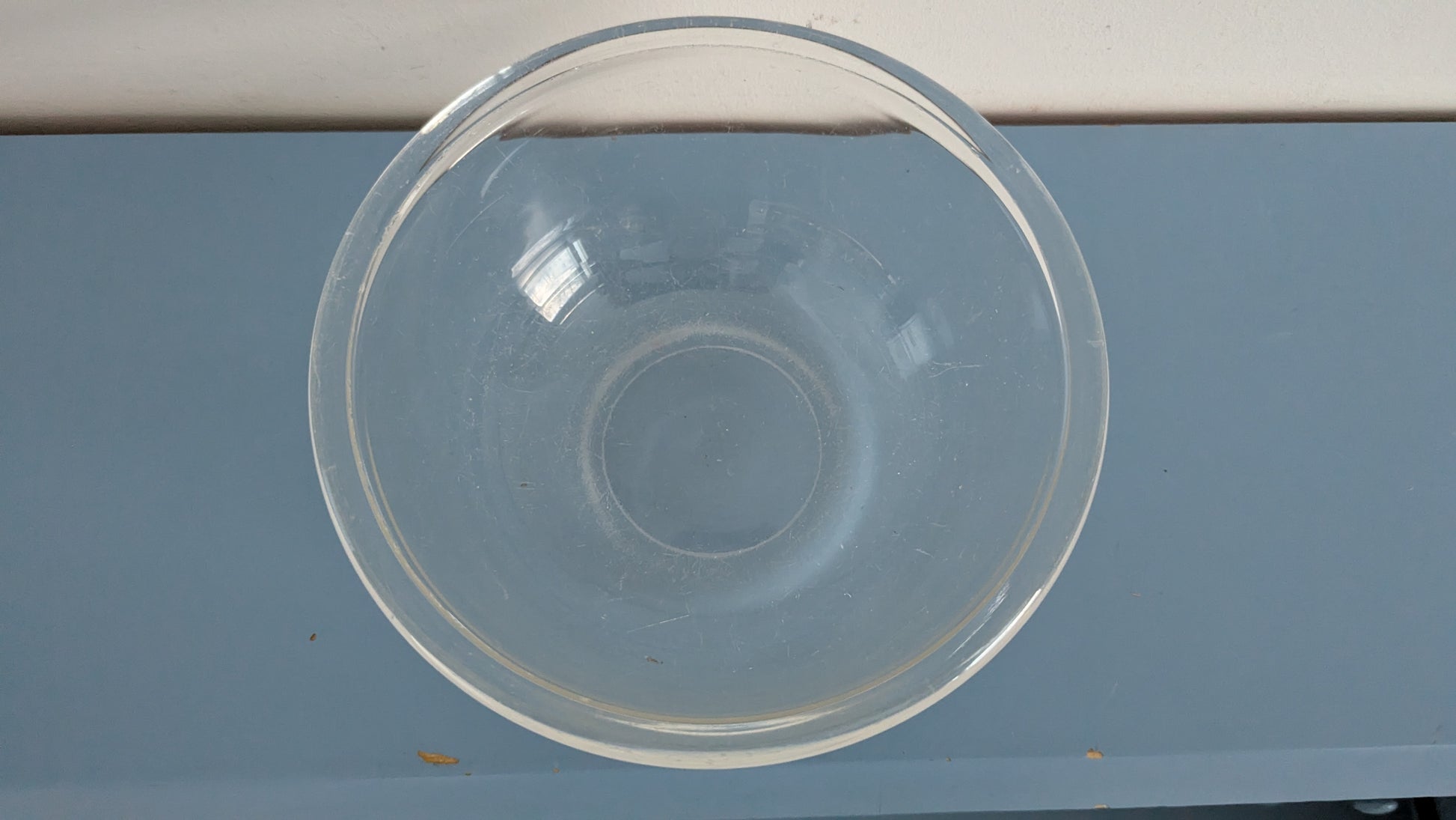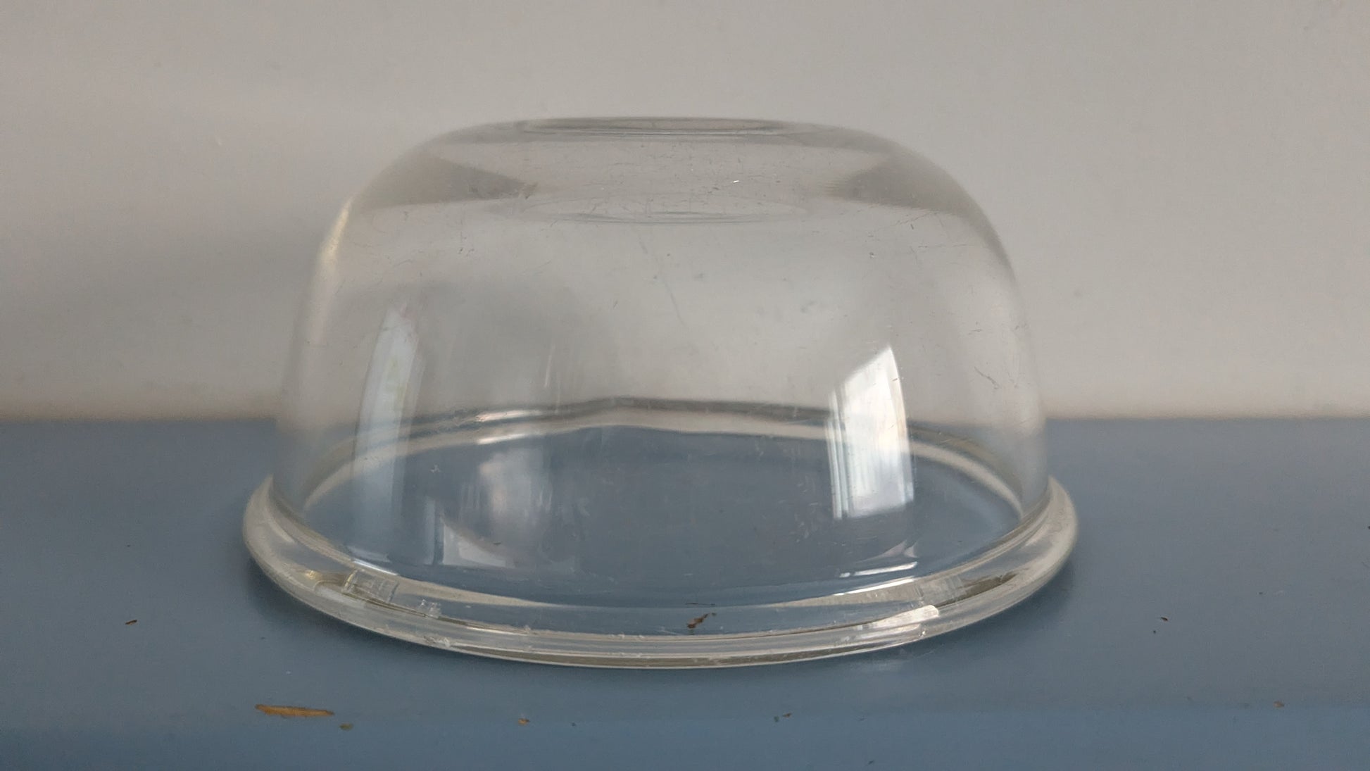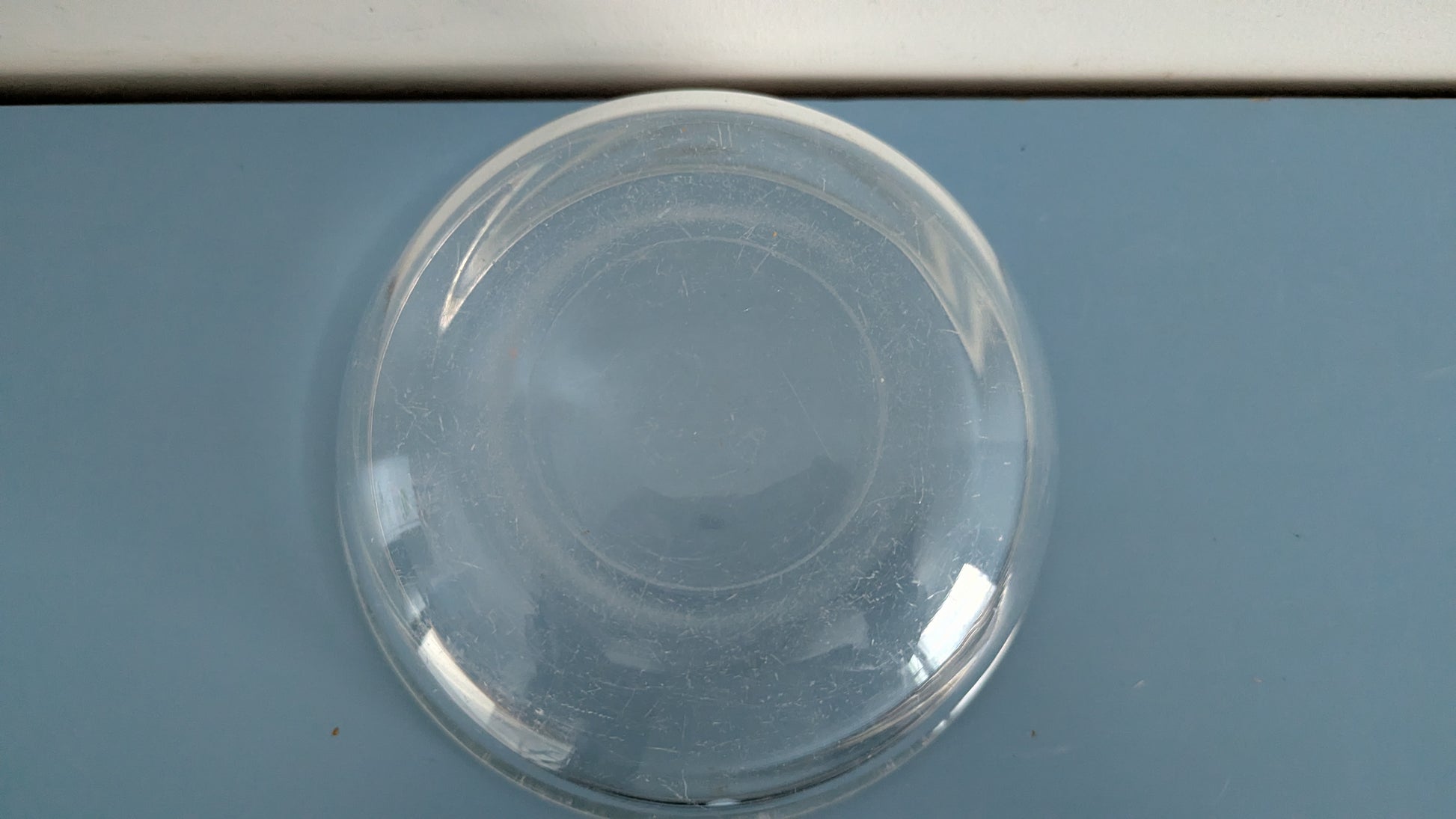 Ei halkeamia. Käyttökulumaa reilusti. Sisäpuolen yläreunassa pientä iskemää / karheumaa.