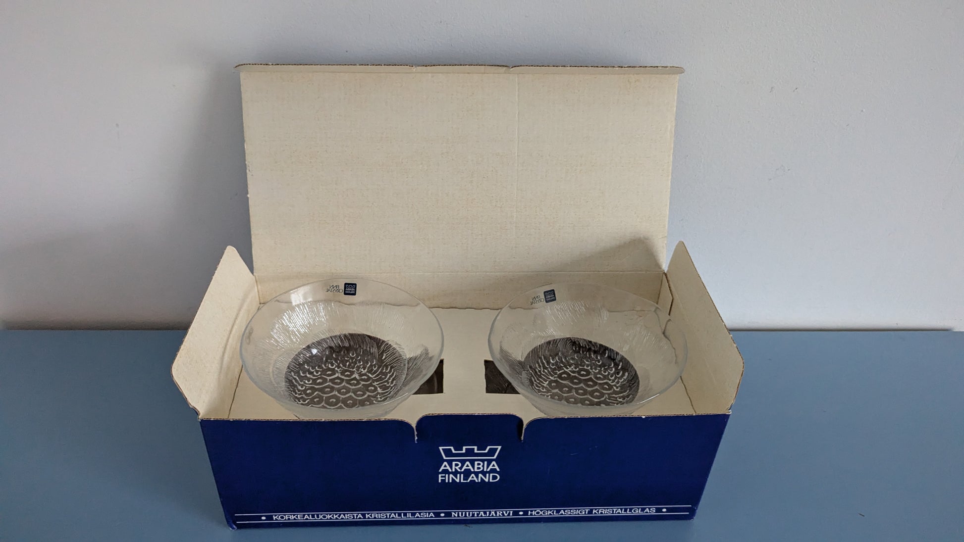 Alkuperäisessä pakkauksessa. Myyty Arabian tuotemerkillä. Jokaisessa vielä Arabia Finn Crystal tarrat paikalla. Vaikuttaa käyttämättömiltä. Ei iskemiä, halkeamia tai naarmuja.