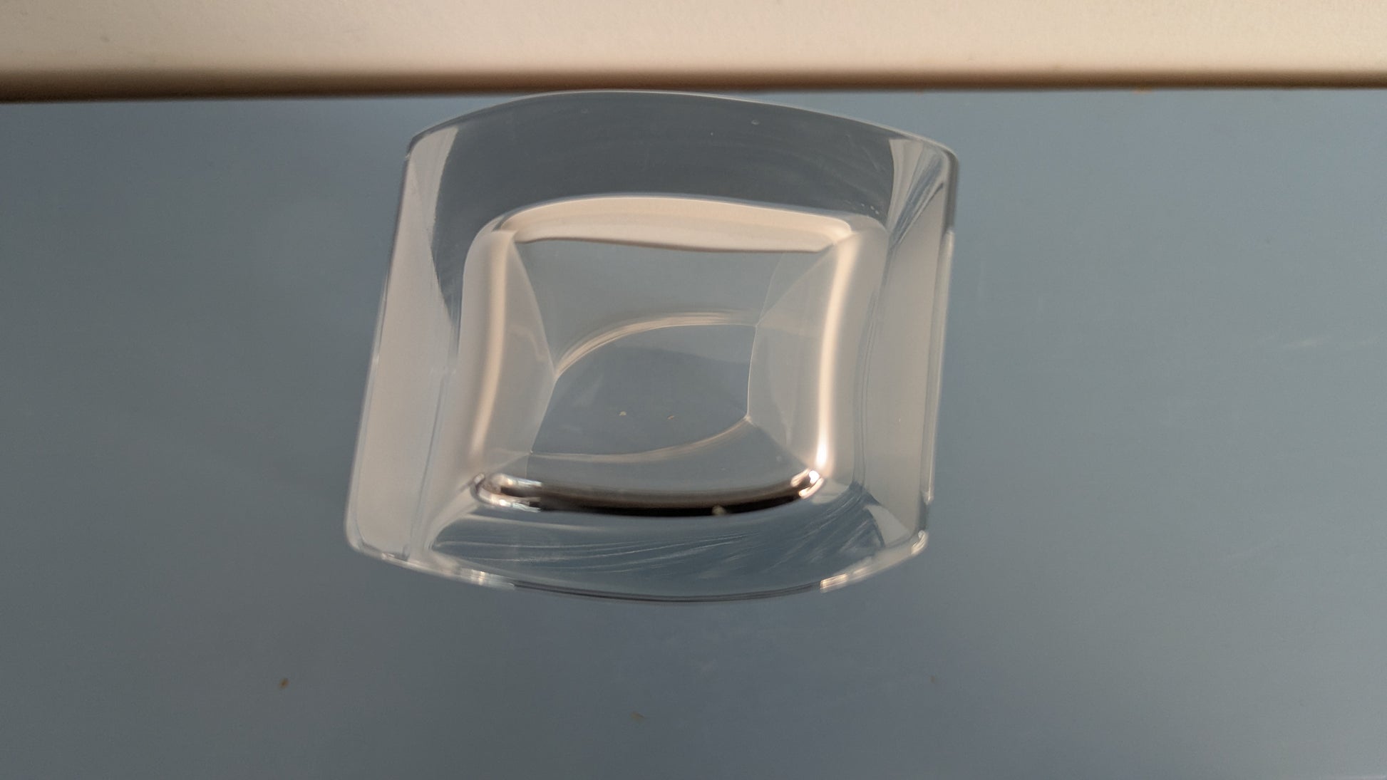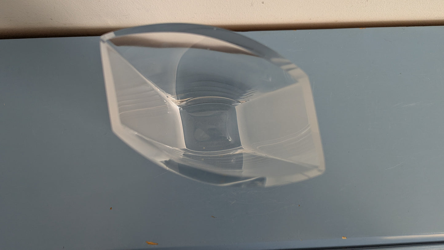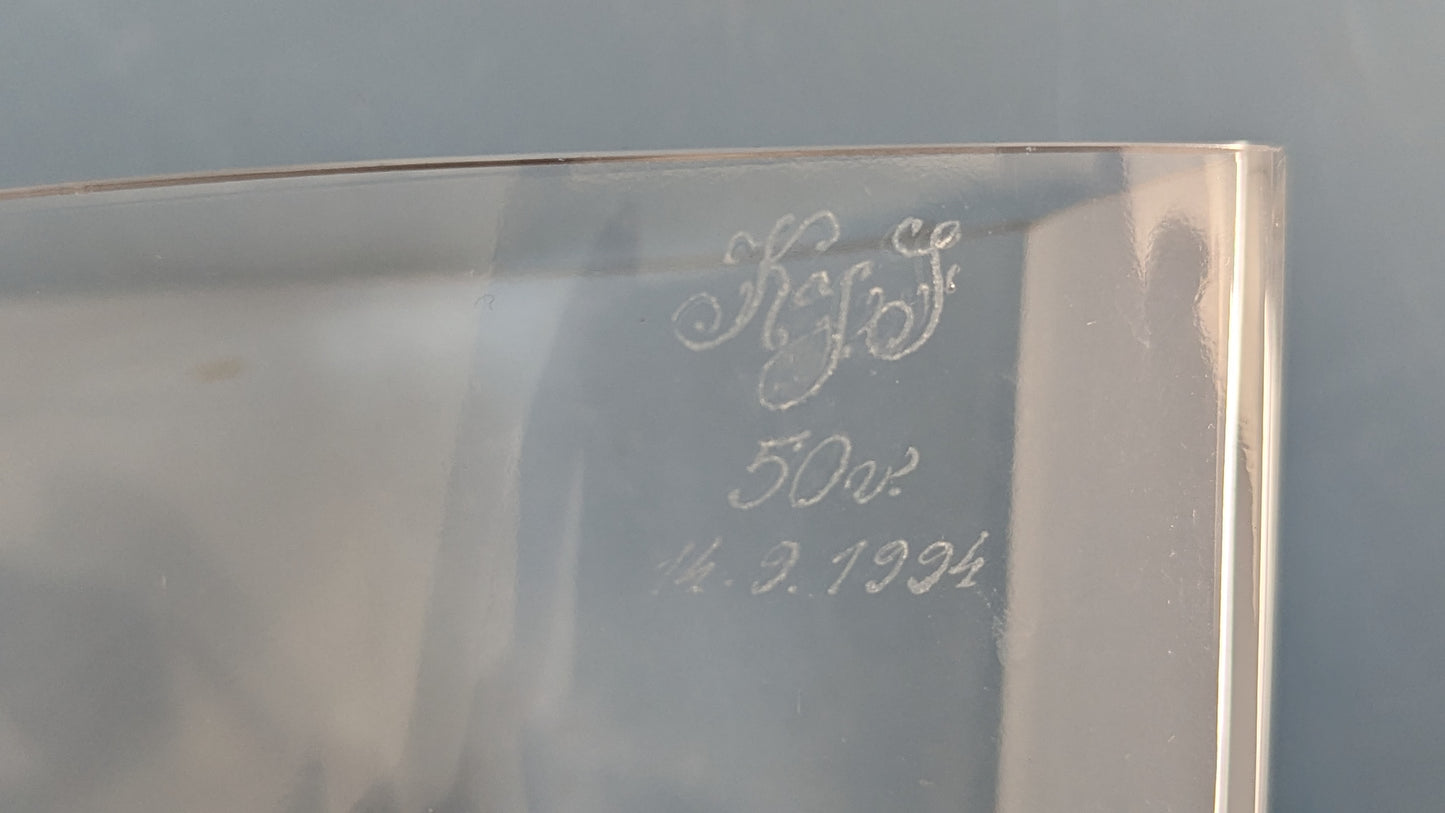 Ei iskemiä, halkeamia tai naarmuja mutta oikeassa yläkulmassa kaiverrus KJJ 50v 14.9.1994. Kaiverrus näkyy viimeisessä kuvassa.
