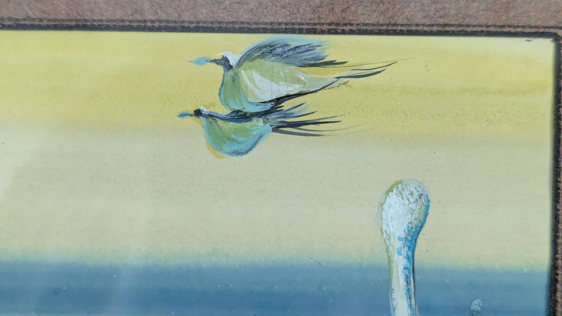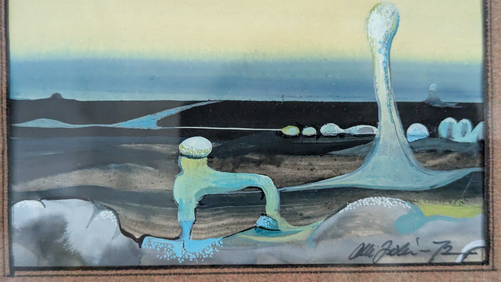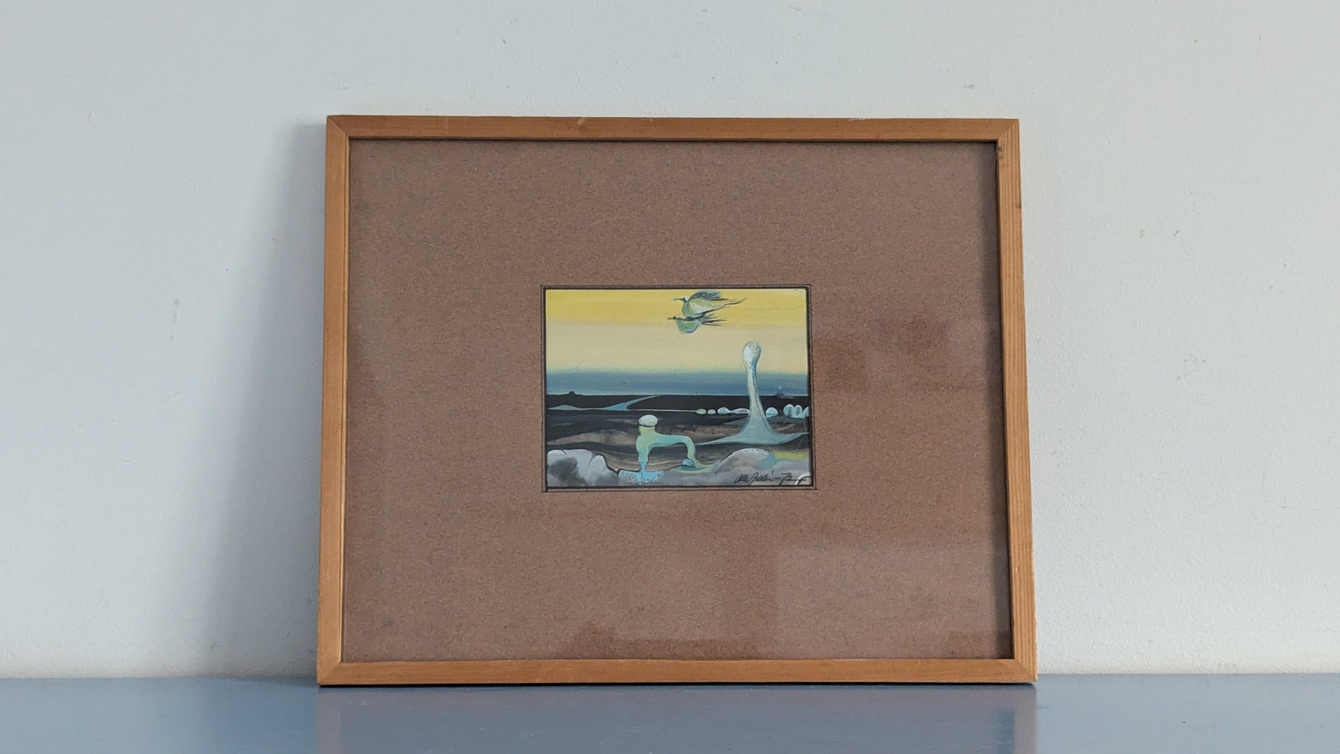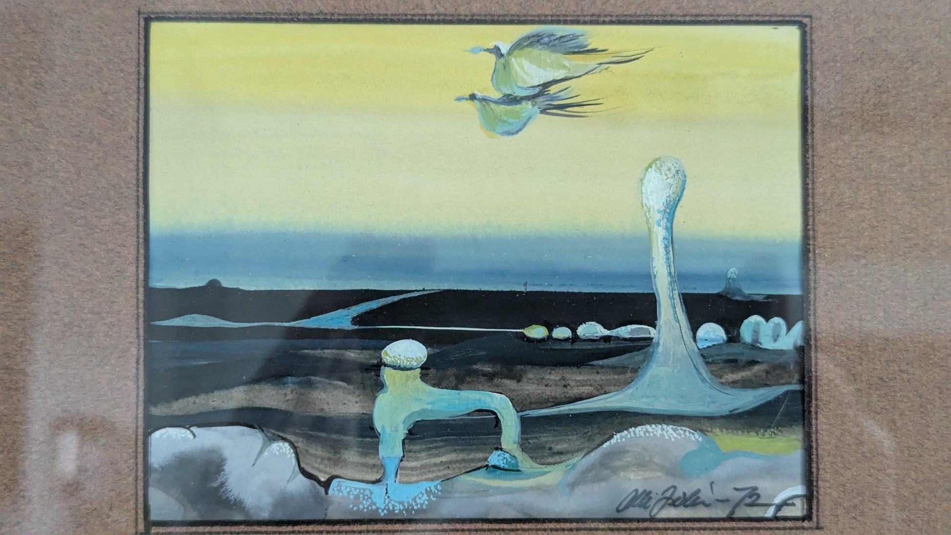Olli Joen signeeraama Valtatie 4:n Pesäpaikka niminen akvarellityö vuodelta 1972.