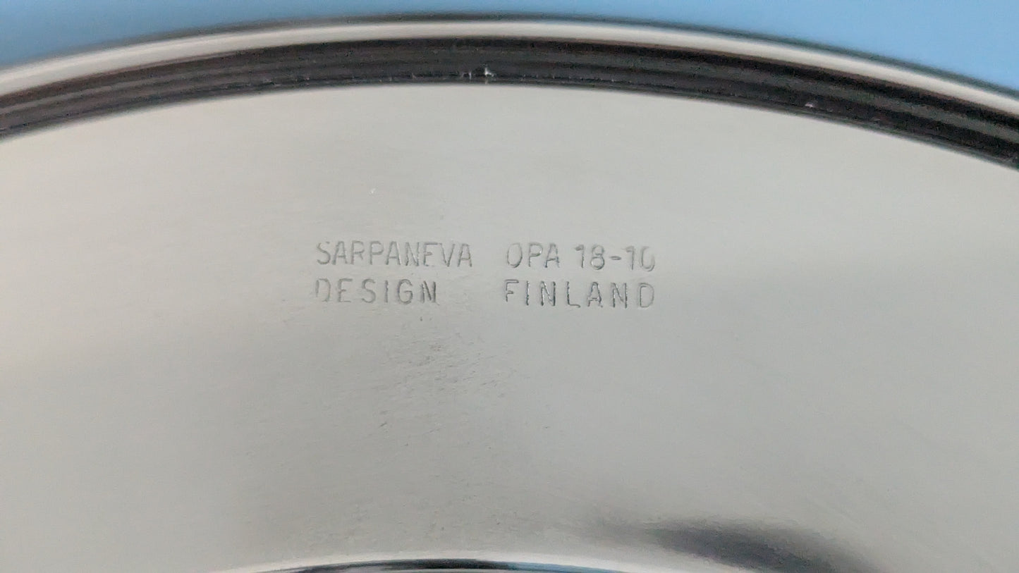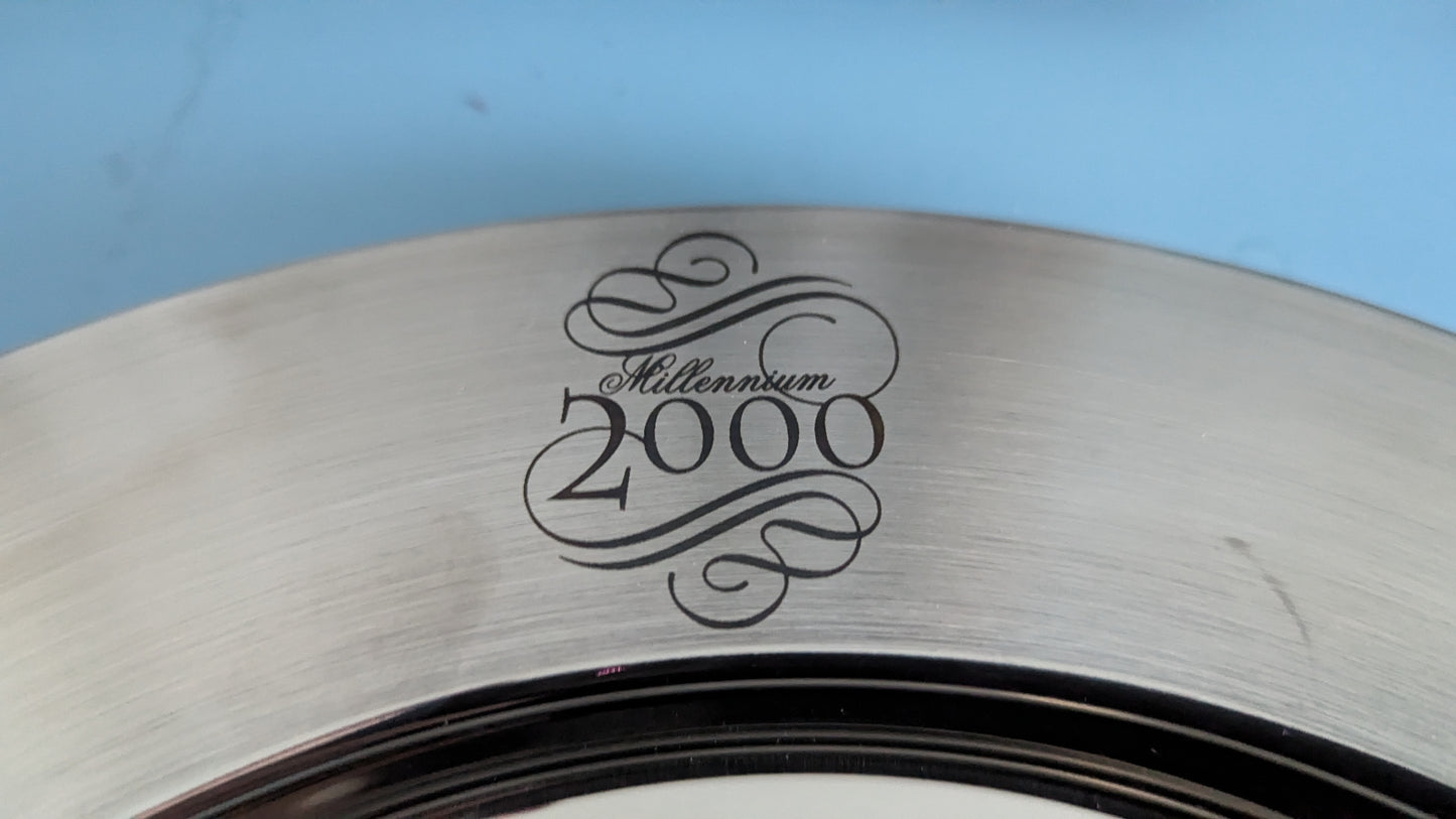 Lautasessa etupuolella monogrammietsaus Millennium 2000. Pohjapuolella teksti Sarpaneva Design Opa 18-16 Finland