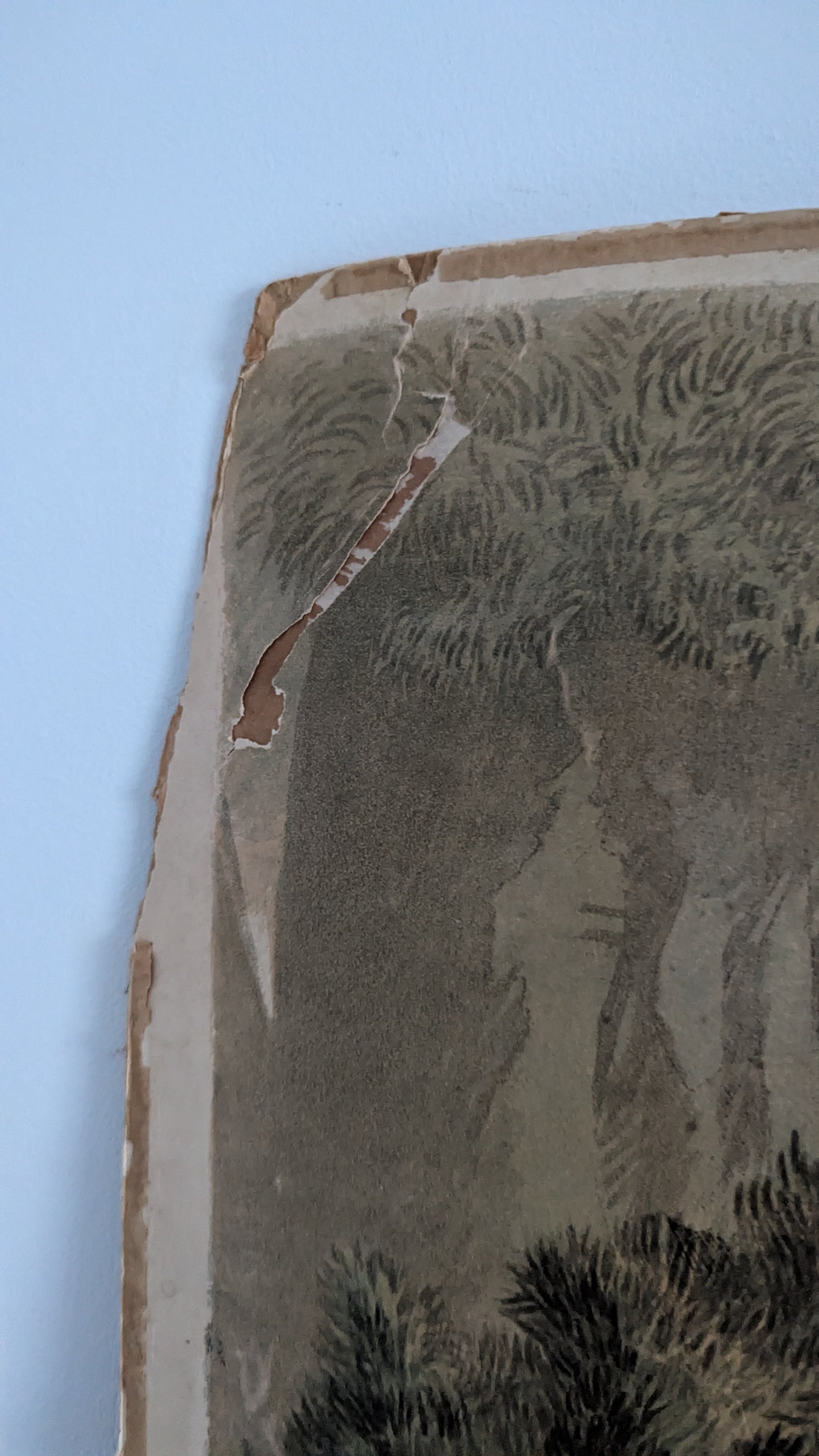 Kulmissa kulumaa ja taitosta. Vasemmasta yläkulmasta puuttuu viimeisen kuvan mukainen pala. Keskeltä kupera.