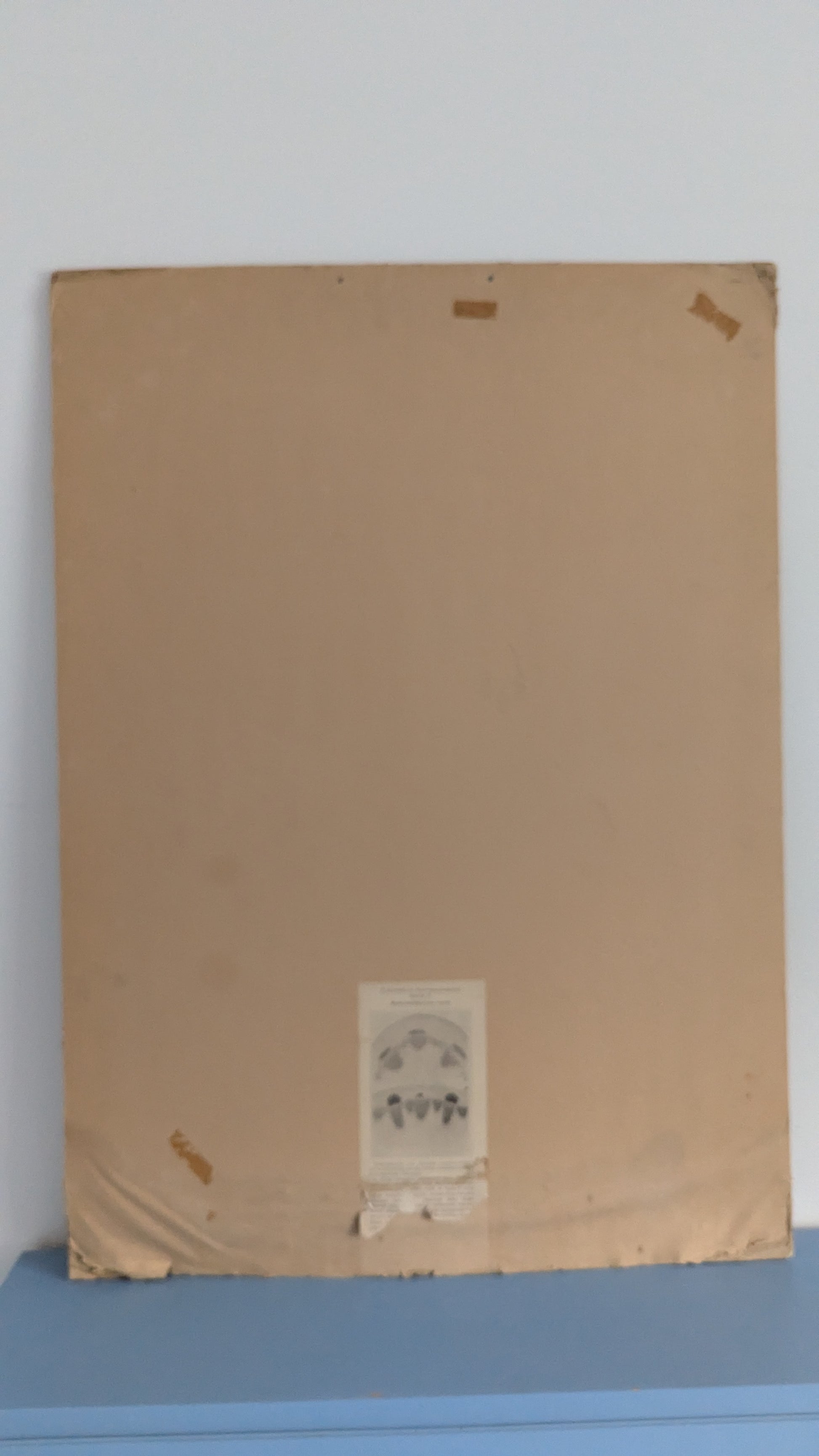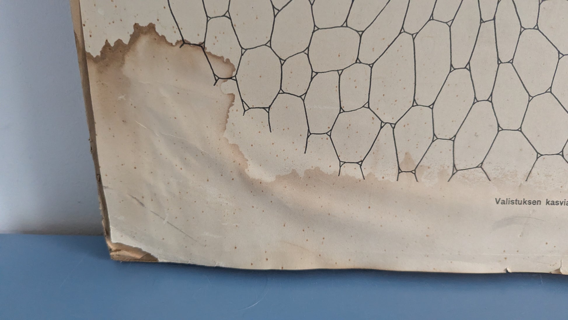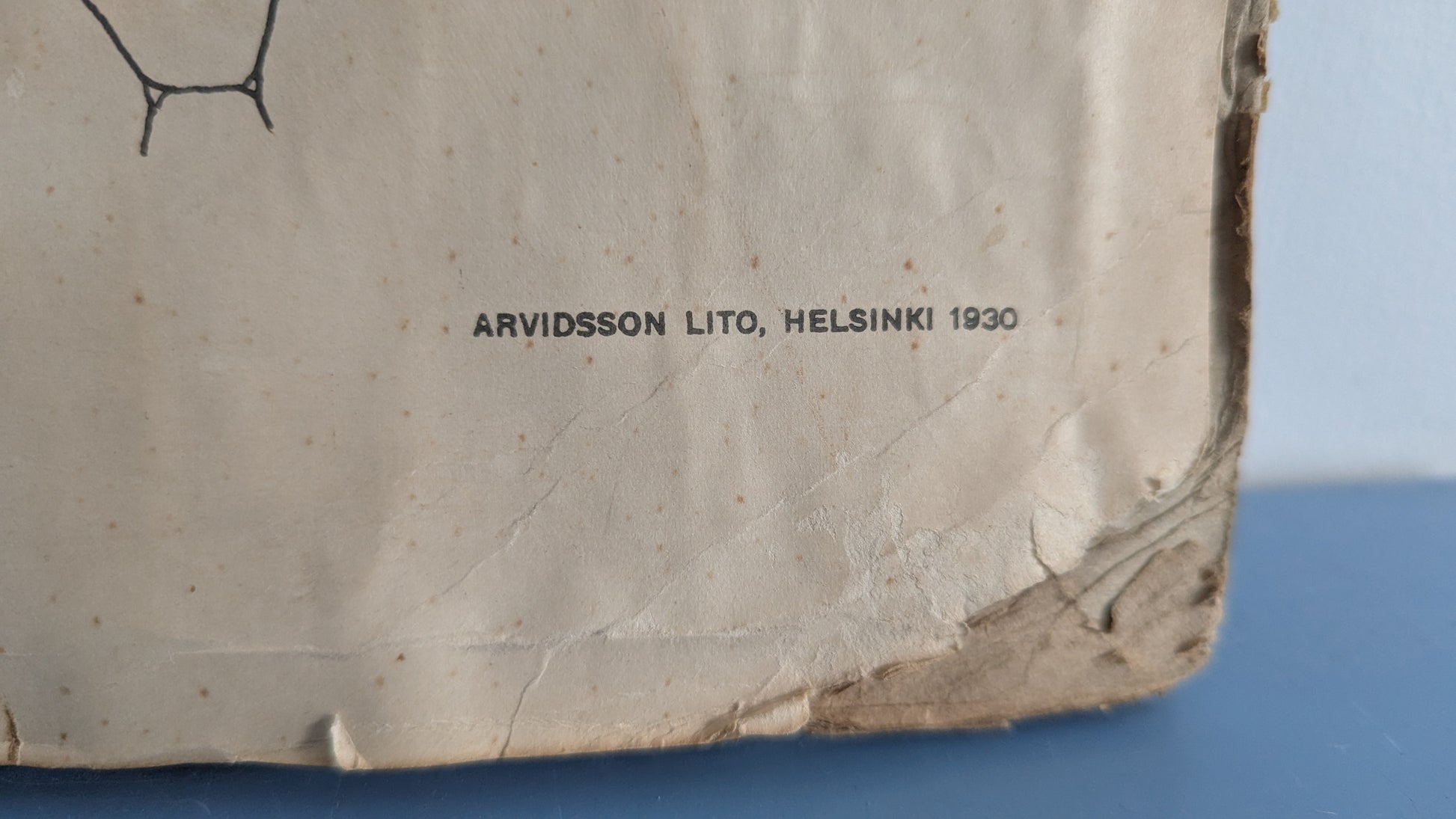 Ei halkeamia mutta alareuna ottanut joskus kosteutta, mikä näkyy kuvissa. Reunoissa kulumaa / taittumaa.