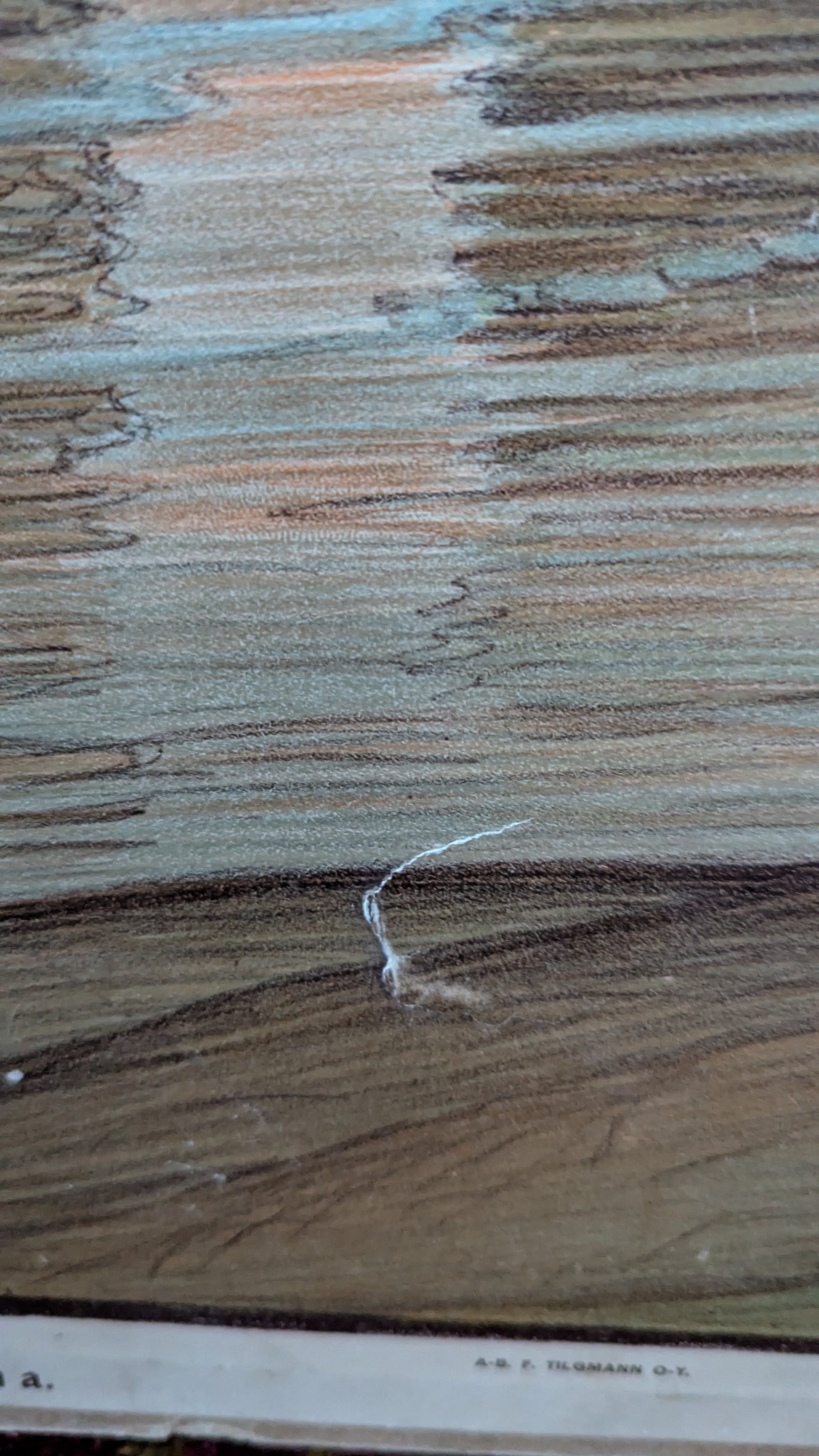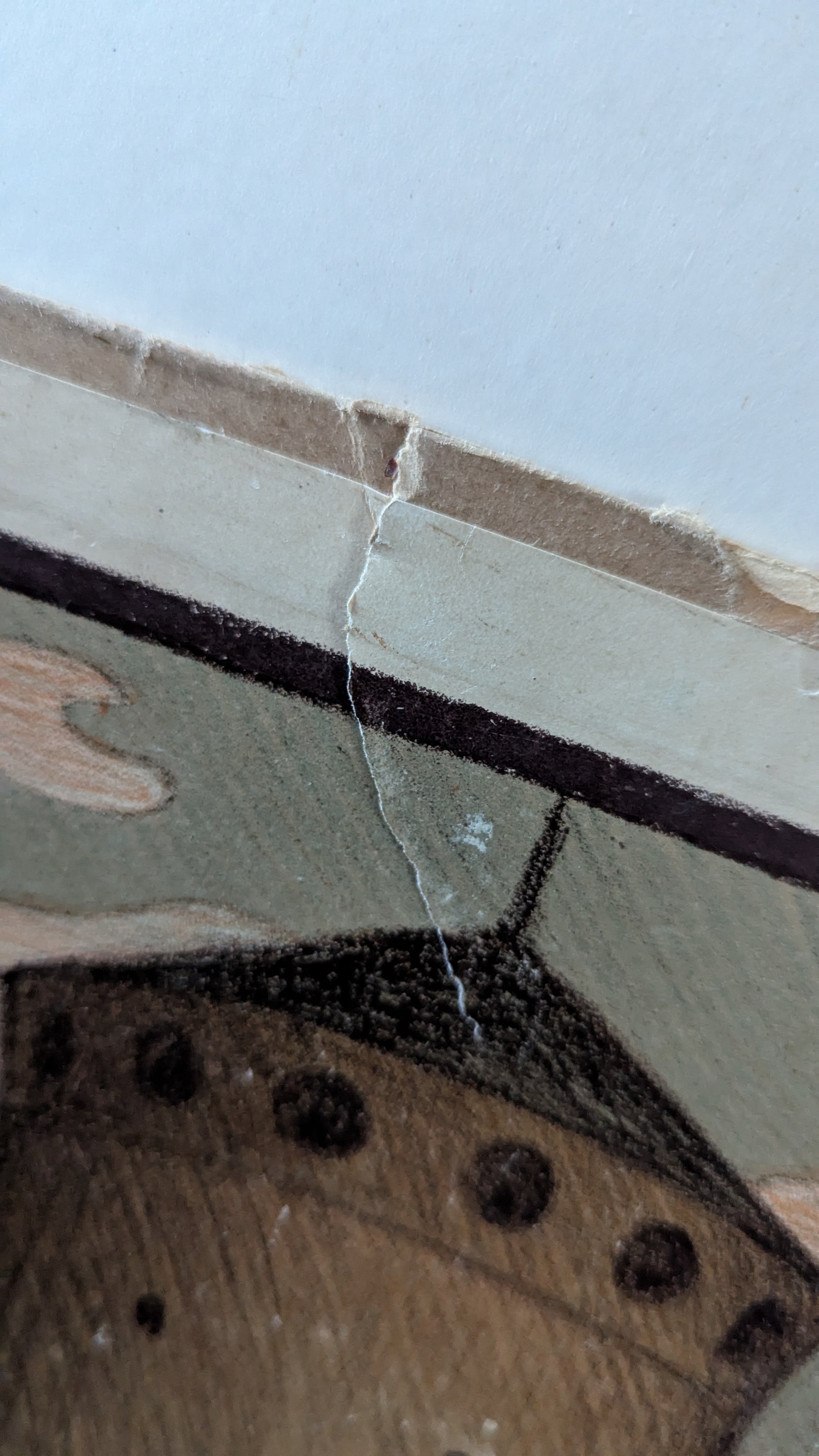 Yläreunassa ja alaosassa keskellä repeämät, mitkä näkyy kahdessa viimeisessä kuvassa. Oikeasta alanurkasta puuttuu kolmanneksi viimeisen kuvan mukainen palanen. Muuten nurkissa kulumaa. Hiukan kuprulla / kaareva.