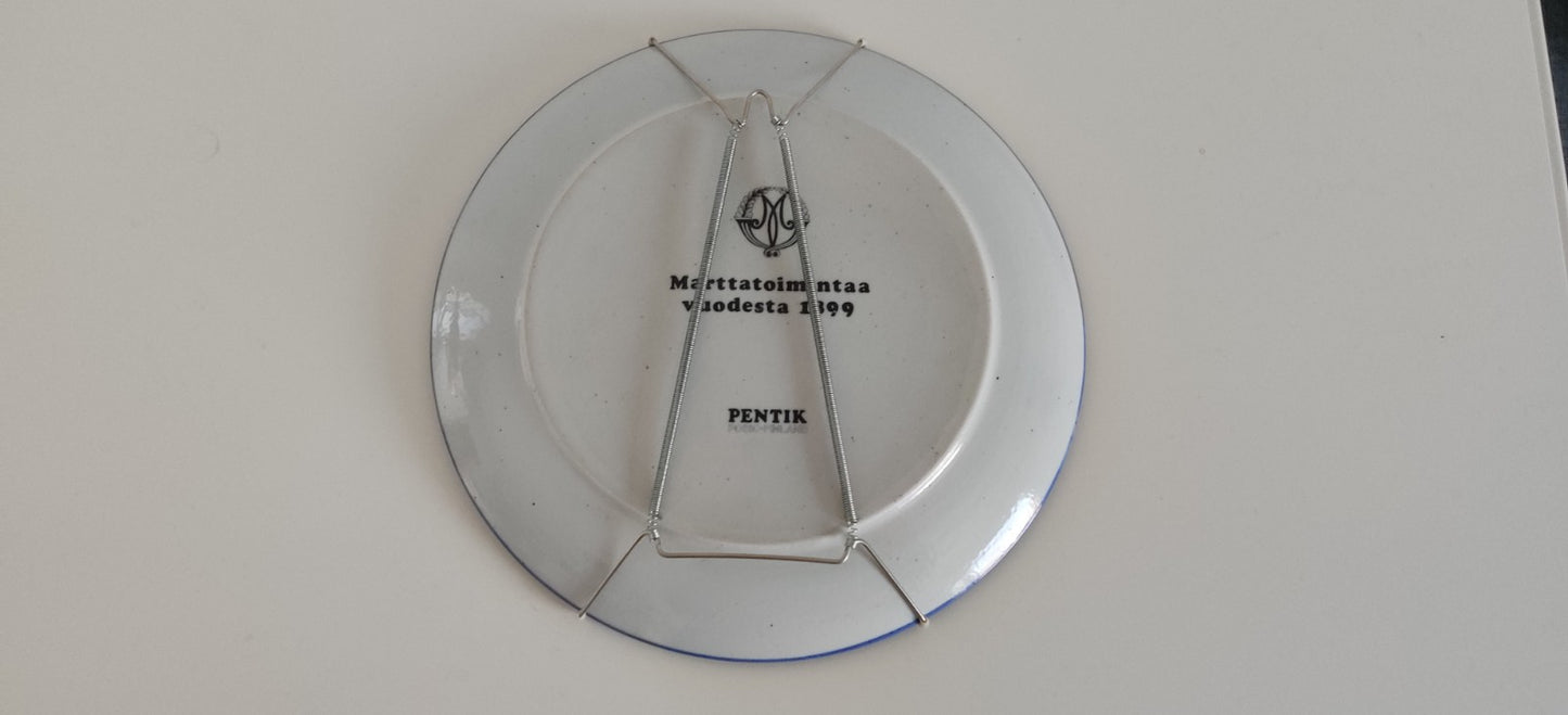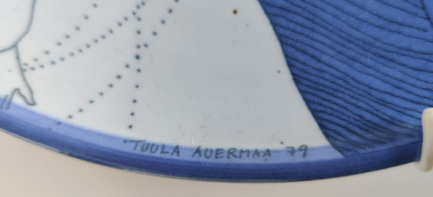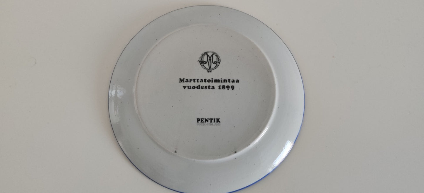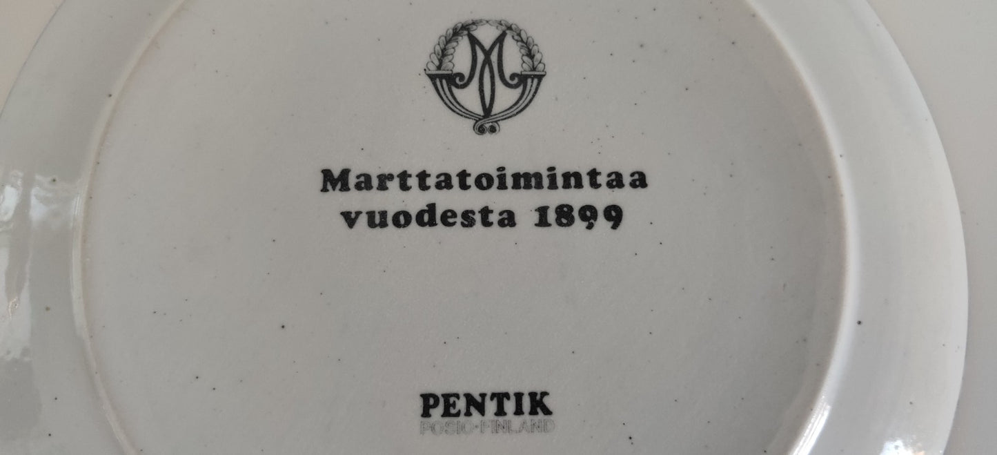 Etupuolella signeeraus Tuula Auermaa -79 ja Pentikin tarra. Takana Marttojen järjestötunnus sekä teksti Marttatoimintaa 1899 ja Pentik Posio Finland.