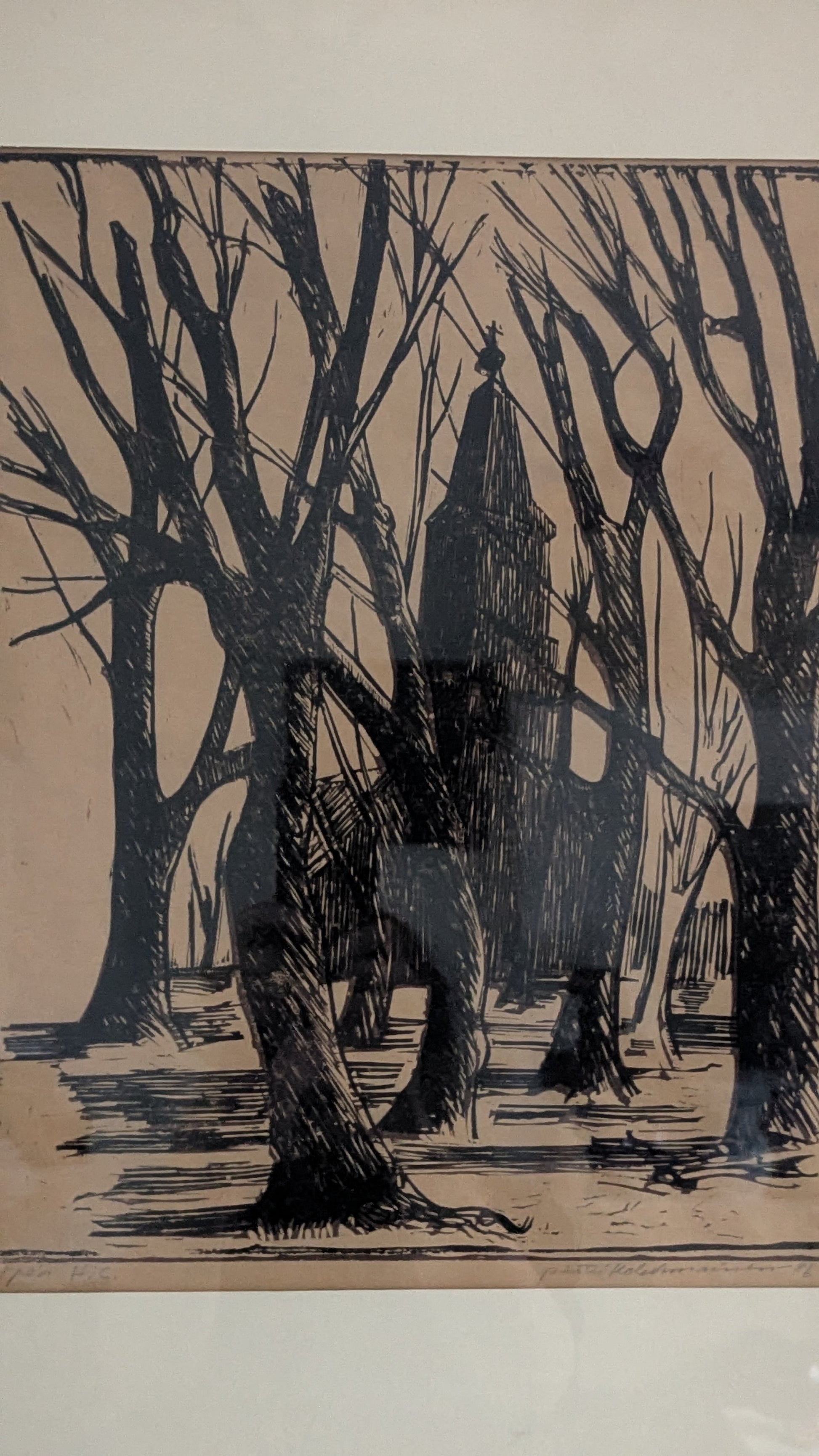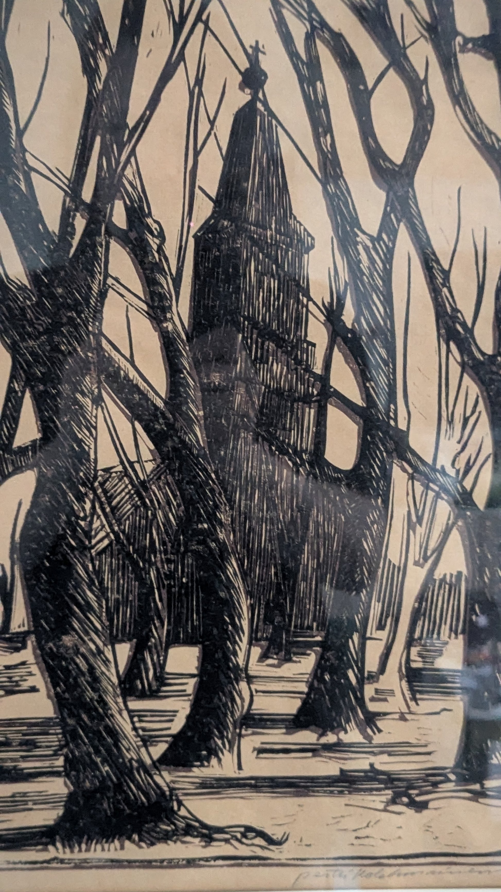 Pertti Kolehmaisen signeeraama puupiirros vuodelta 1986.