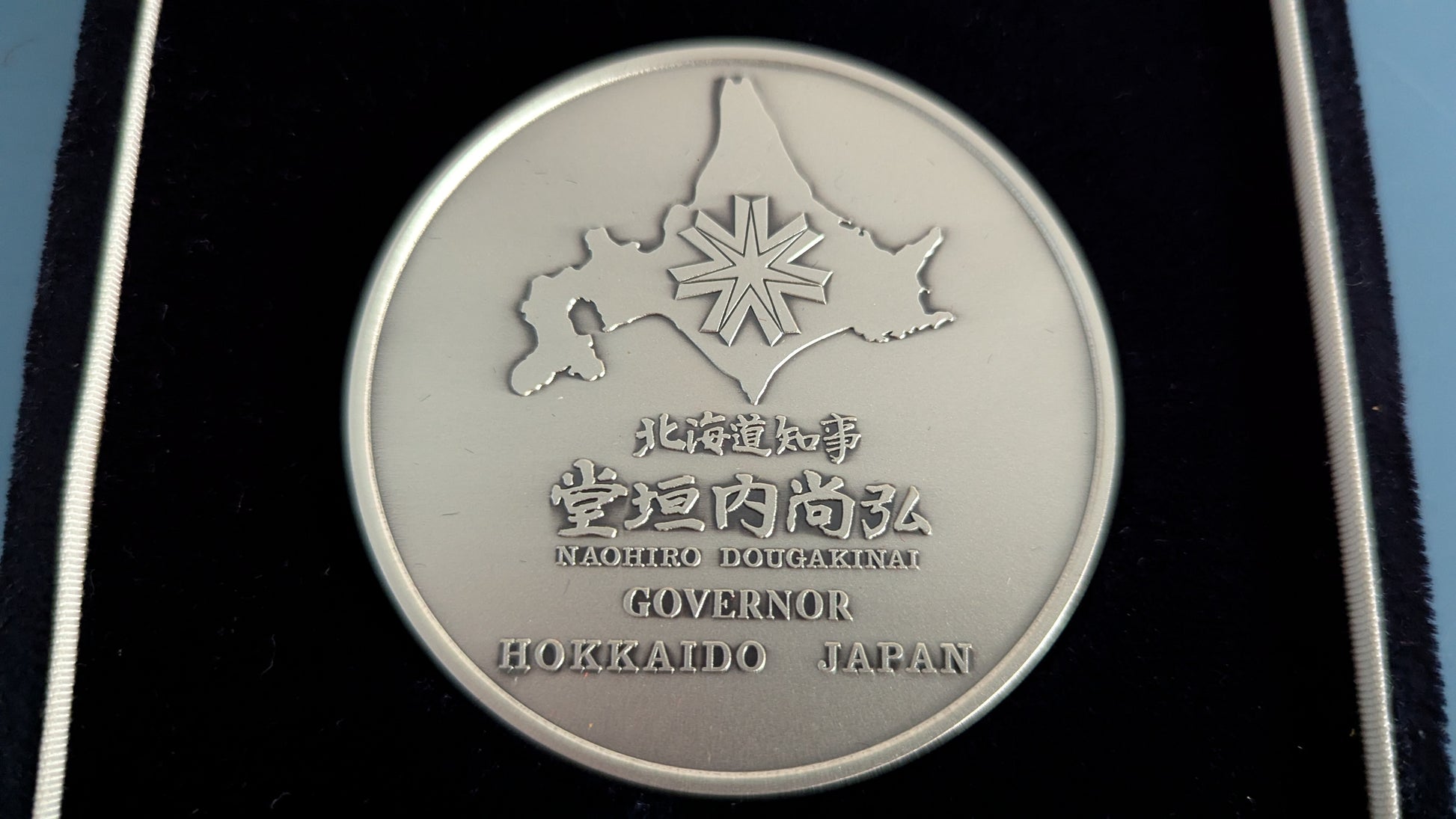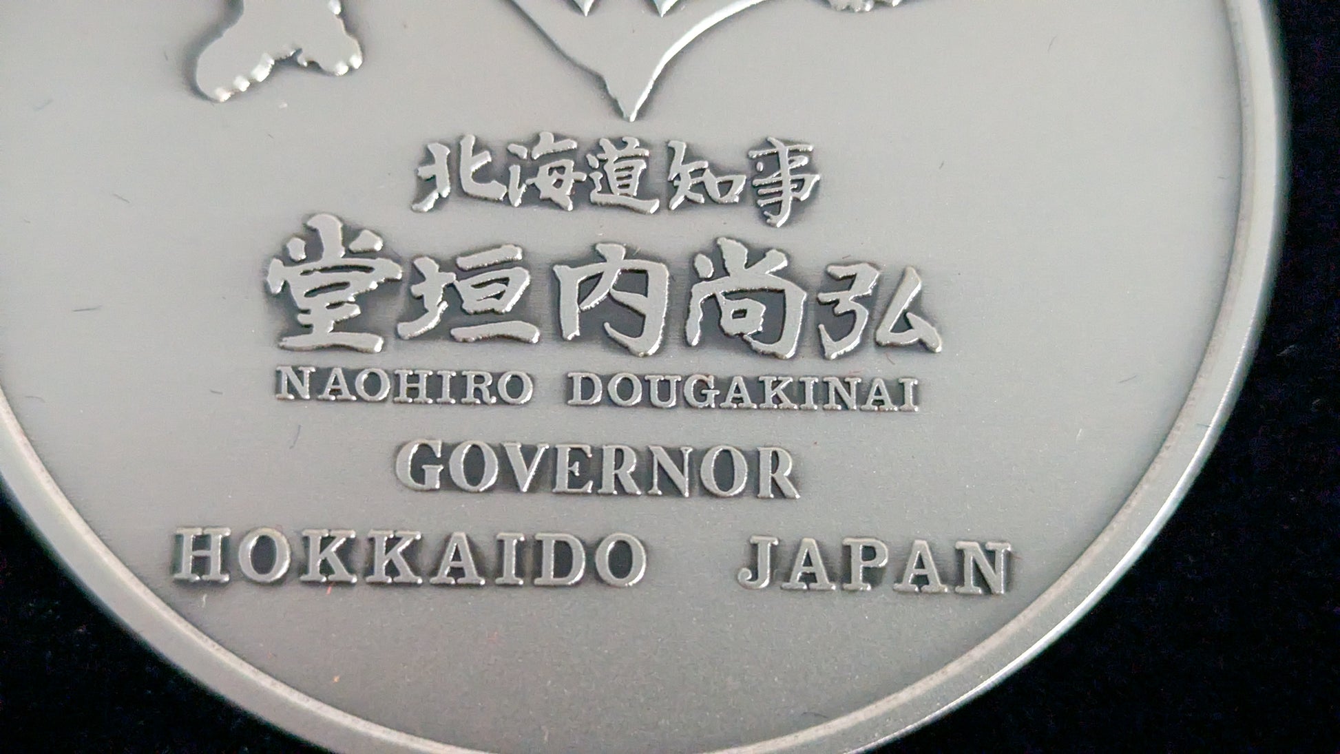 Toisella puolella Hokkaidon saaren ääriviivat ja sen symboli sekä japaniksi ja englanniksi tekstit Hokkaidon kuvernööri Naohiro Dougakinai Japan.