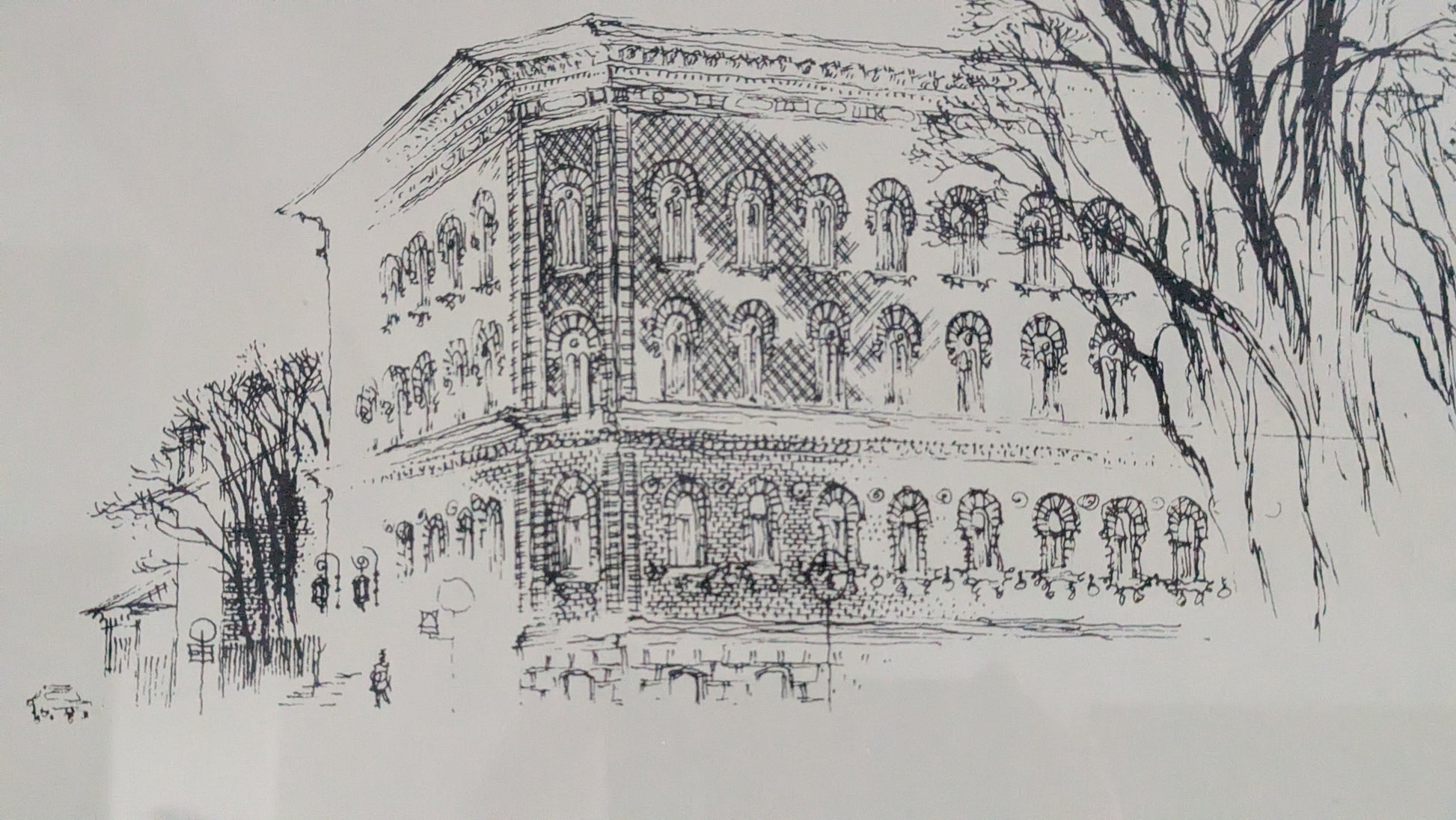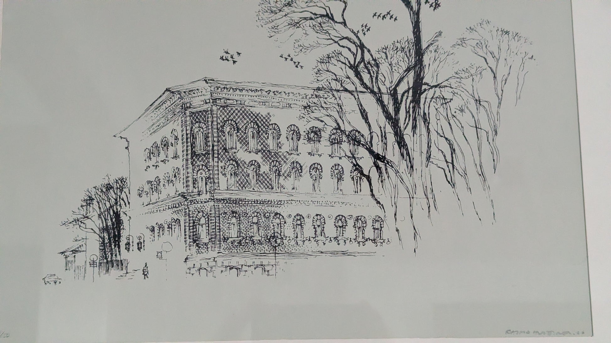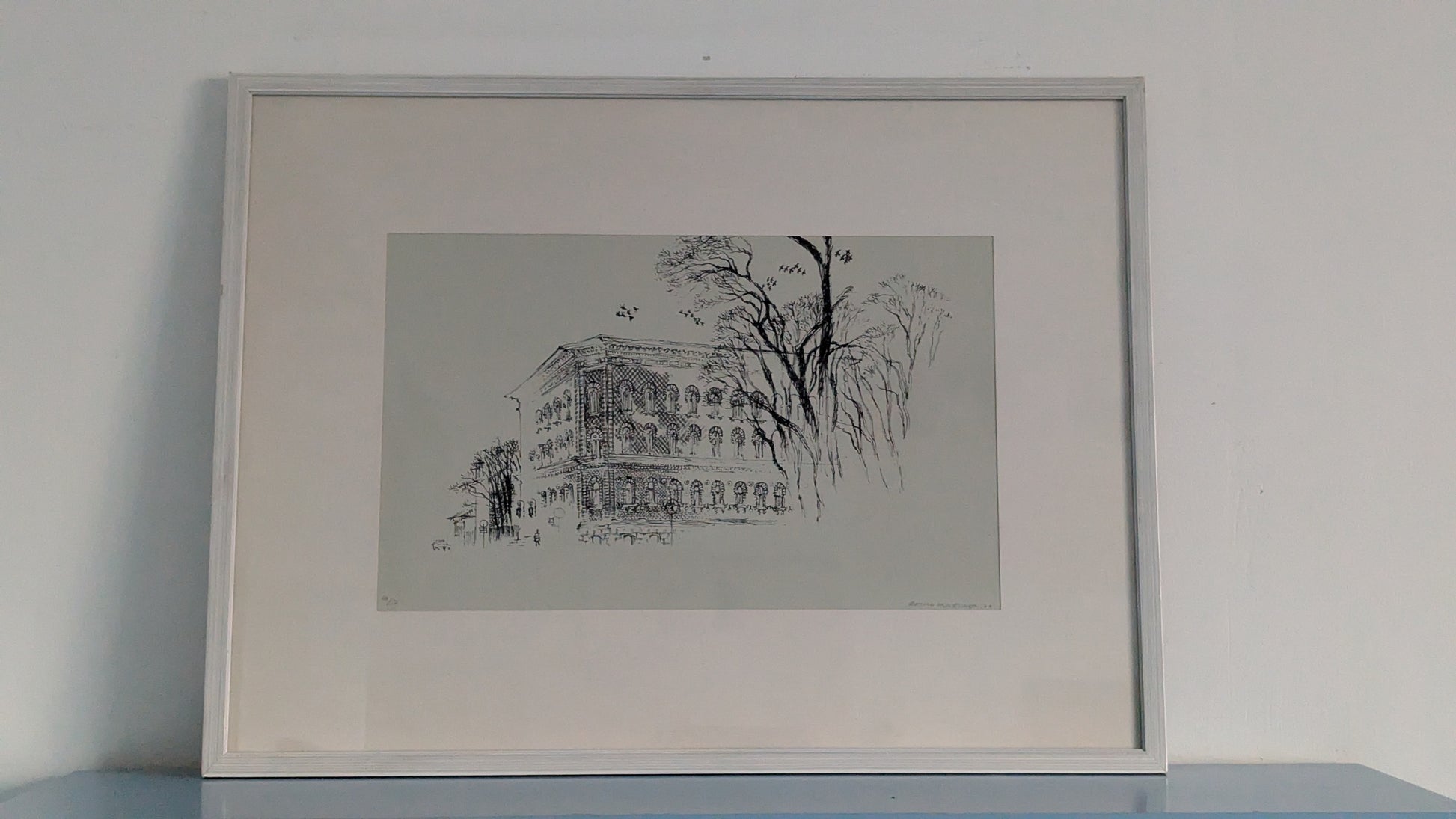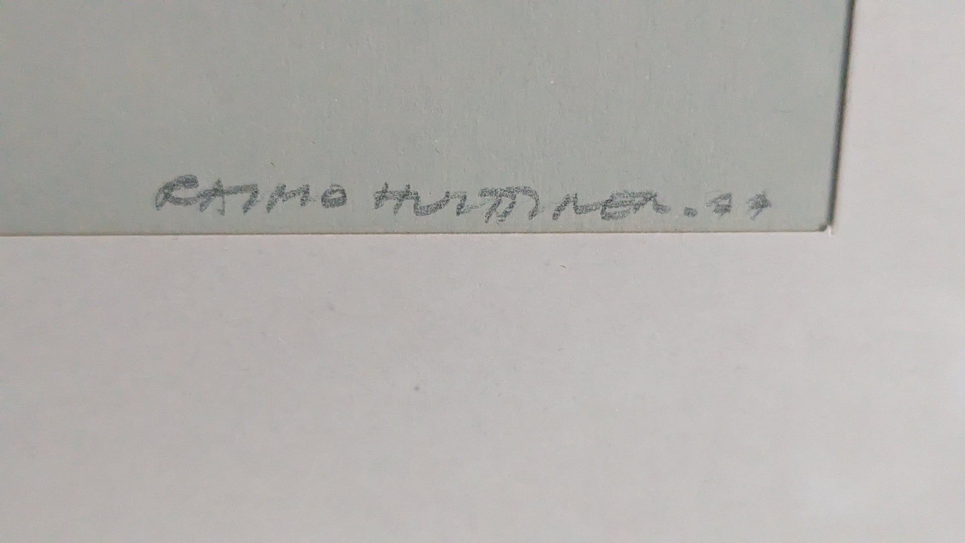 Raimo Huittisen signeeraama Porin kaupungintalo aiheinen grafiikka vuodelta 1977.