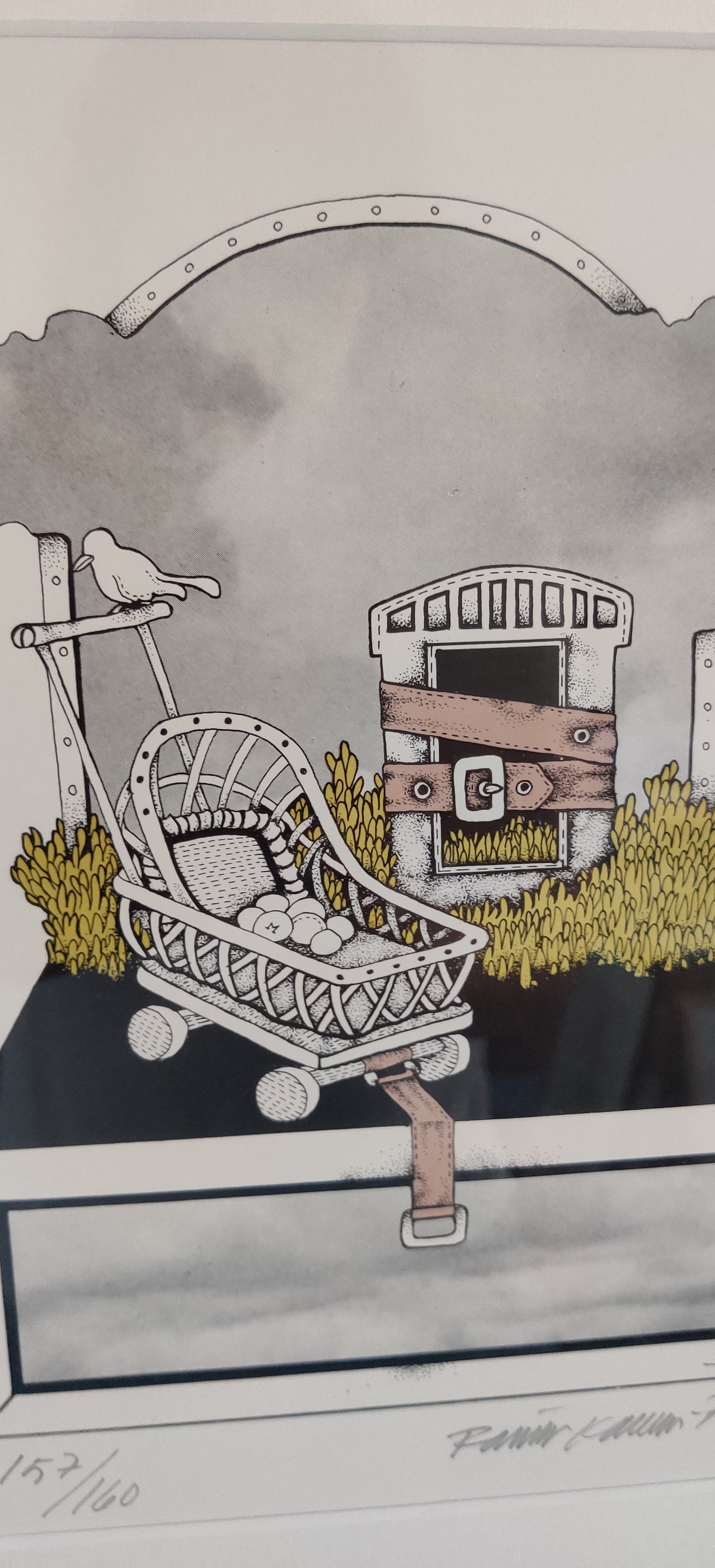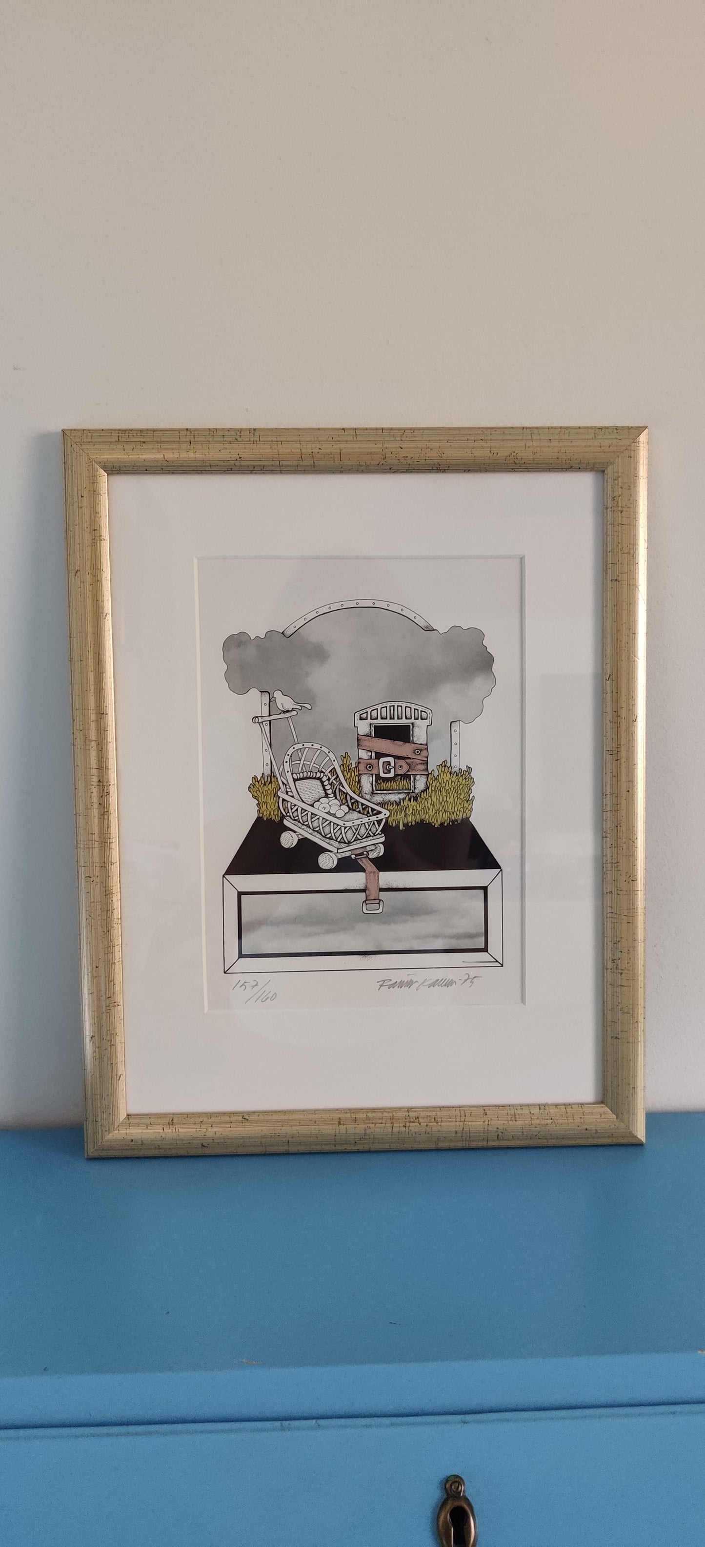 Teoksen alla numerointi 157/160 sekä taiteilijan signeeraus ja vuosiluku -75.
