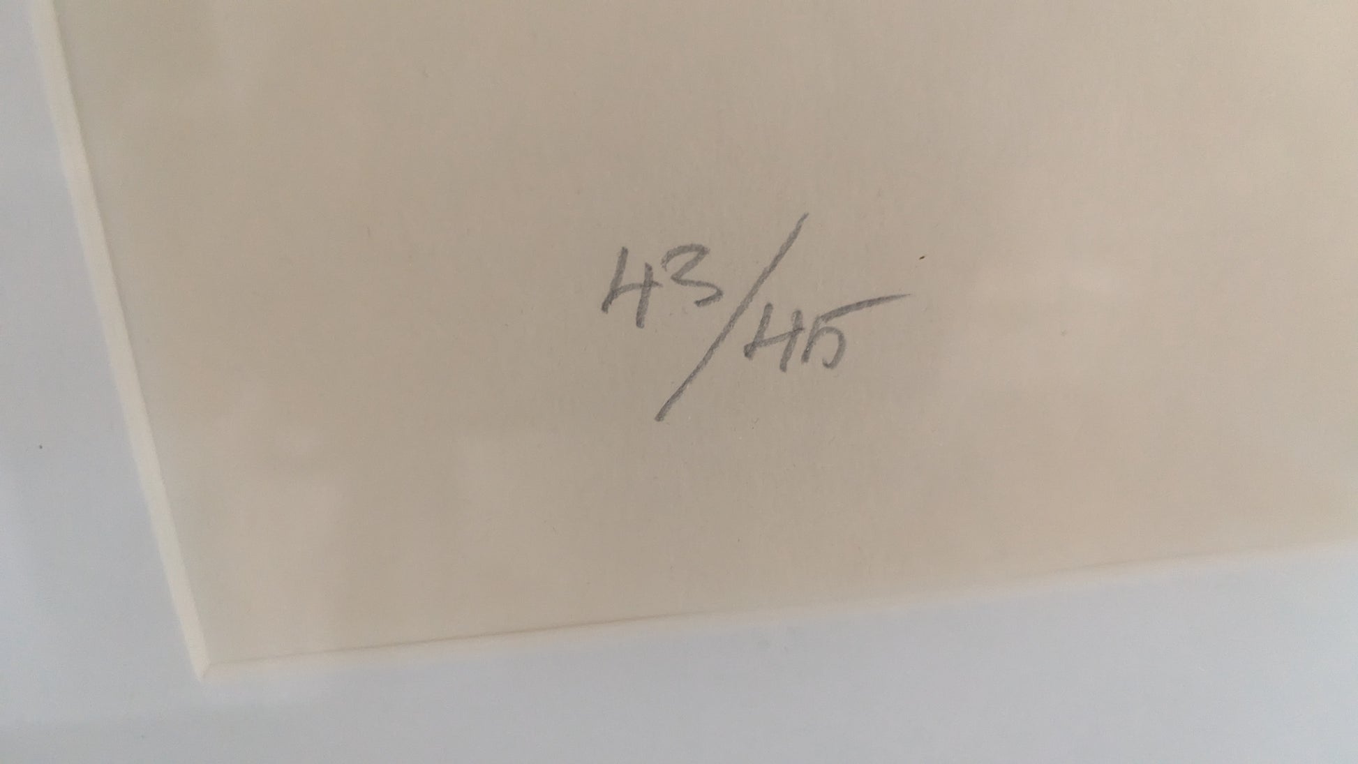 Teoksen alla numerointi 43/45 sekä taiteilijan signeeraus ja vuosi -81.