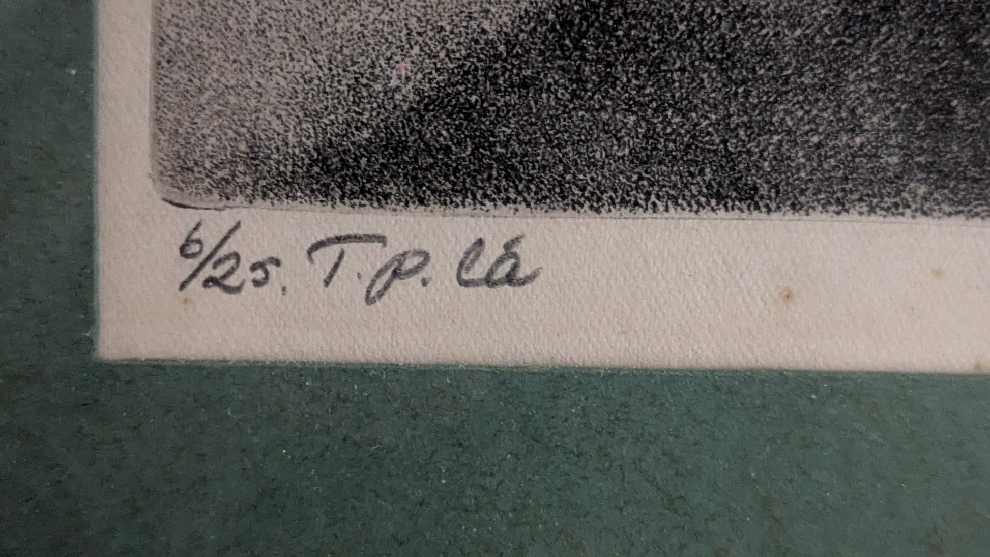 Teoksen alla vedosmerkintä Tpl'a eli kyseessä taiteilijan itsensä tekemä vedos. Lisäksi numerointi 6/25, teoksen nimi, taiteilijan signeeraus ja vuosiluku -72.