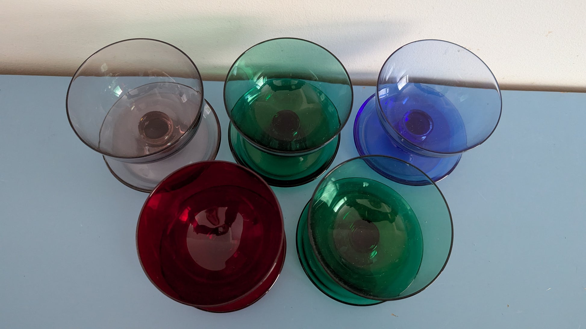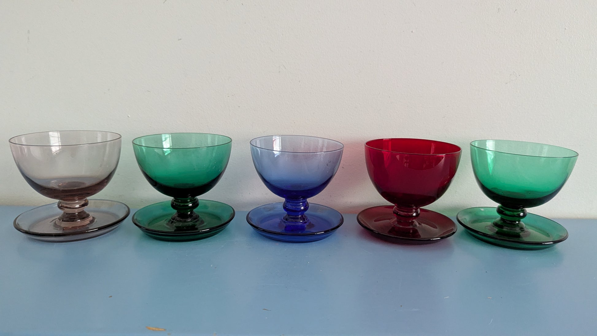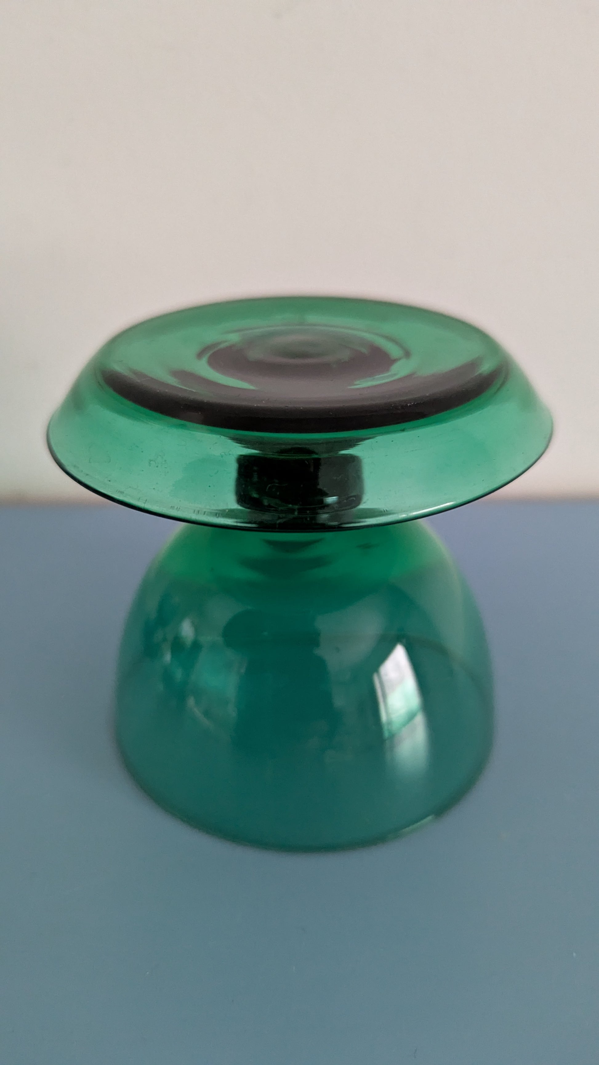 Ei halkeamia tai iskemiä. Käyttökulumaa ei ole tai se on minimaalista. Toisen vihreän kulhon jalan sisällä 8mm ilmakupla, mikä näkyy viimeisessä kuvassa.