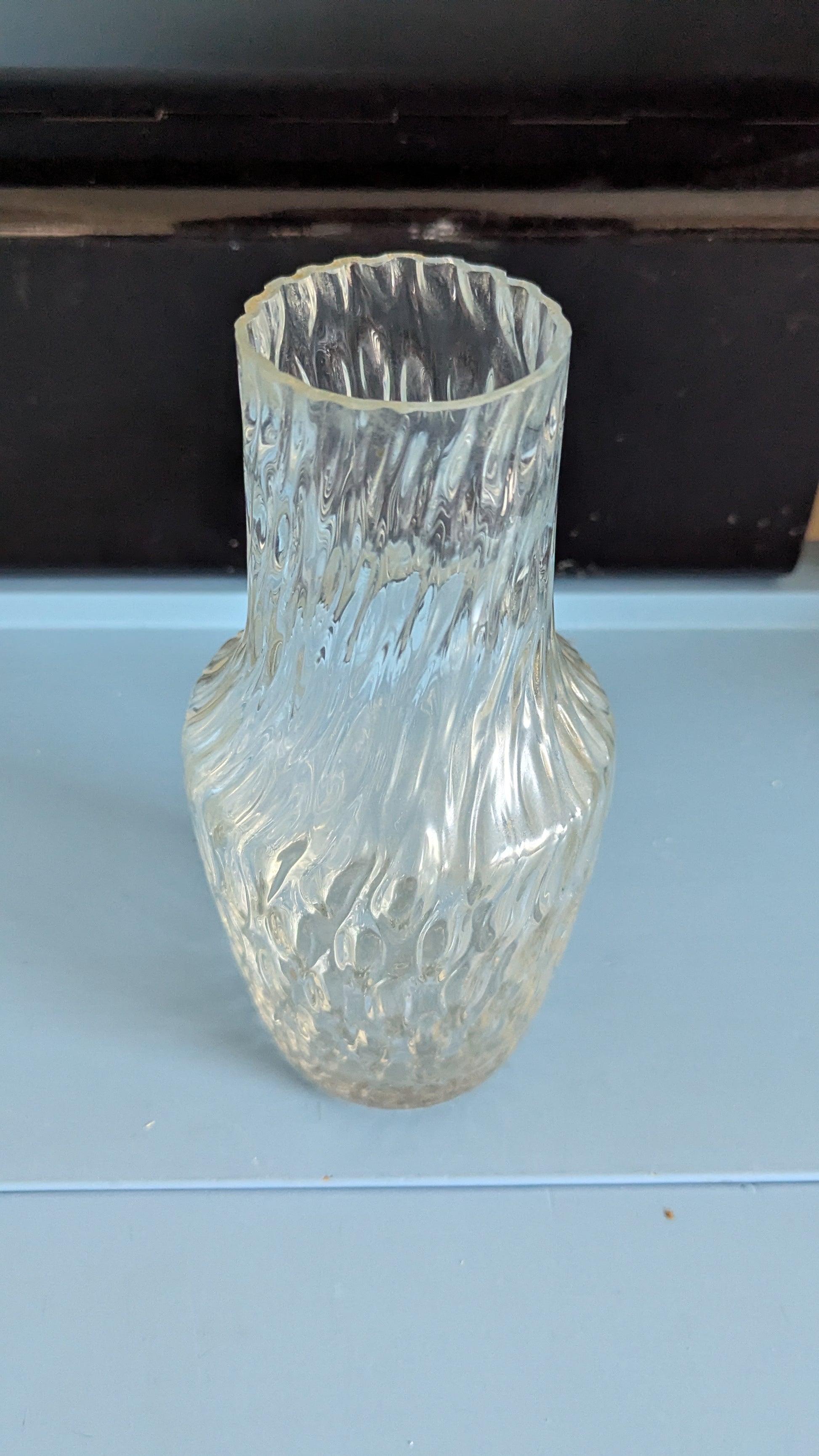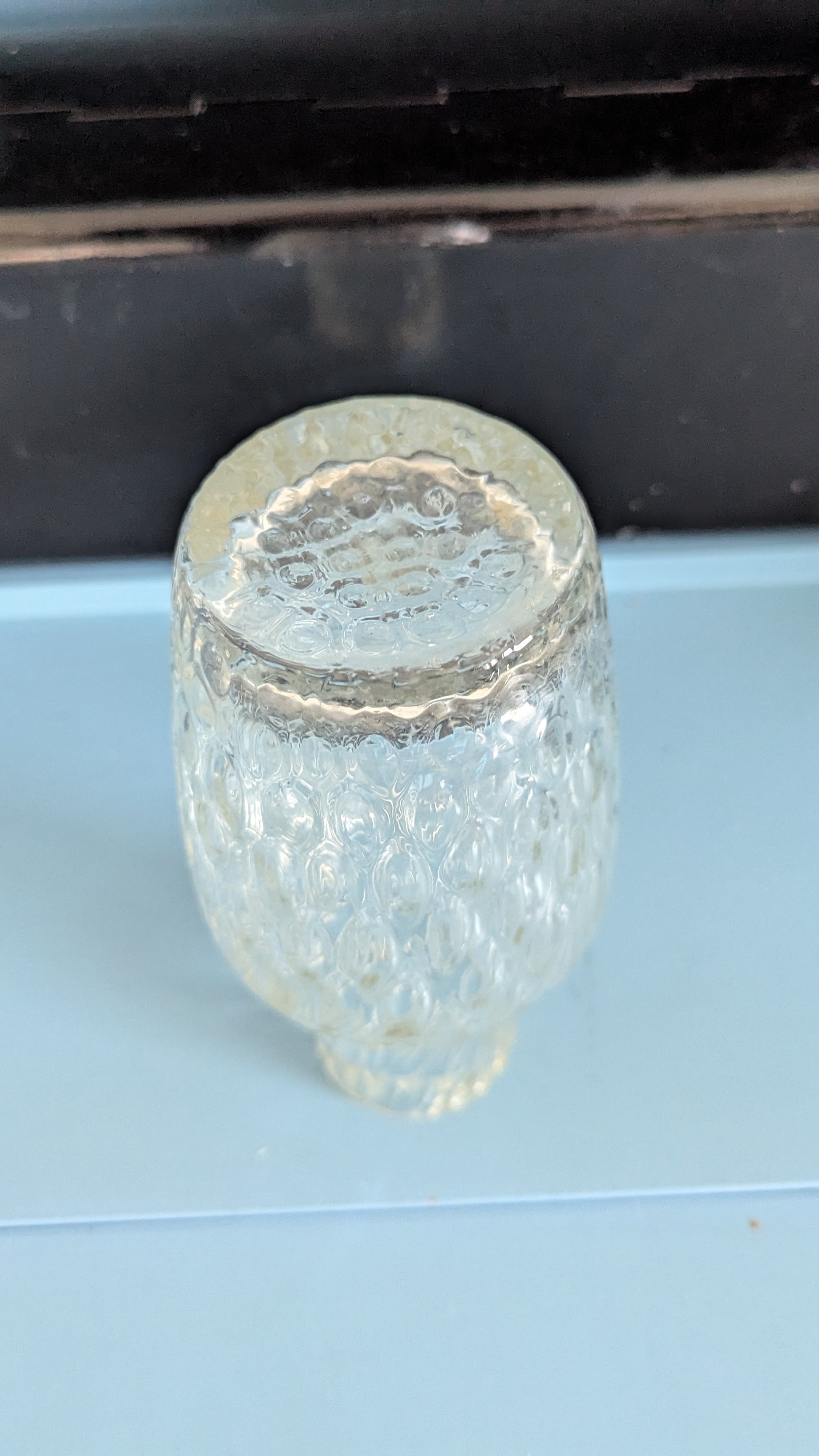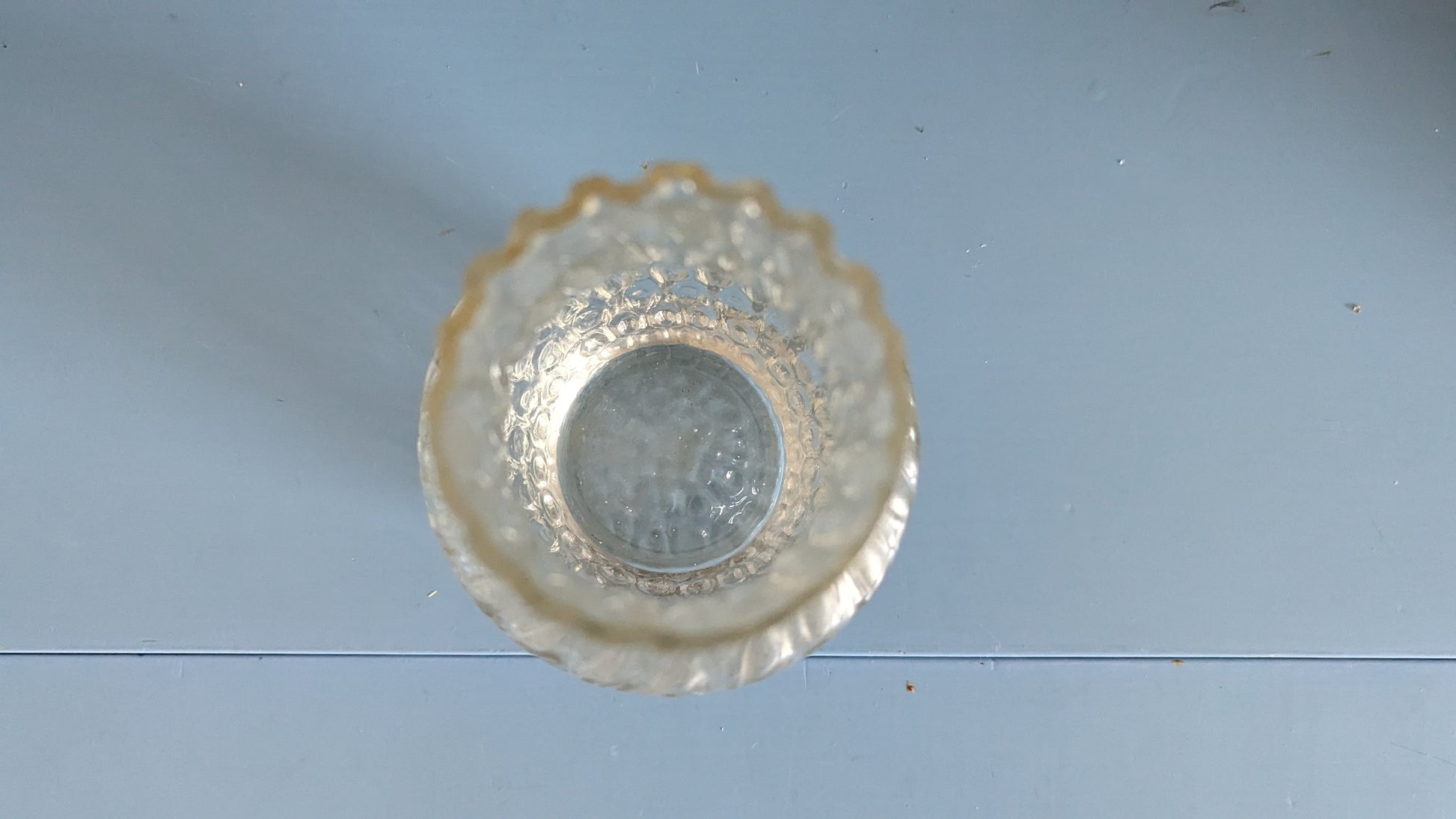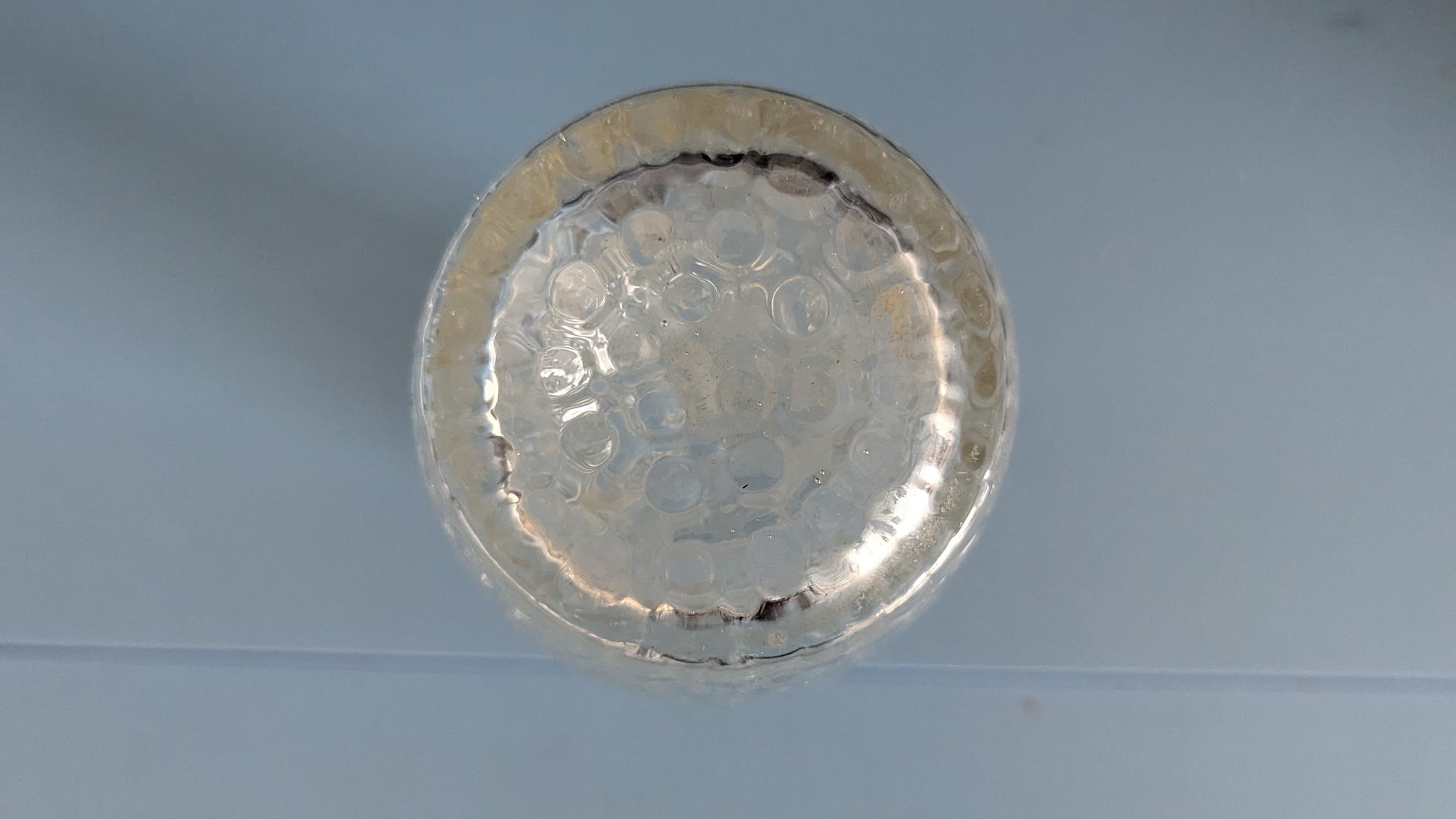 Ei iskemiä tai halkeamia. Pohjassa naarmua siirtelystä. Pohjalla hieman sameutta.