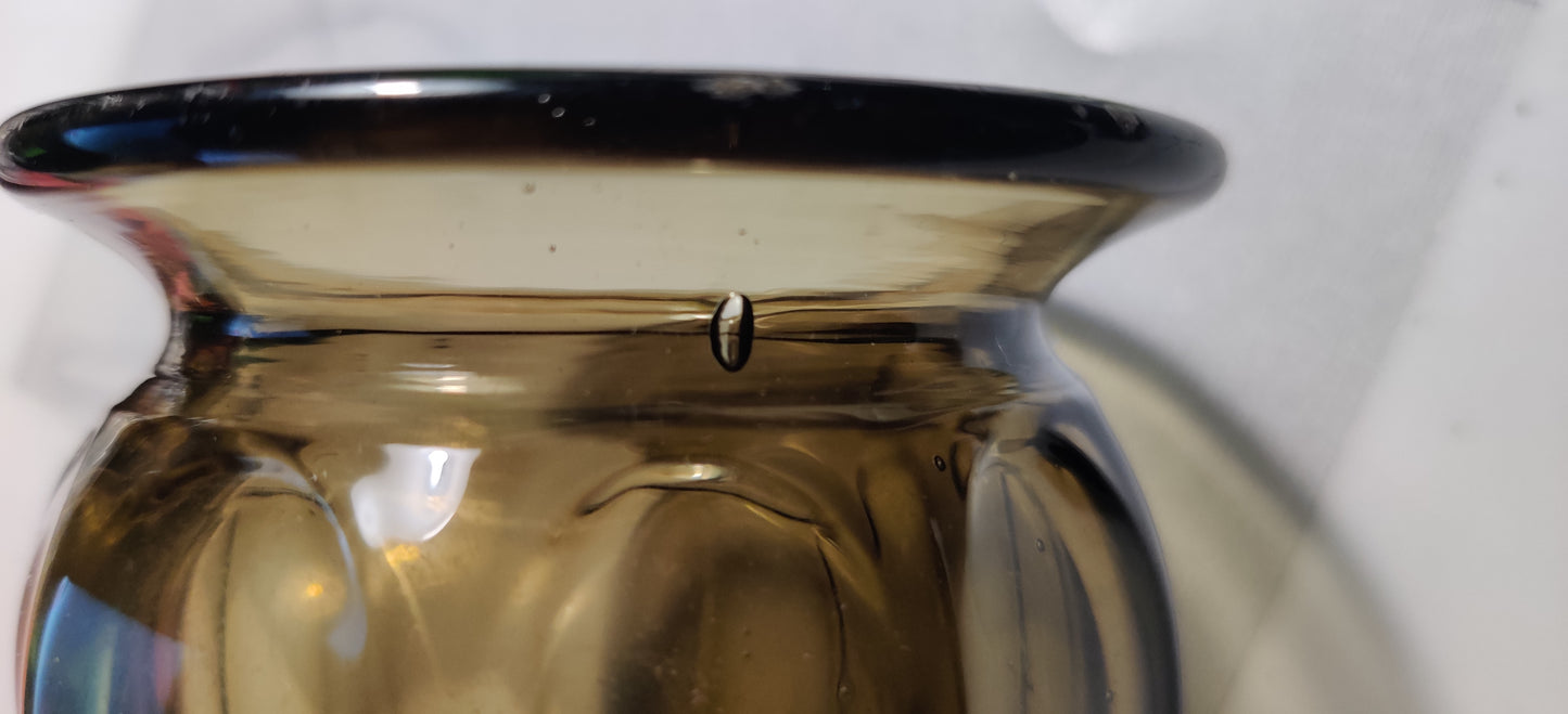 Ei halkeamia. Naarmuja lähinnä pohjassa siirtelystä. Lasimassan sisään jäänyt muutama ilmakupla mistä isoin näkyy toiseksi viimeisessä kuvassa. Kyljessä pieni noin millin kokoinen iskemä minkä yritin saada viimeiseen kuvaan.