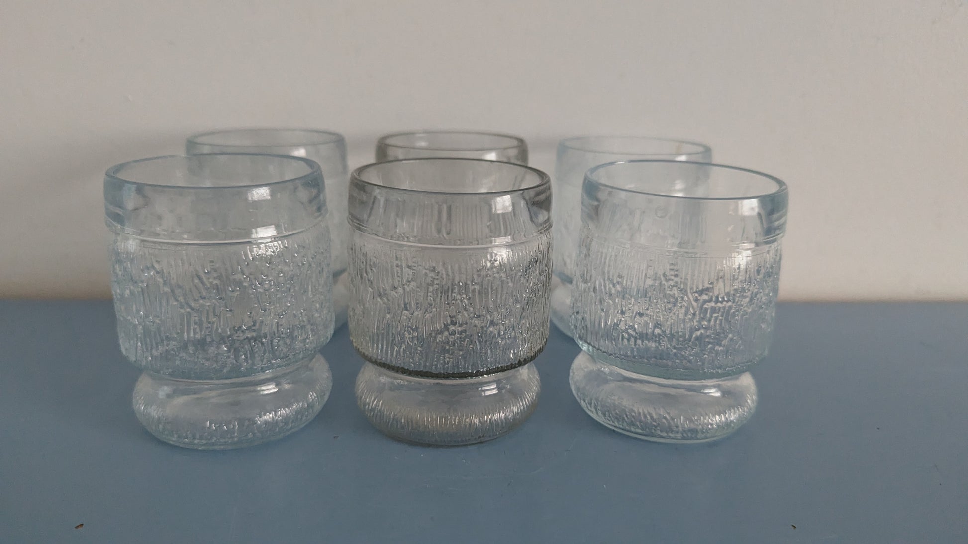 Ei halkeamia. Yhdessä lasissa ei iskemiä / karheumaa. Muissa laseissa yläreunassa joko iskemä tai/ja karheumaa. Vaihtelevaa käyttökulumaa. Kaksi lasia sävyiltään tummempia kuin muut.