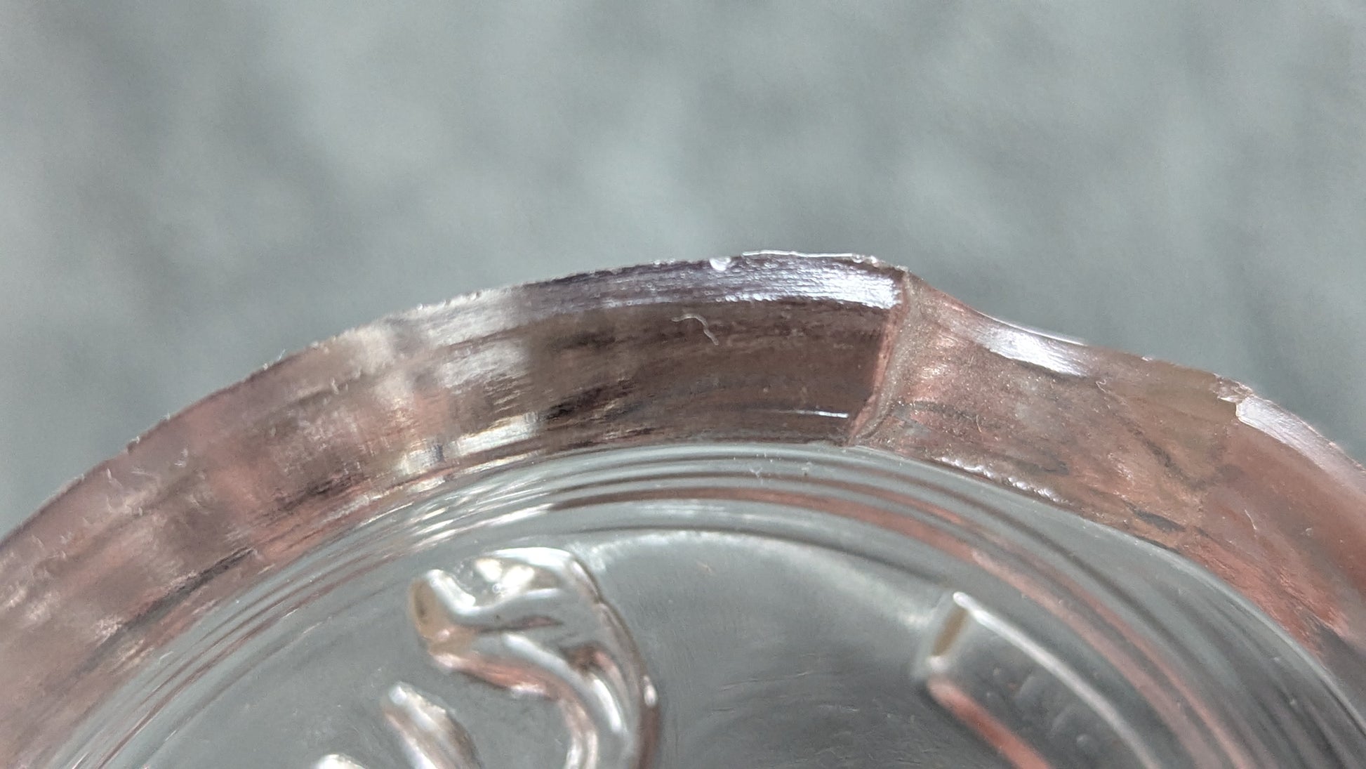 Ei halkeamia. Vähäistä käyttökulumaa. Ulkoreunassa minimaalista iskemää, mikä tuntuu sormella.
